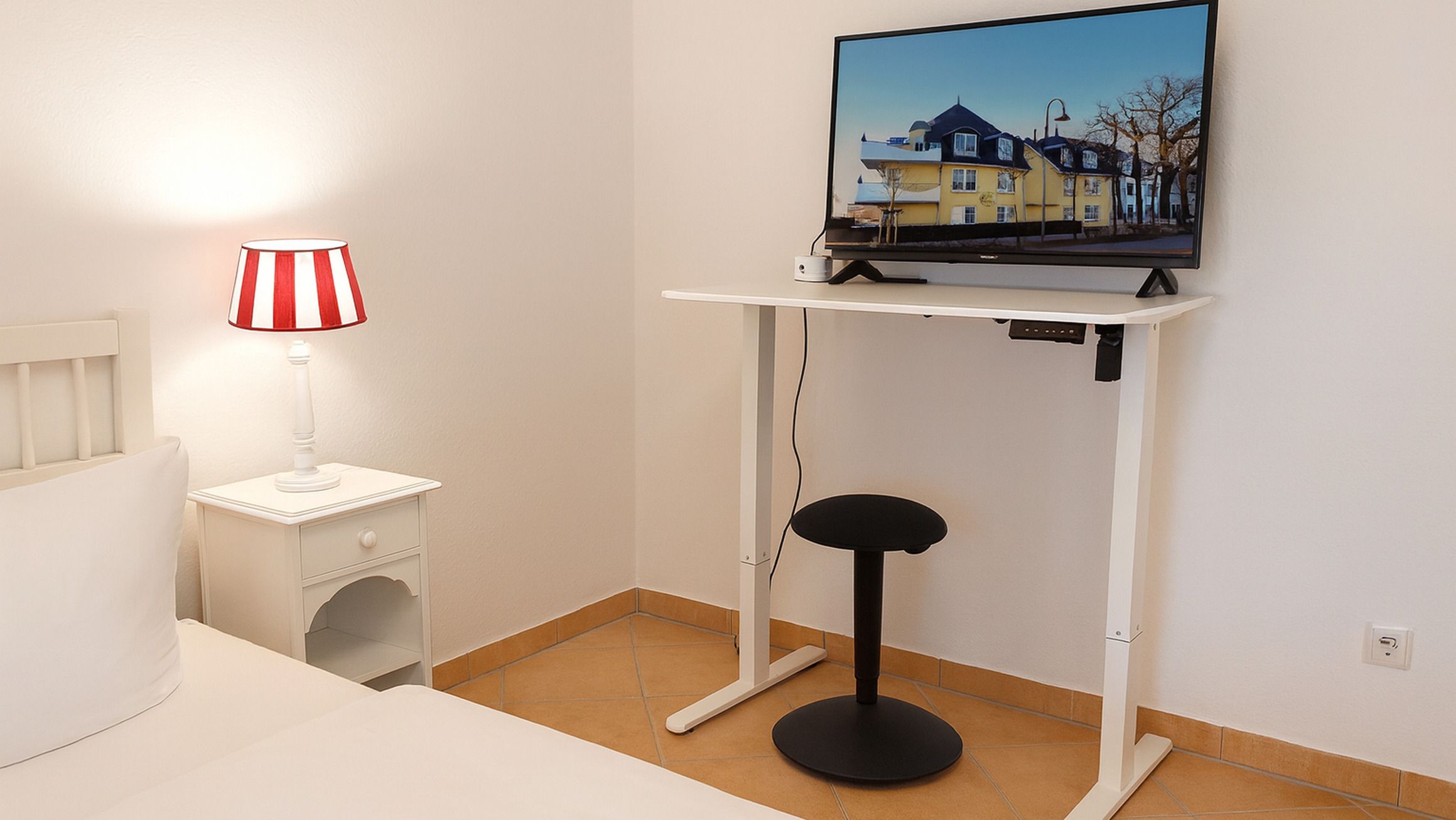 Das Badezimmer ist ausgestattet mit WC, Dusche, Kosmetikspiegel und Fön. Im Schlafzimmer befindet sich ein Doppelbett, zwei Nachttische, ein Kleiderschrank und ein zusätzlicher Smart-TV. Dieser kann auch als Bildschirm für Homeoffice-Arbeiten genutzt werden, da es einen höhenverstellbaren Schreibtisch, viele Steckdosen und schnelles WLAN gibt.