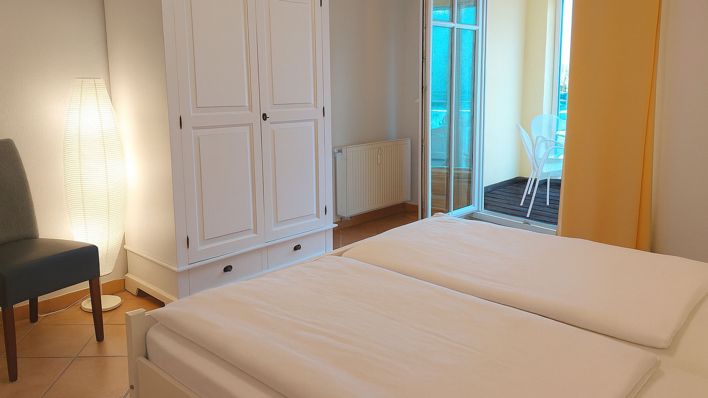 Die geräumige Nichtraucher-2-Raumwohnung 90943 befindet sich im ersten Obergeschoss der Villa Vogelsang (hofseitig ausgerichtet) und bietet ca. 65 qm Platz für bis zu 4 Personen. Die Wohnung verfügt über einen Flur mit Garderobe, von dem aus der Wohnbereich, das Schlafzimmer, das Badezimmer und eine Abstellkammer (mit Waschmaschine und viel Stauraum) erreichbar sind.