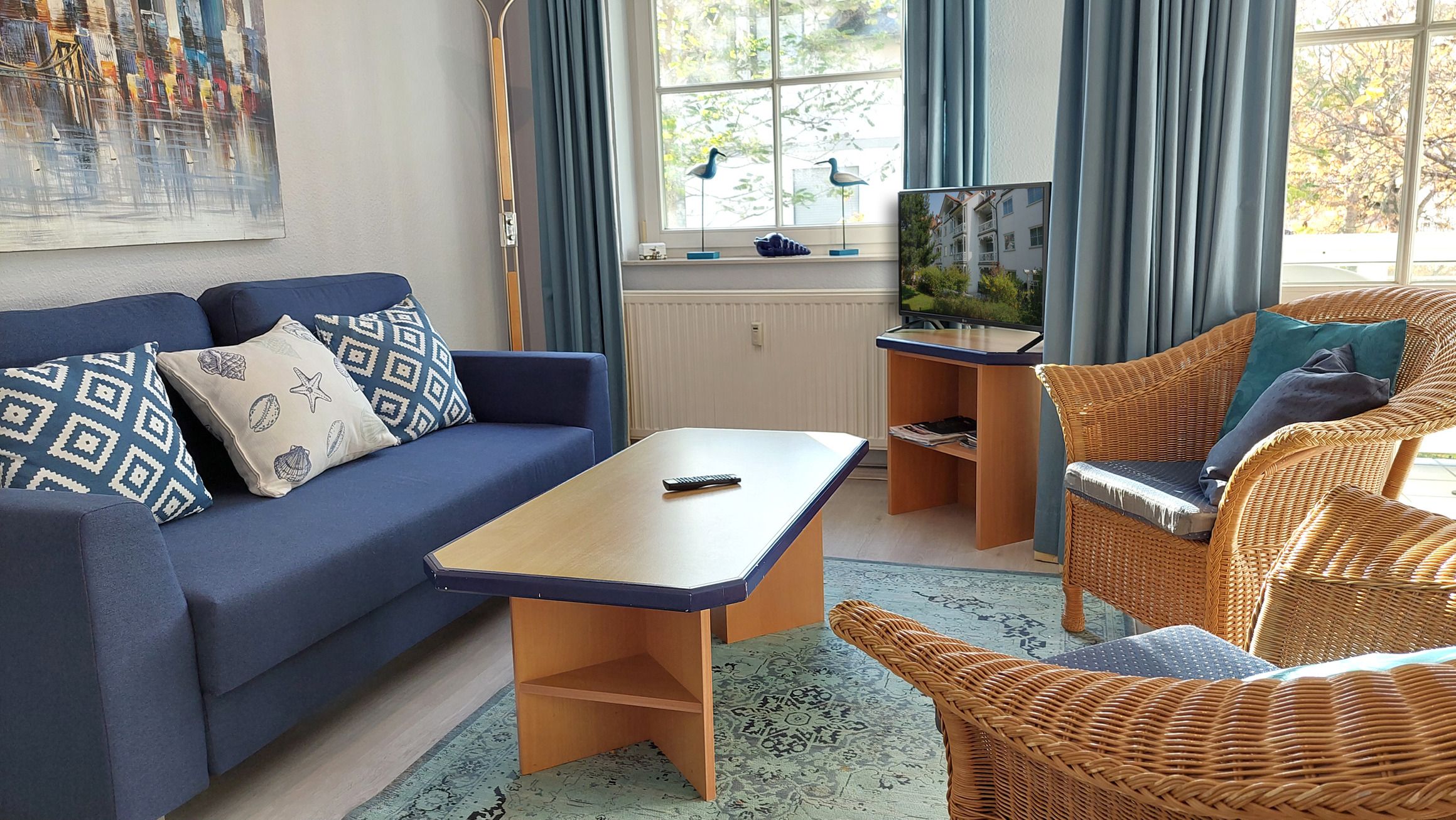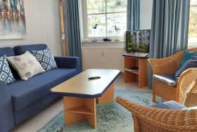 Im Wohnraum finden Sie neben der Sitzgruppe mit Schlafsofa noch einen separaten Essplatz. Ein Flachbildfernseher sowie eine Musikanlage mit CD gehören zur technischen Ausstattung. Der Schlafraum ist mit einem Doppelbett und großzügigem Kleiderschrank ausgestattet. Das Badezimmer erwartet Sie mit einem Waschbecken, Dusche und WC.