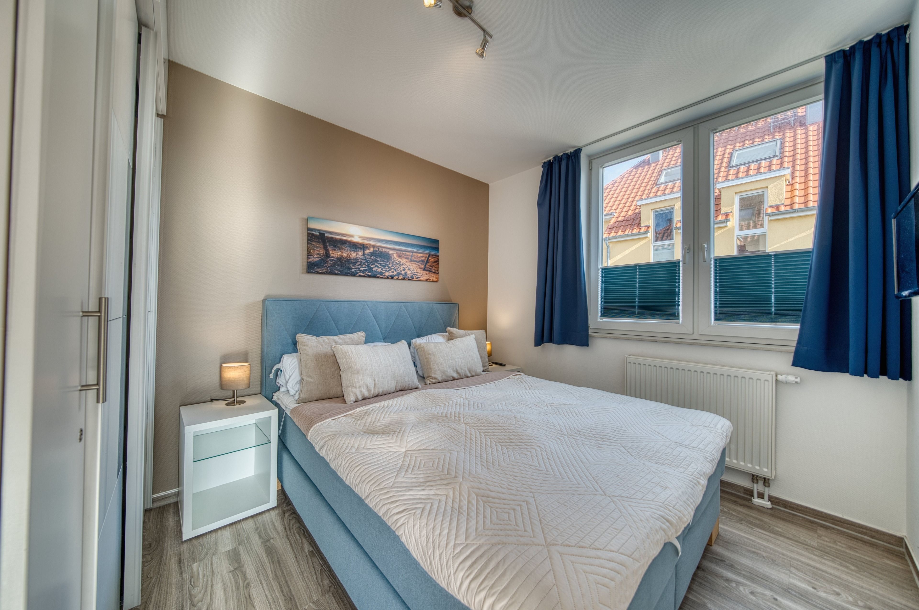 Zwei Schlafzimmer: eines mit Doppelbett (160 × 200 cm) und SAT-TV, eines mit Doppelbett (140 × 200 cm).