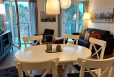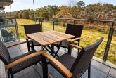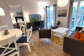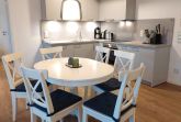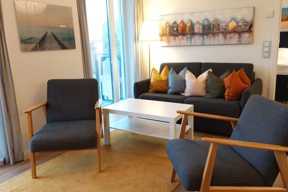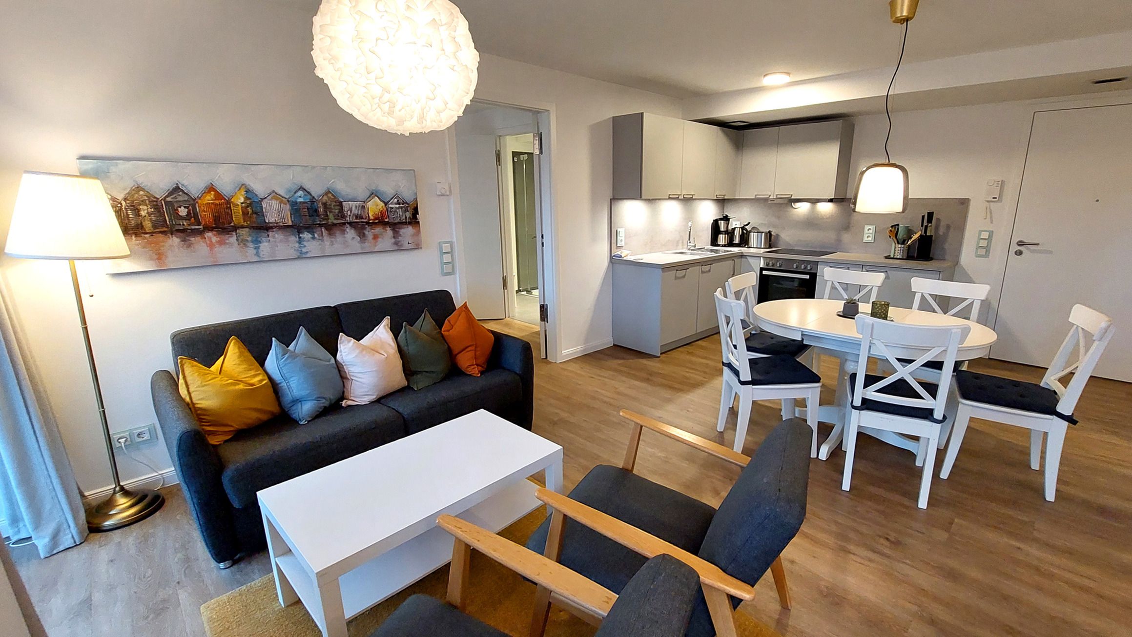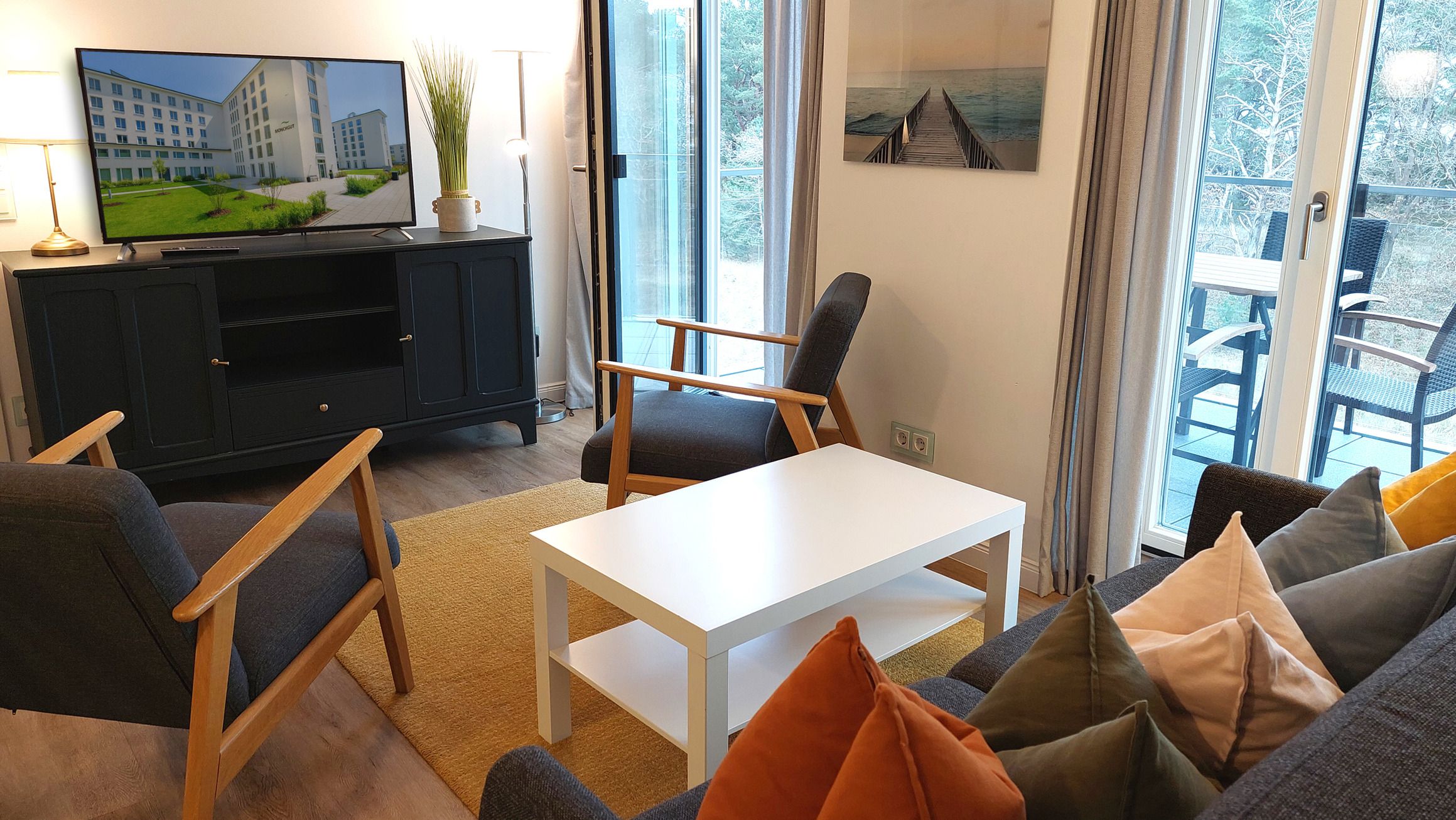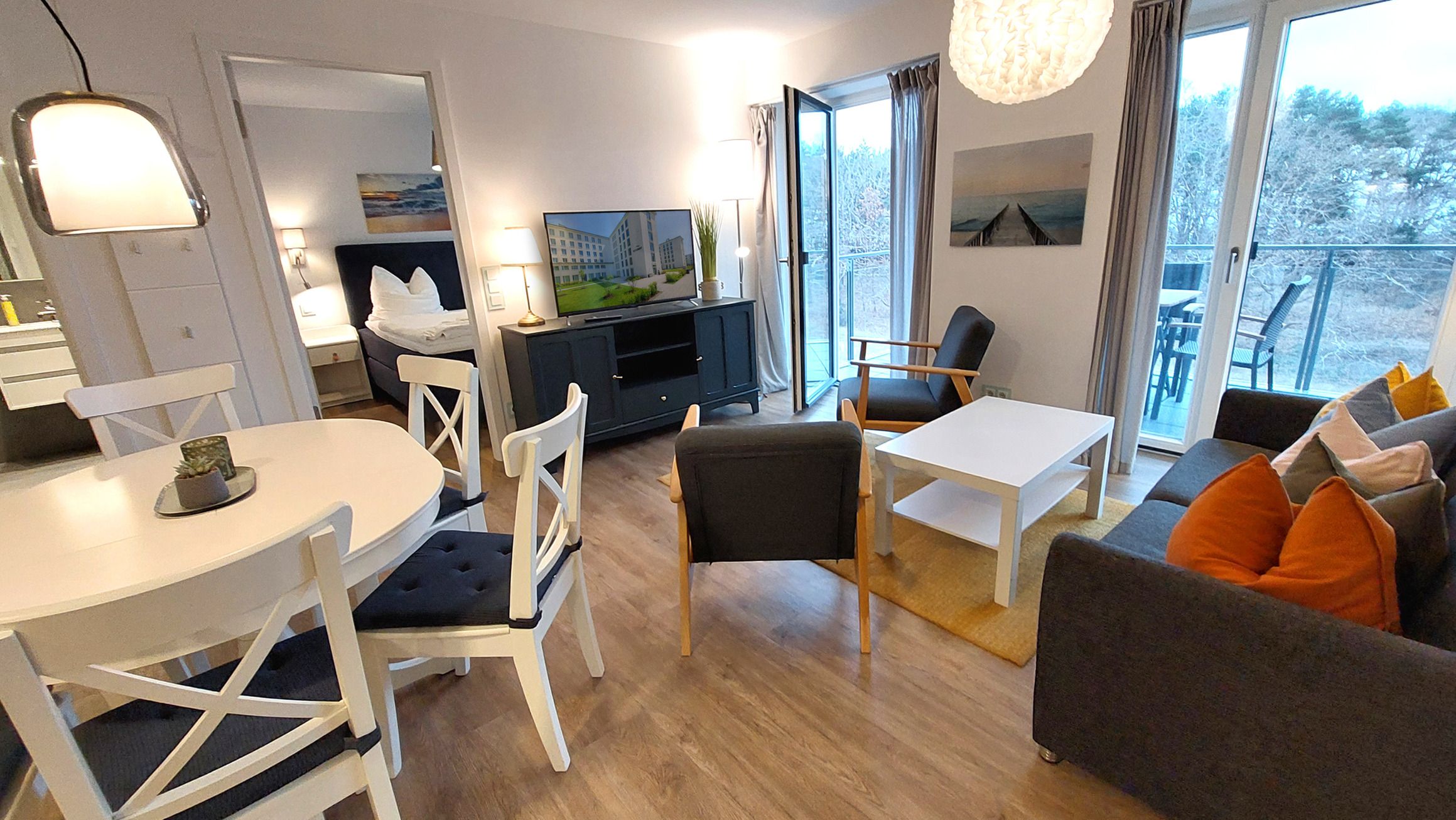 Das Wohn- und Esszimmer ist das Zentrum der Wohnung und lädt mit einer ausklappbaren Sofalandschaft zum Entspannen ein. Für Unterhaltung bei jedem Wetter gibt es einen Smart-TV und kostenfreies WLAN. Der Essbereich bietet Platz für 6 Personen und vom möblierten und überdachten Balkon aus hat man einen Blick auf den angrenzenden Küstenwald und die Ostseedünen.