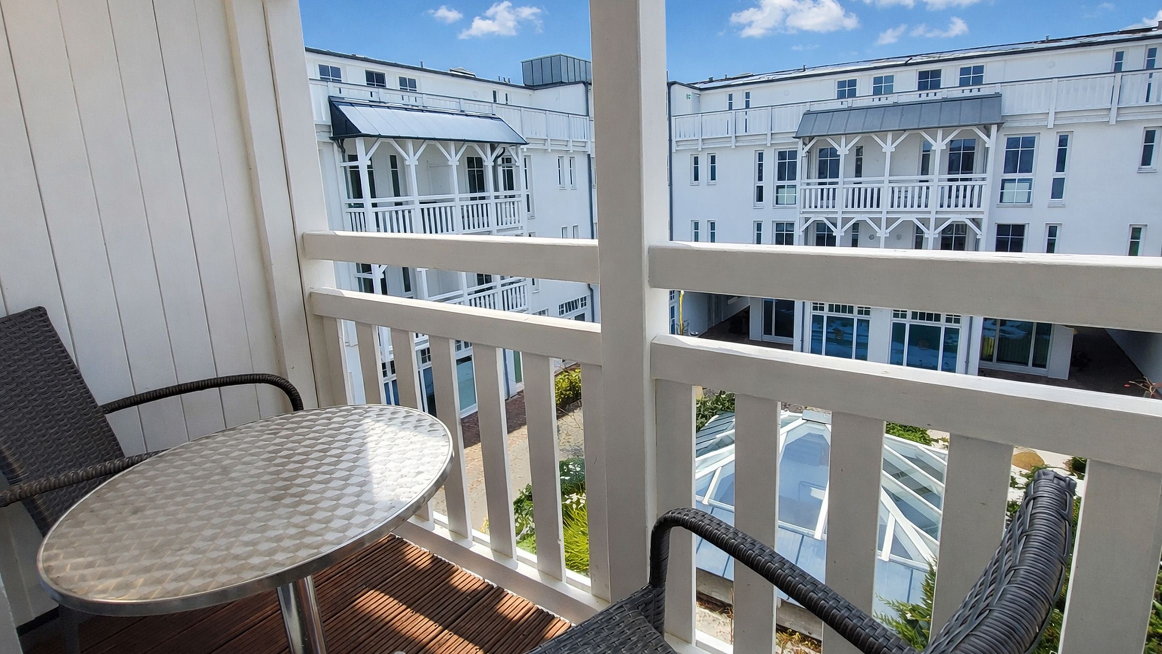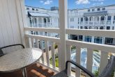 Der möblierte und überdachte Balkon bietet einen Blick in den ruhigen Innenhof der Anlage.