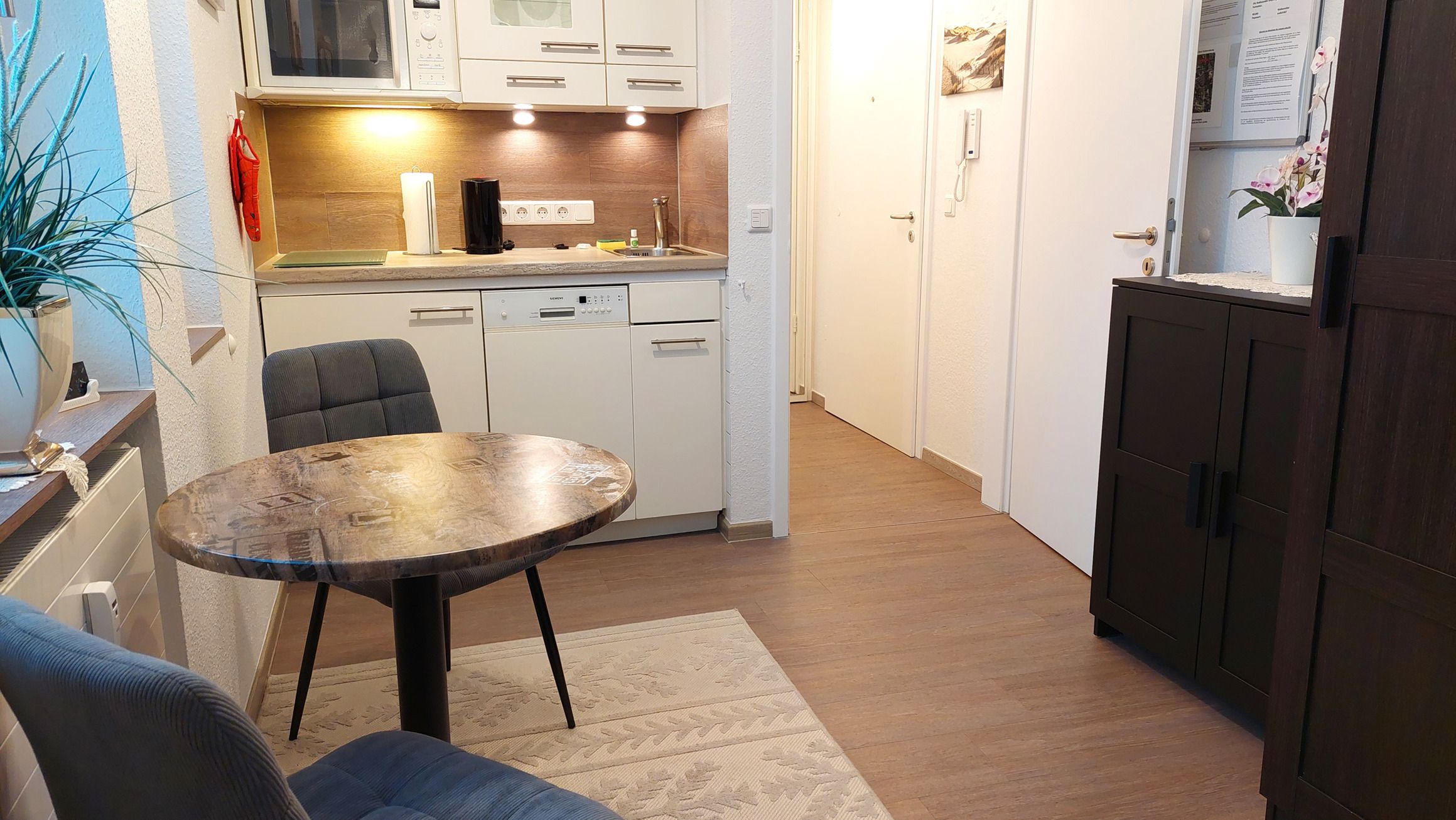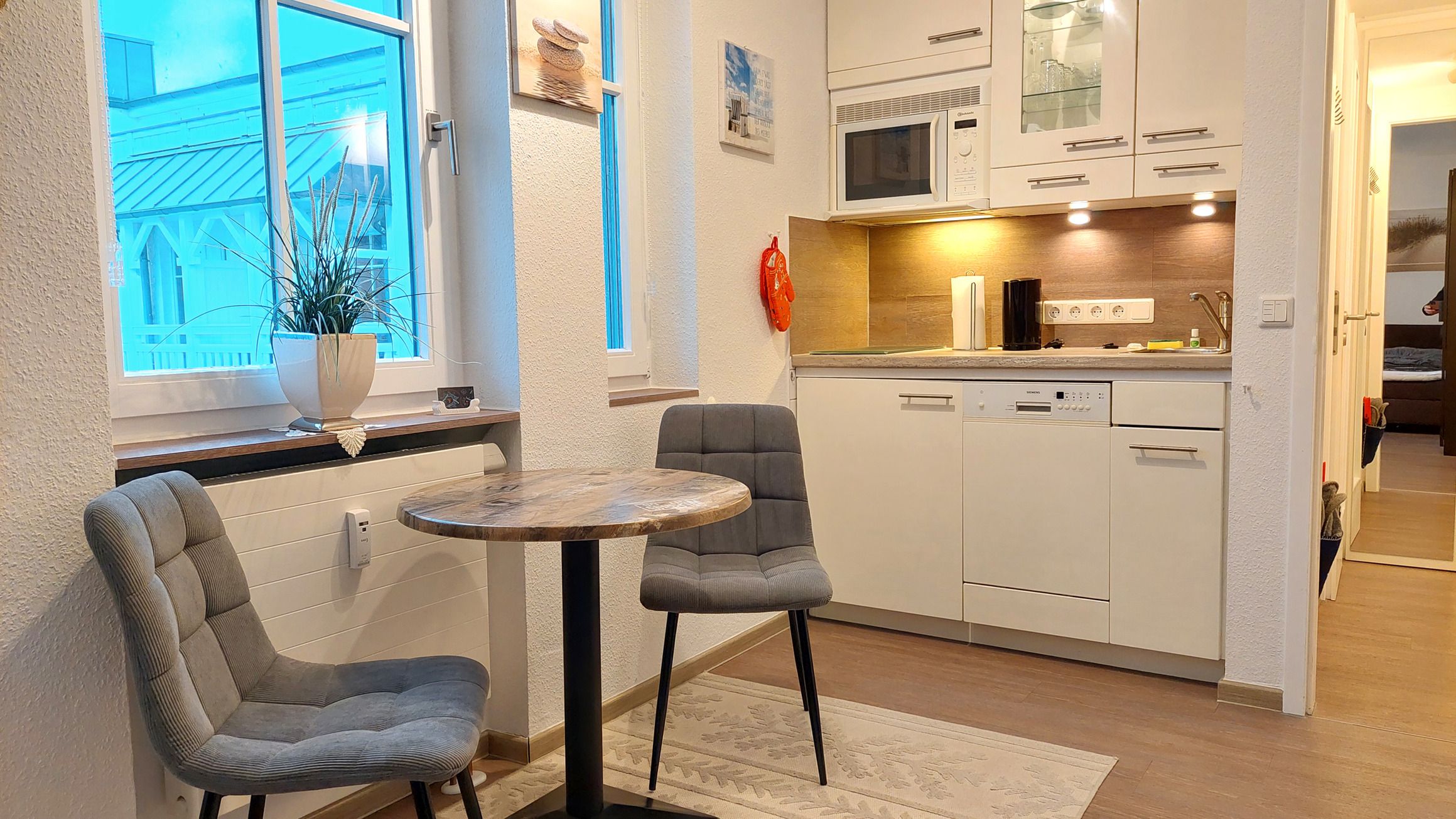 Es gibt eine moderne, offene Küchenzeile und einen Esstisch mit 2 Sitzgelegenheiten.
