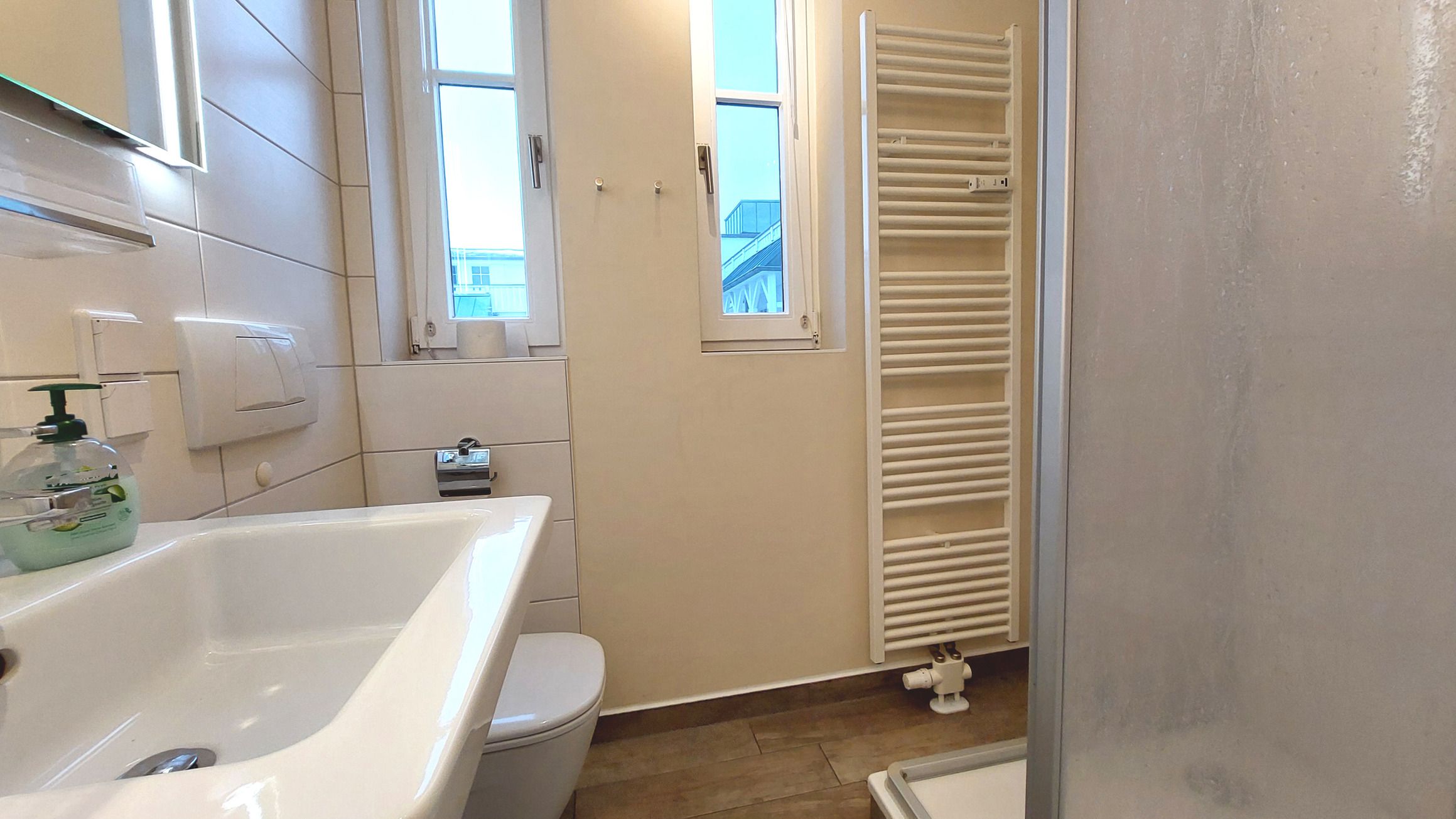 Vom kleinen Flurbereich (mit Garderobe) gelangen Sie ins Tageslicht-Duschbad sowie in den kombinierten Wohn-, Ess- und Schlafbereich.
