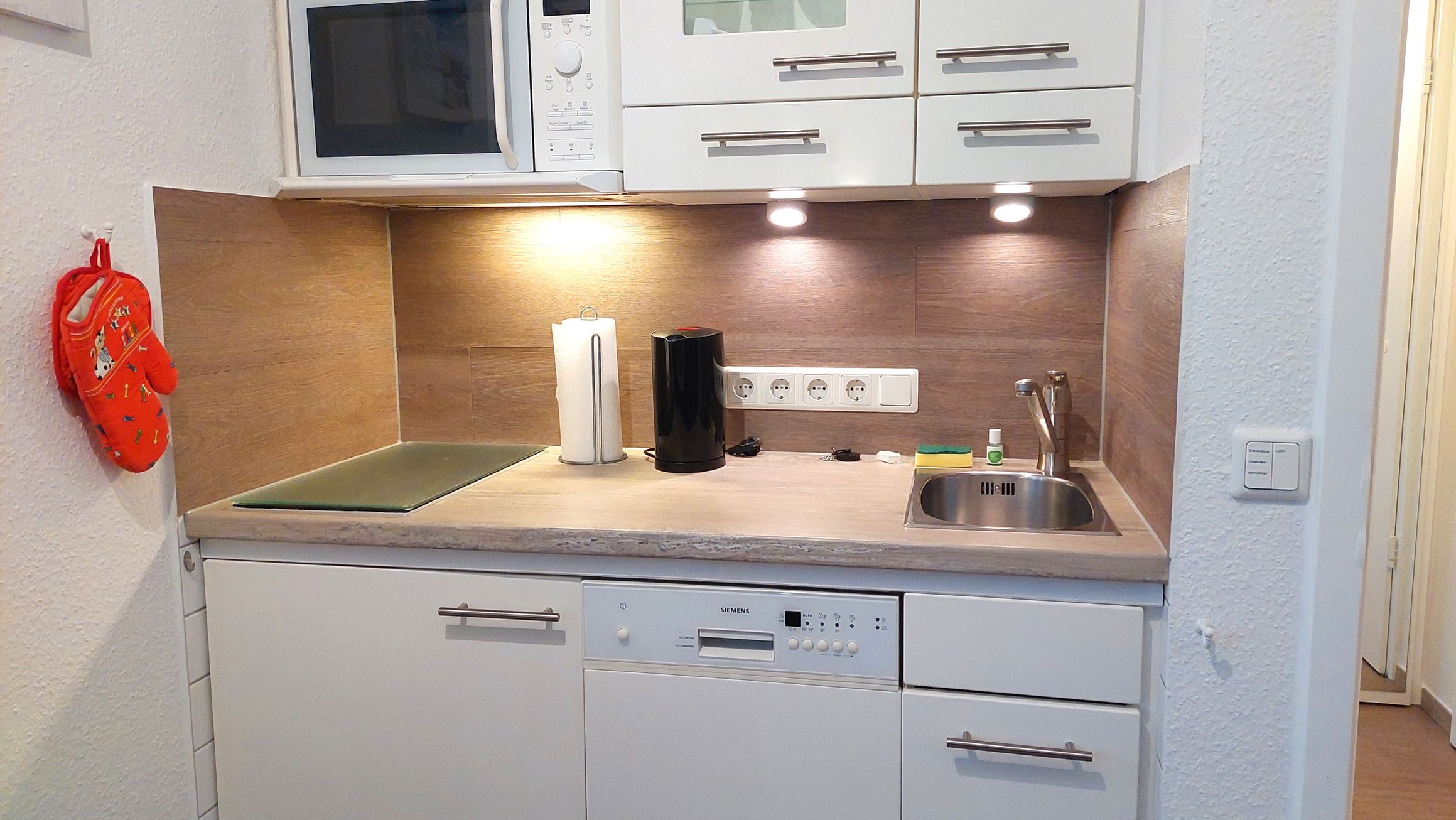 Mit 2 Induktionsfeldflächen, Kühlschrank (mi Gefrierfach), Geschirrspüler und Mikrowelle (mit Backfunktion) steht alles zur Verfügung um sich auch im Urlaub selbst zu verpflegen.