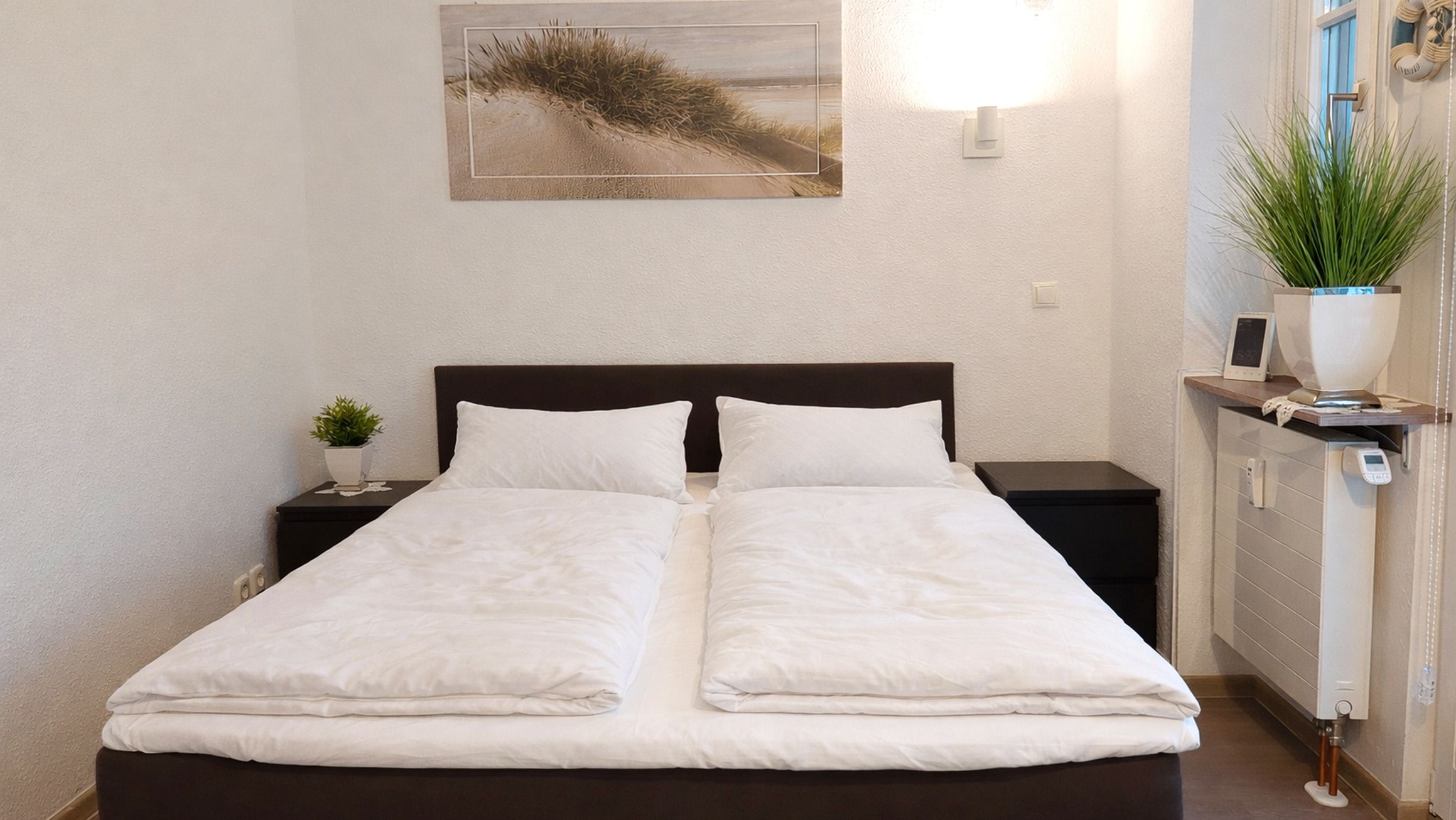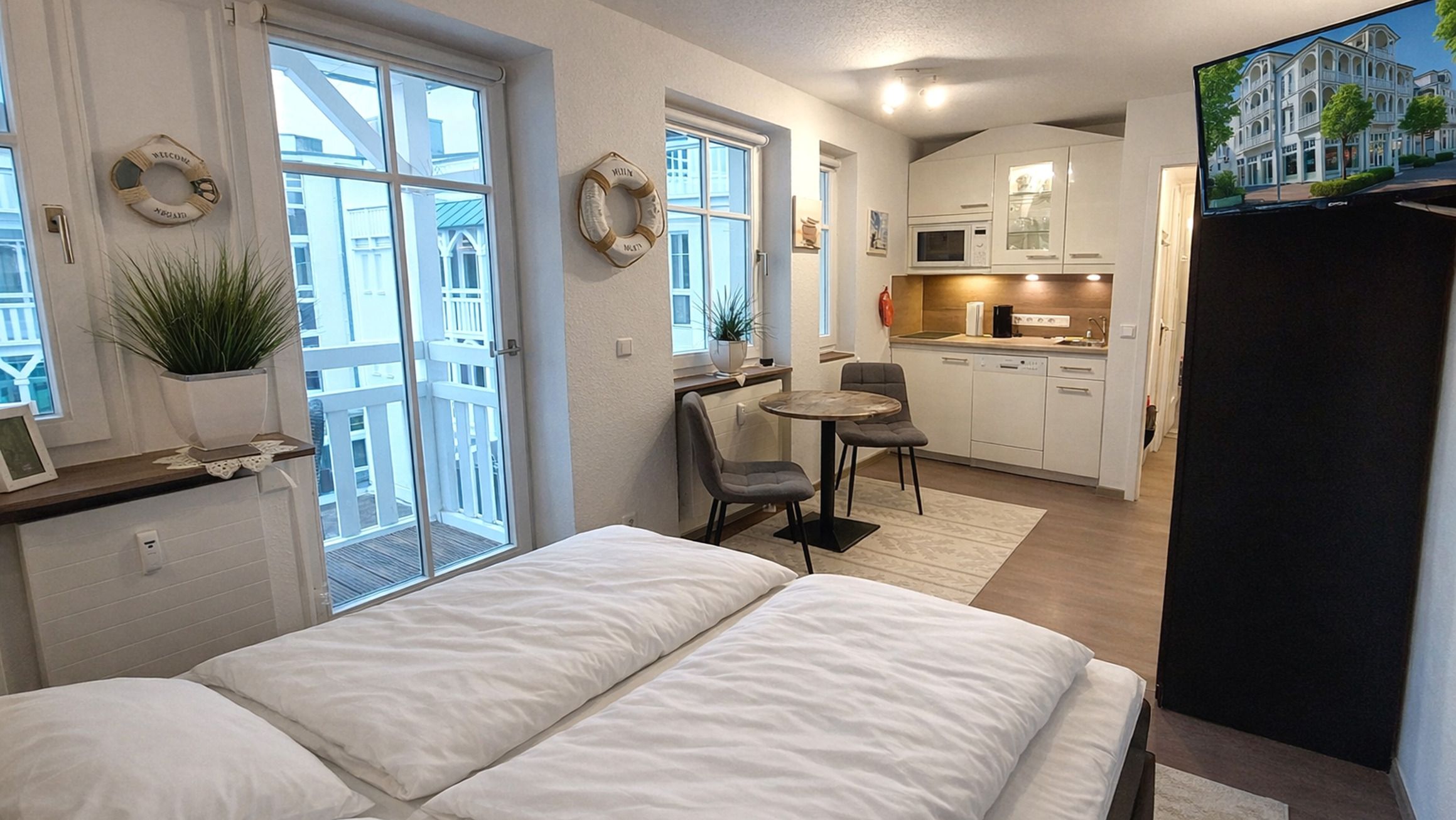 Der Schlafbereich umfasst ein Doppelbett mit 2 Nachttischen. Für Unterhaltung bei jeder Wetterlage sorgen ein Smart-TV,stabiler WLAN-Verbindung und „Alexa“ Smart Speaker für Hörspiele, Infos und Radio. Das Studio verfügt über eine Wetterstatiion und smarte Temperatursteuerung.