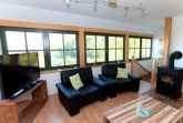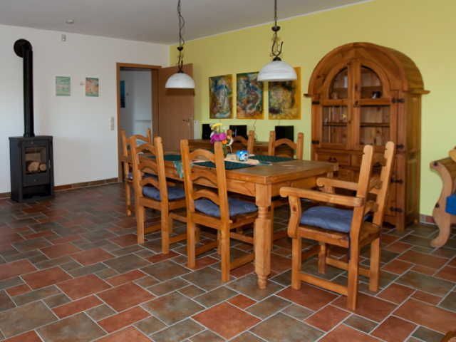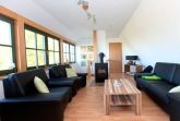 Das Wohnzimmer liegt im oberen Geschoss des Ferienhauses Darßblick. Es läd zu gemütlichen Stunden vor dem Kaminofen und zum Genießen des tollen Wasserblicks auf den Saaler Bodden ein. Es gibt LCD-Fernseher und Radio.