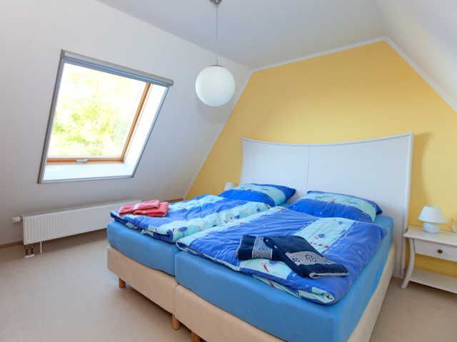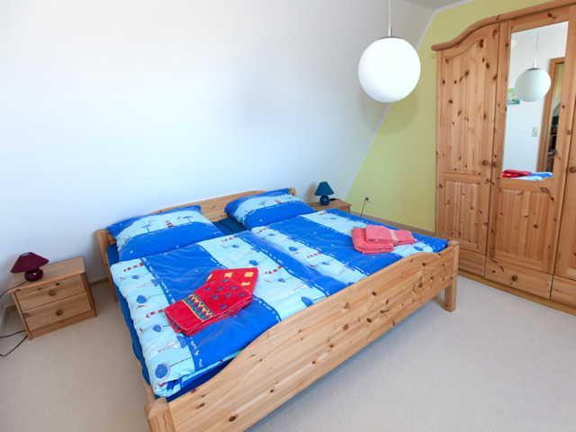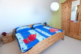 Schlafzimmer 2: Doppelbett. Zwischen den Schlafzimmern liegt das große Wohnzimmer, sodass sich Frühaufsteher und Langschläfer im Urlaub nicht in die Quere kommen. Auch das Schlafzimmer 2 hat den Wasserblick auf den Bodden.