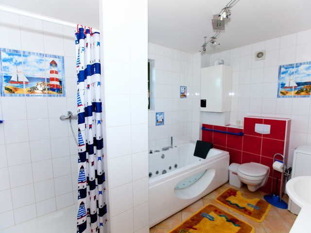 Das Badezimmer mit Fußbodenheizung im Ferienhaus Darßblick bietet Entspannung pur, ob in der Whirlwanne für zwei Personen oder in der großzügigen Dusche.