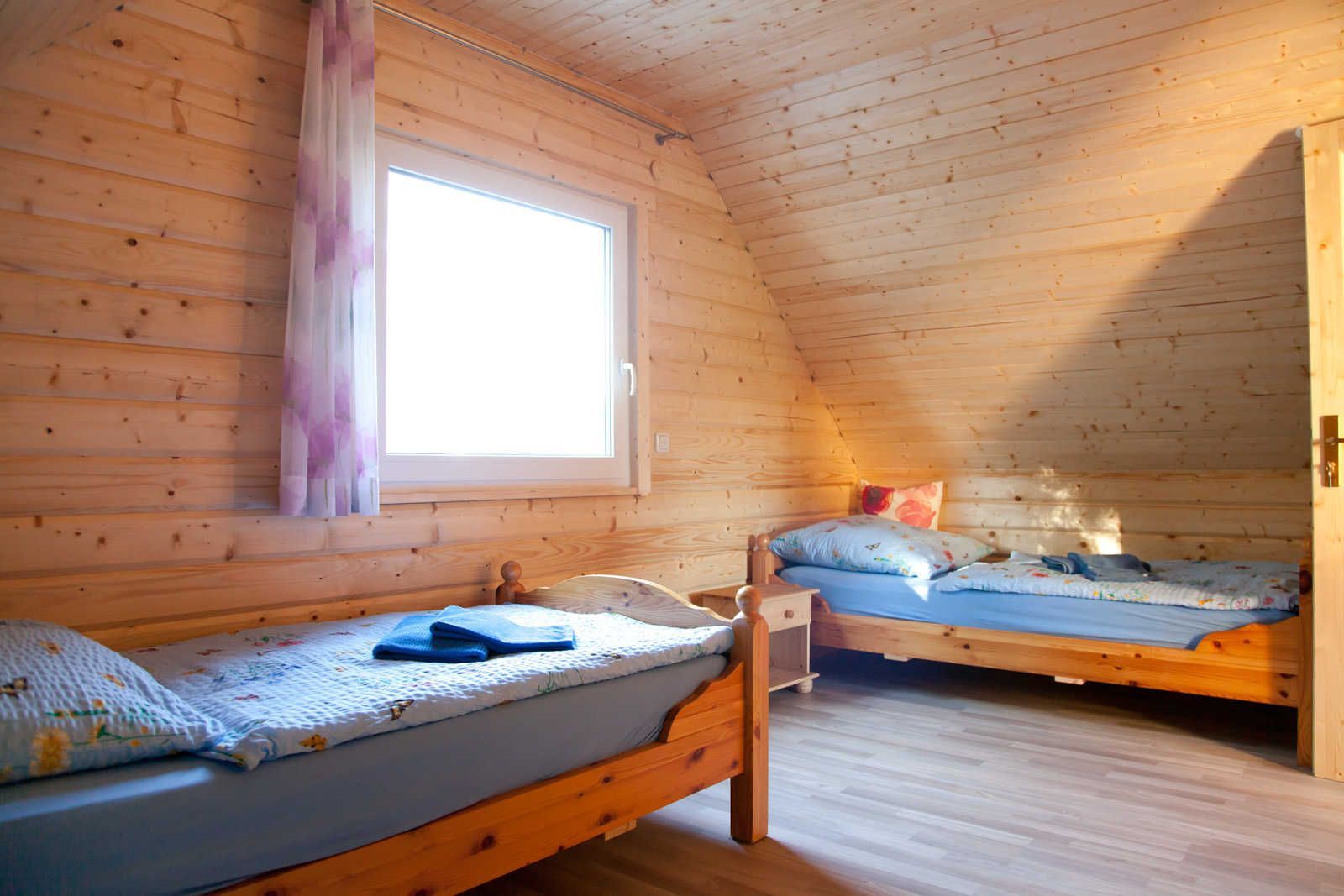 Das große Schlafzimmer im Obergeschoß ist mit einem Doppelbett ausgestattet und hat zudem ein echtes Kinderholzbett. Wenn Sie ausgeschlafen haben, können Sie den Morgen mit einem Blick über das Grundstück bis hin zum Saaler Bodden beginnen. Die obere Etage hat ein kleines eigenes WC.
