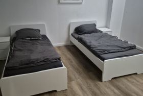 Die Wohnung im Dachgeschoss hat 2 Zimmer und ist mit 4 getrennt stehenden Einzelbetten, Kleiderschränken, Stühlen und Tisch, W-Lan sowie TV eingerichtet.