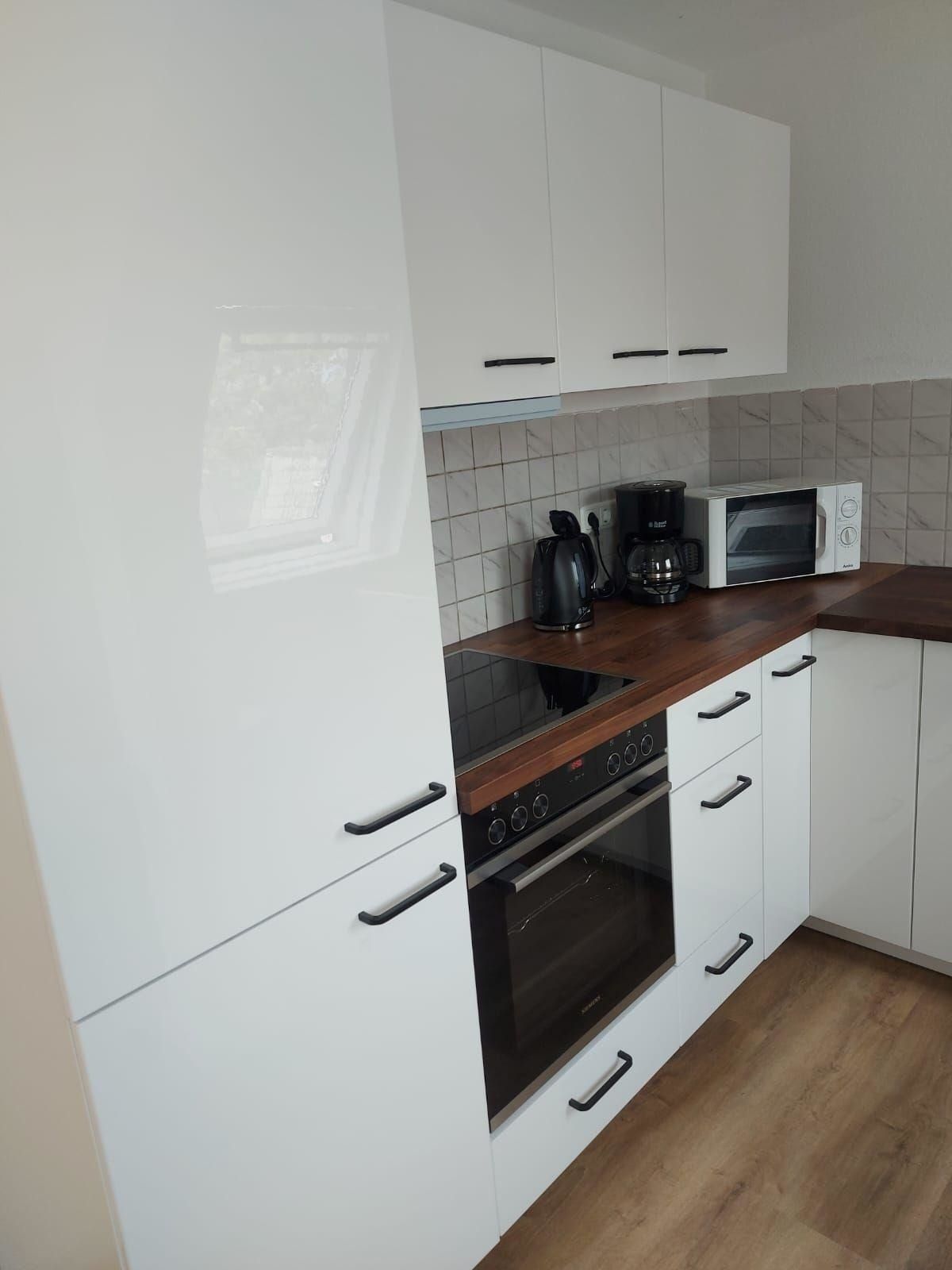 In der Küche befindet sich, ein Ceranherd, Backofen, Kühlschrank, Kaffeemaschine, Wasserkocher, Mikrowelle und ausreichend Geschirr.