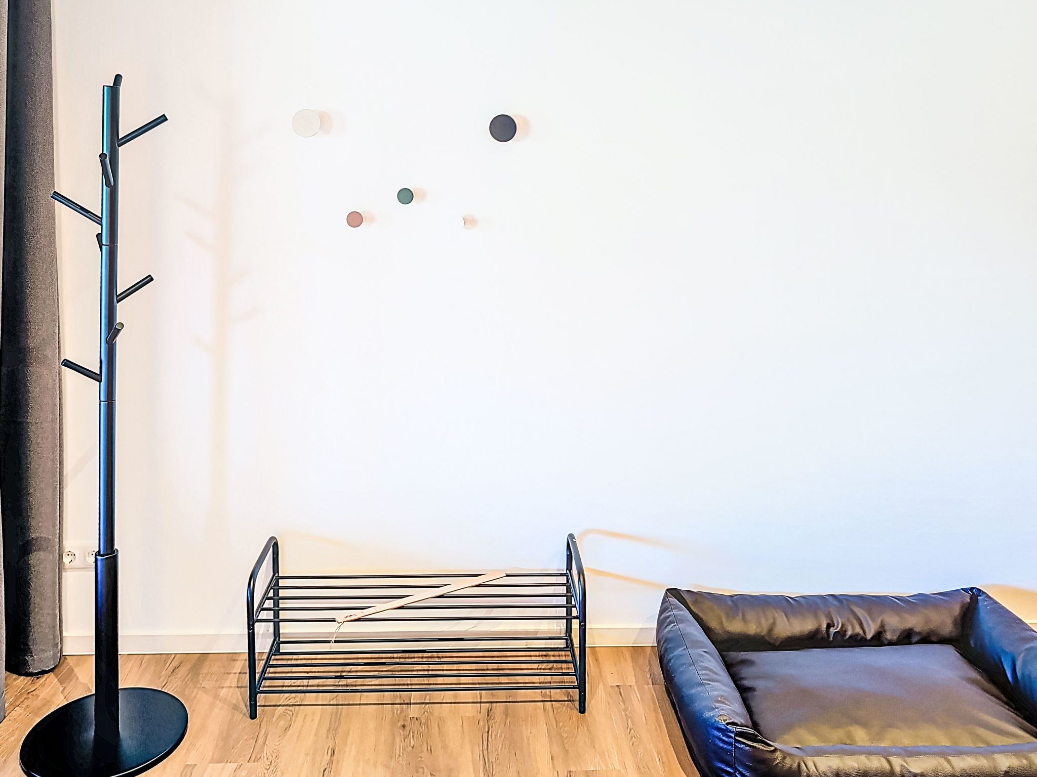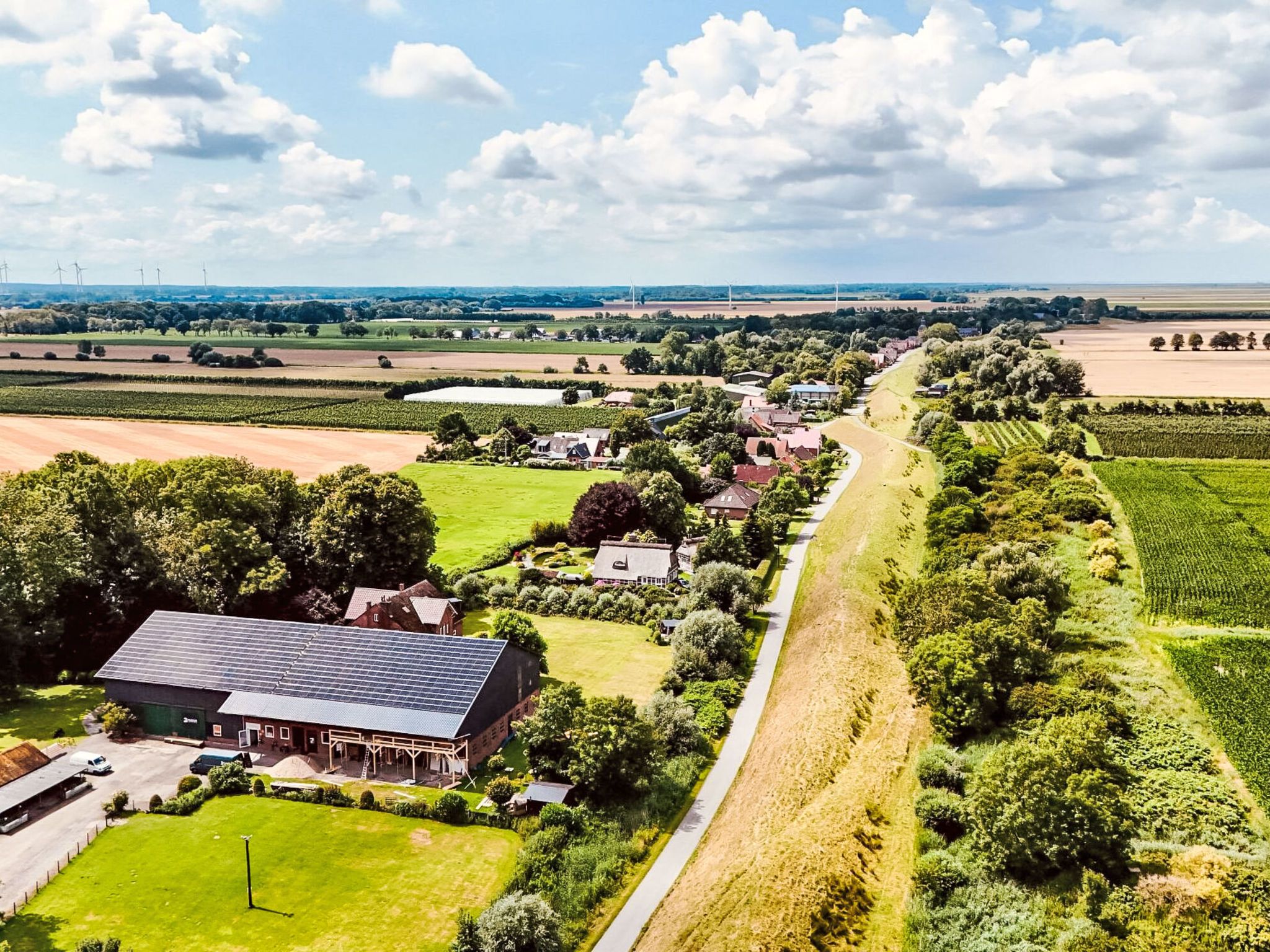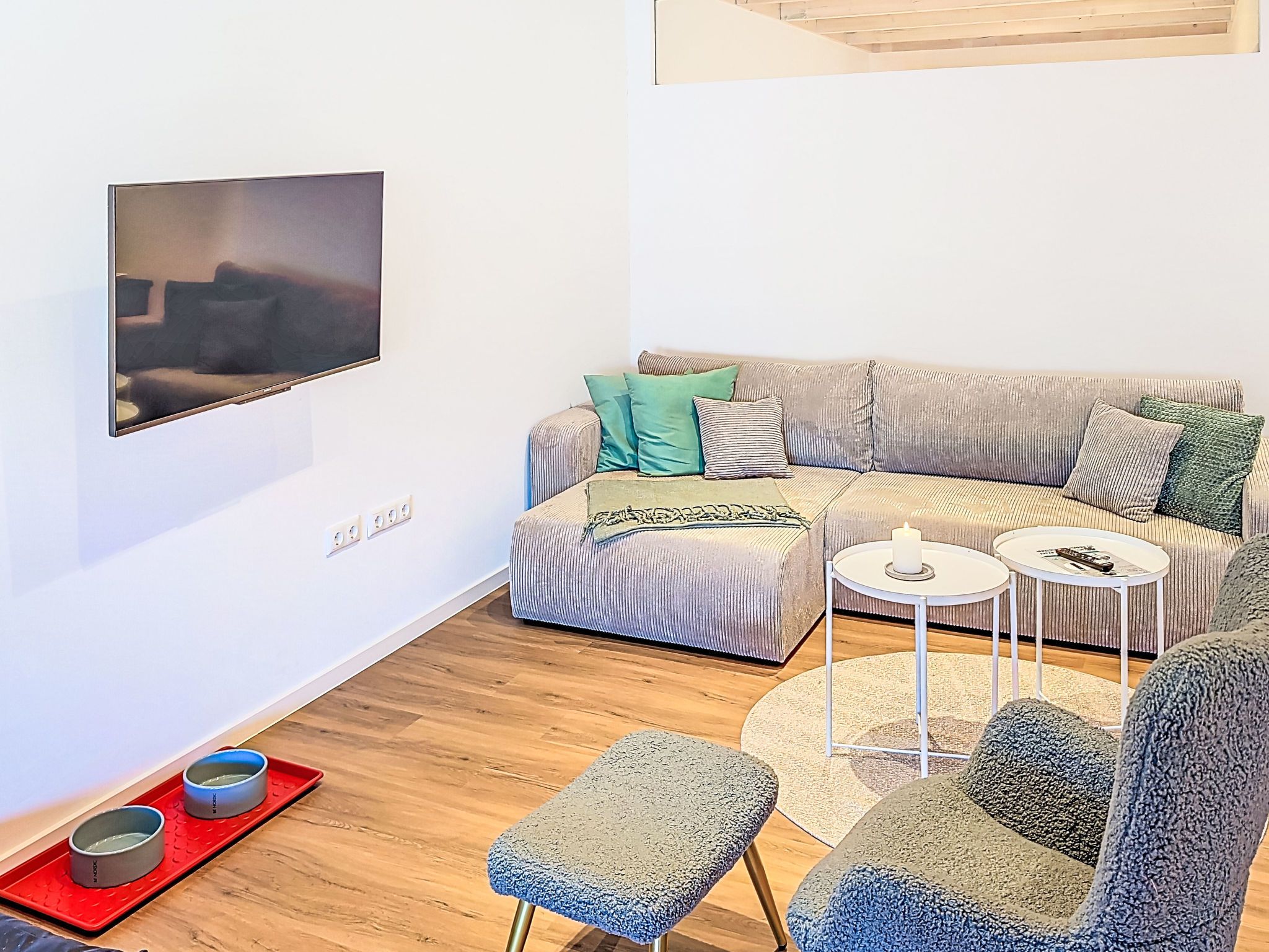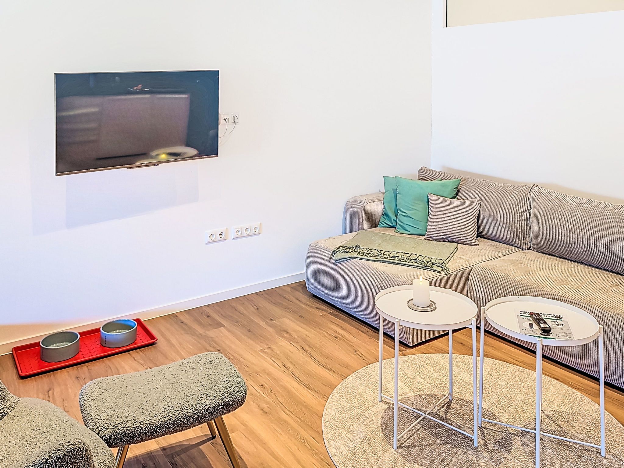 Deich-Moment, 2-Zimmer-Wohnung 53 m2, im Obergeschoss. Komfortabel und gemütlich eingerichtet: grosses Wohn-/Esszimmer mit 1 Diwanbett (140 cm, Länge 200 cm), TV und Flachbildschirm. Ausgang zur Terrasse. 1 Zimmer mit 1 Doppelbett (180 cm, Länge 200 cm). Grosse, offene Küche (Backofen, Geschirrspüler, 4 Glaskeramikplatten, Toaster, Wasserkocher, elektrische Kaffeemaschine) mit Esstisch. Dusche/WC. G-Heizung, Fussbodenheizung. Grosse Terrasse 10 m2. Terrassenmöbel. Sehr schöne Panoramasicht auf Deich. Zur Verfügung: Internet (WLAN, gratis). Maximal 2 Haustiere/Hunde erlaubt. Kostenlos: Hundegruppen- und Sozialtraining. Zubuchbar: Hundesalon, Physiotherapie, Coaching. Shop mit Futter %26 Zubehör.