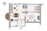 Wohnraum mit Küchenzeile und Esstisch, ein Schlafzimmer mit Doppelbett, ein Schlafzimmer mit zusammenschiebbarem Doppelbett, Flur mit Garderobe, Bad, Südbalkon, Tiefgaragenstellplatz 6 € pro Tag.