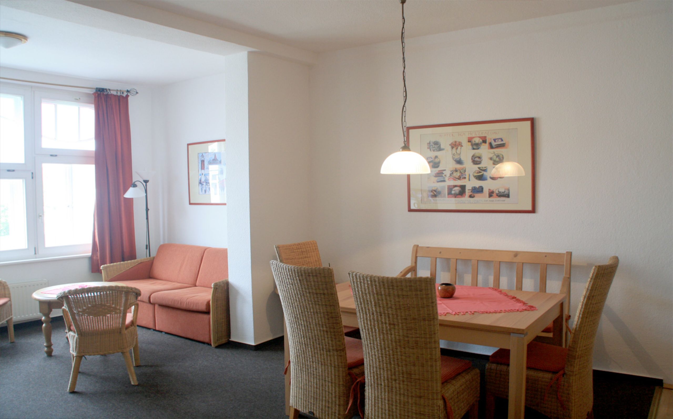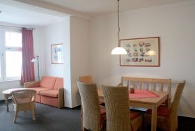 Der großzügige Essbereich bietet ebenso viel Platz zum Beisammensein wie der lichtdurchflutete Wohnbereich vor den großen Jugendstilfenstern (ausziehbare Doppelbettcouch, HiFi-Anlage, großer Flachbildschirm, WLAN bei Bedarf).