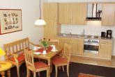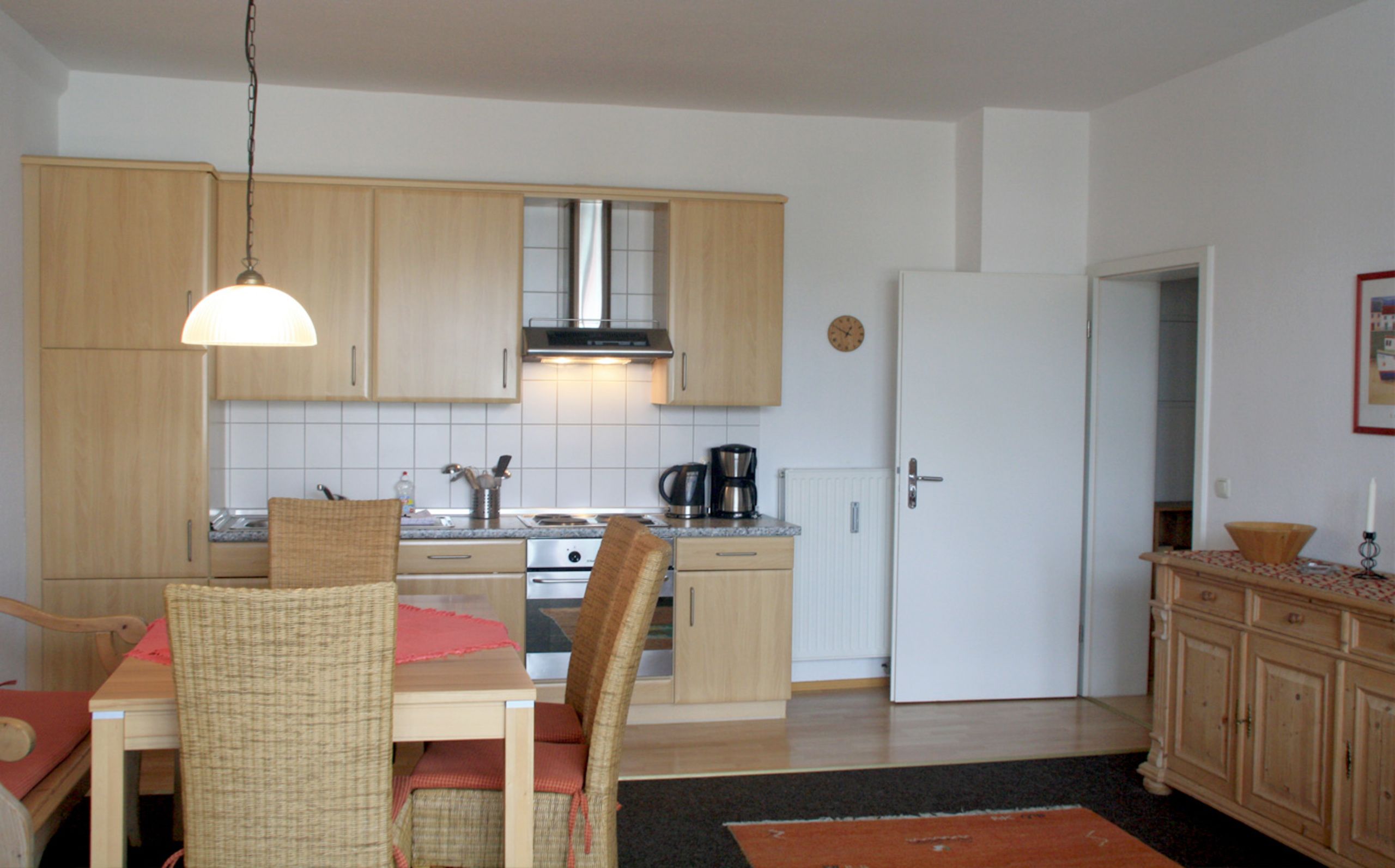 Vom Entree mit Garderobe und Zugang zum schönen Bad betreten Sie den großen Wohn- und Essraum mit Küche (Spülmaschine, Kühlschrank, Backofen, Vierplattenherd, Kaffeemaschine, Toaster, Wasserkocher und ausreichend Geschirr).
