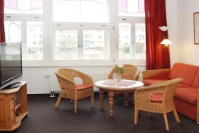 Unsere Ostsee-Ferienwohnung Horizont für vier Personen und 2 Aufbettungen, ca. 65 qm groß, befindet sich im zweiten Obergeschoss der Villa Waldfrieden, unserem renovierten Altbau mit den typischen, hohen Räumen und den großflächigen, bunten, denkmalgeschützten Jugendstilfenstern.