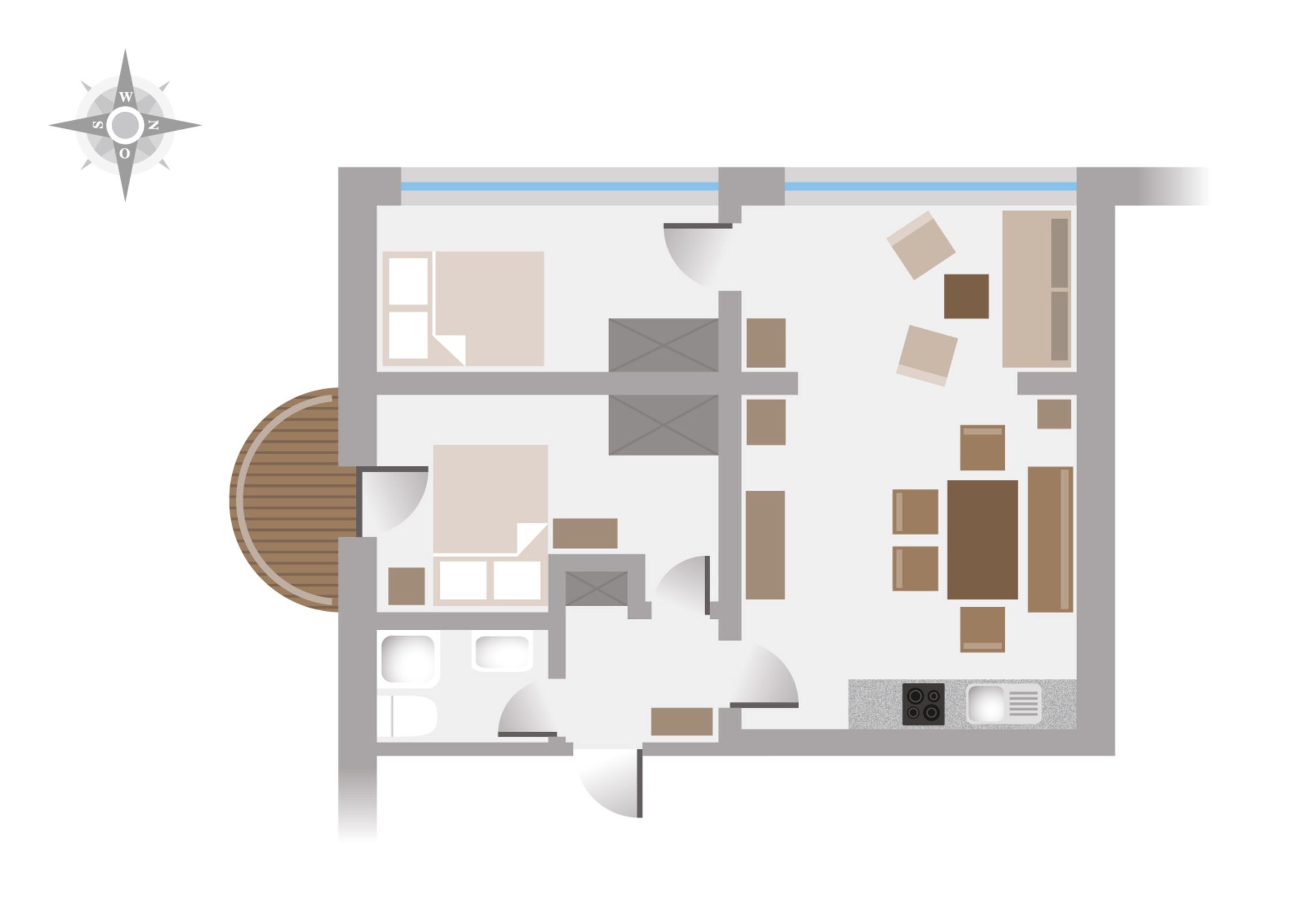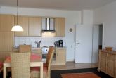 Wohnraum mit Ausziehcouch, offene Küche und Esstisch, zwei Schlafzimmer mit Doppelbett, Flur mit Garderobe, Bad, Südbalkon, Tiefgaragenplatz 6 Euro pro Nacht.