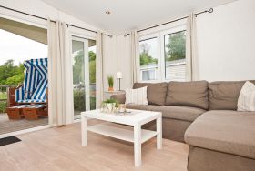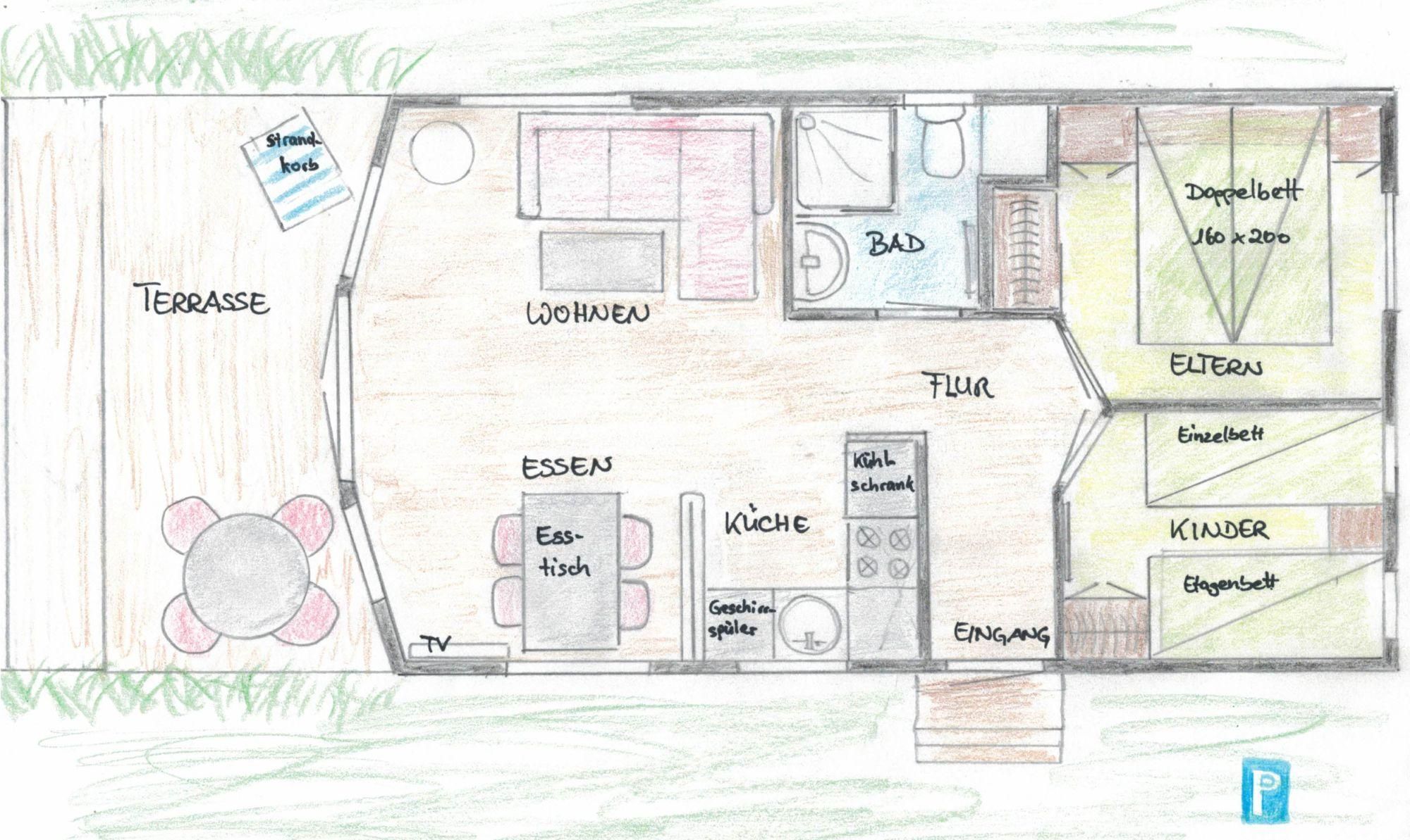 - Bad: Dusche, Waschbecken, Spiegel, WC Terrasse: teilweise Teilüberdachung, Gartenmöbel, Strandkorb. Kein Sonnenschirm vorhanden!