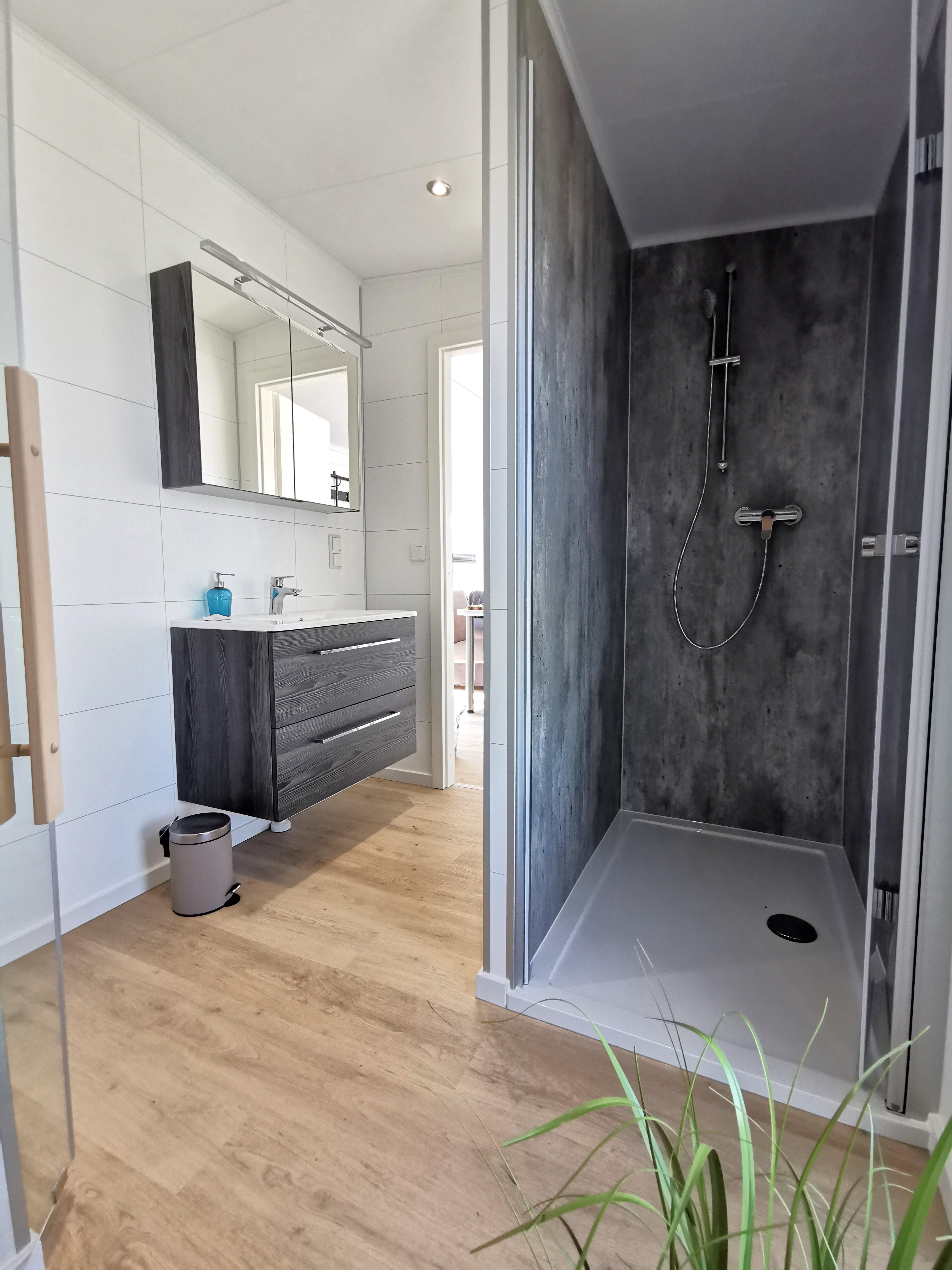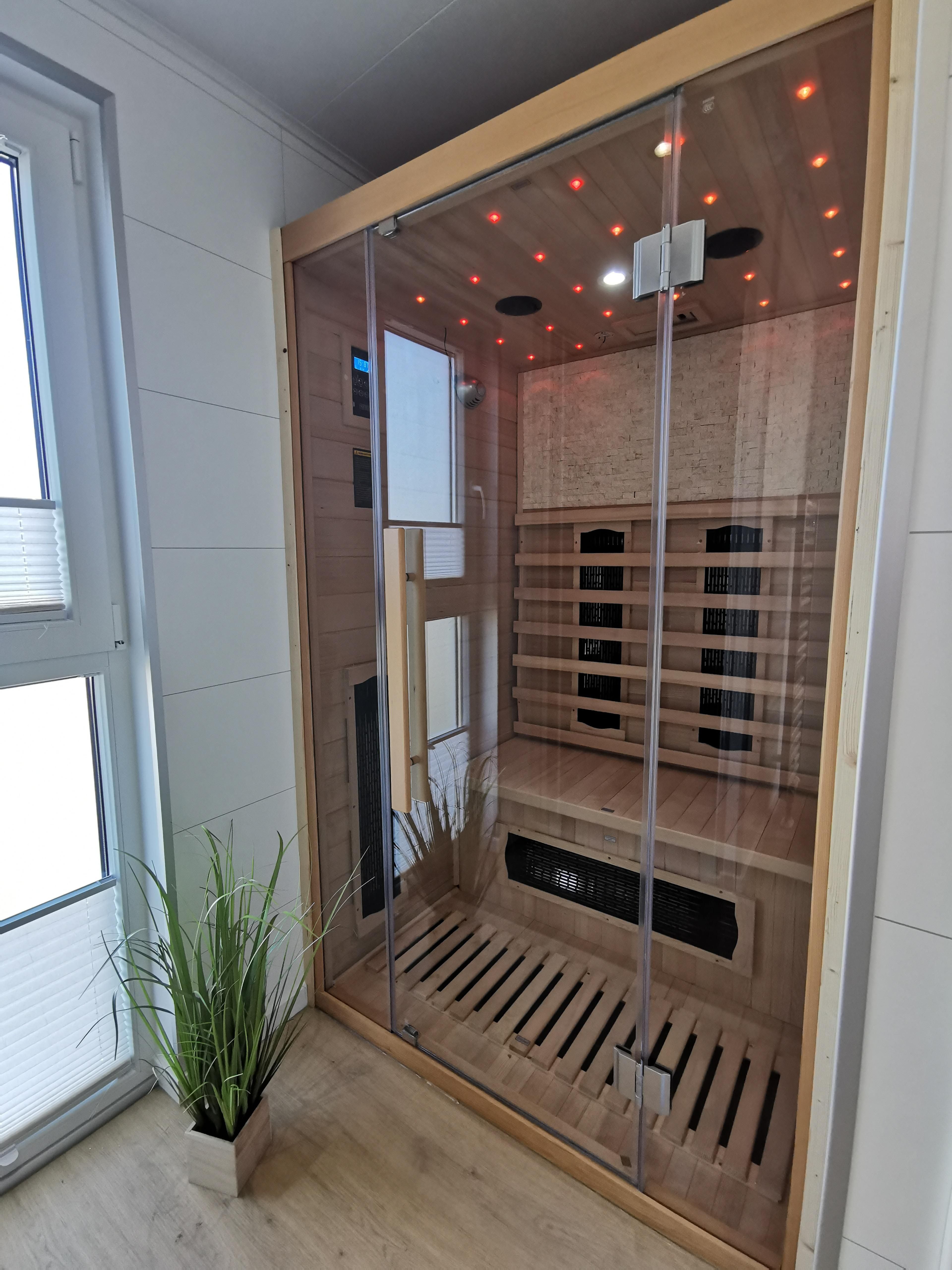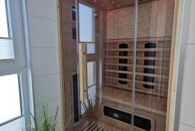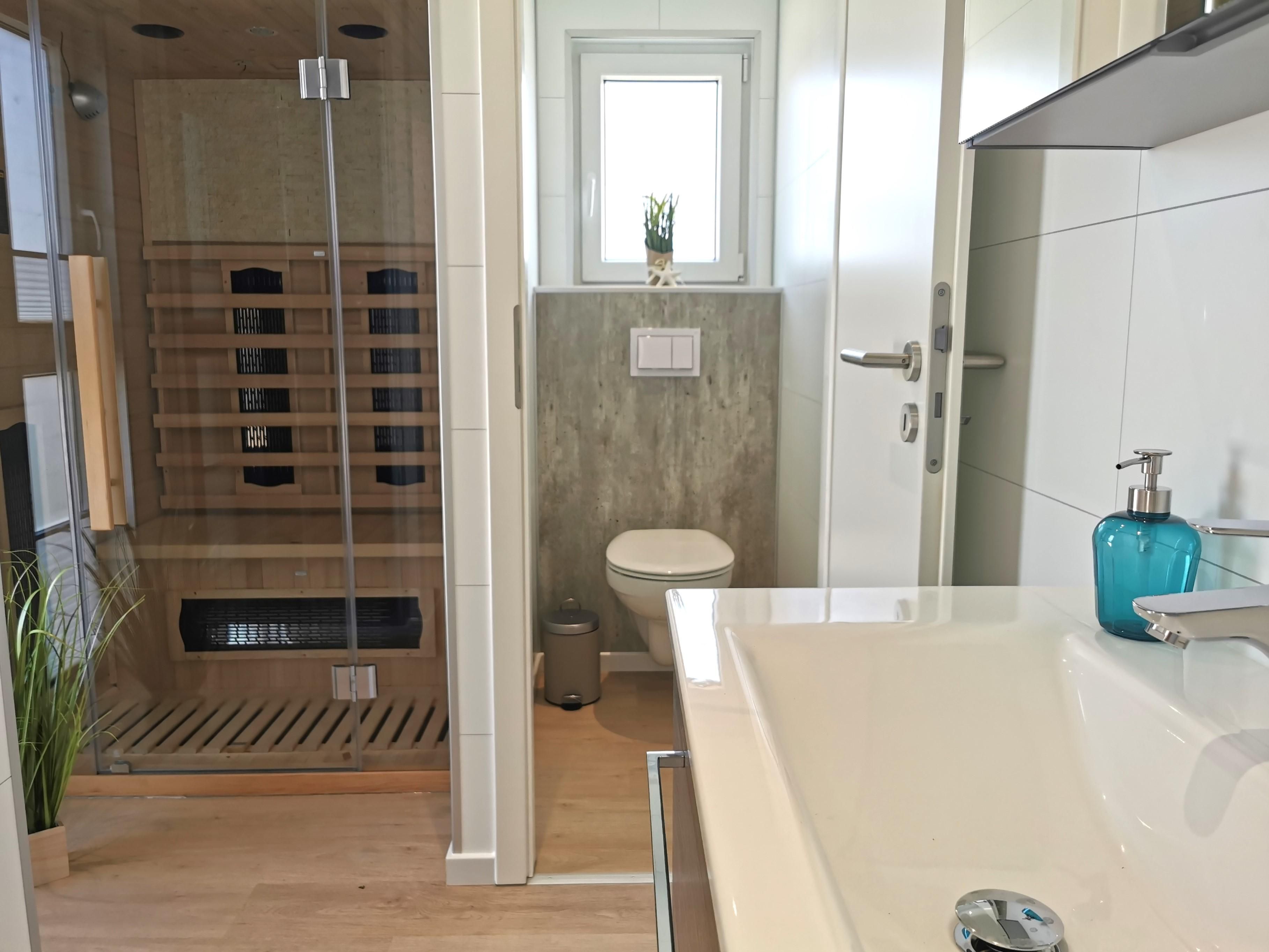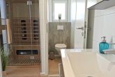 - Bad: großzügiges Bad mit bodenebener Dusche, Handtuchheizung, Waschtisch, Spiegelschrank, Infrarotsauna, separates WC