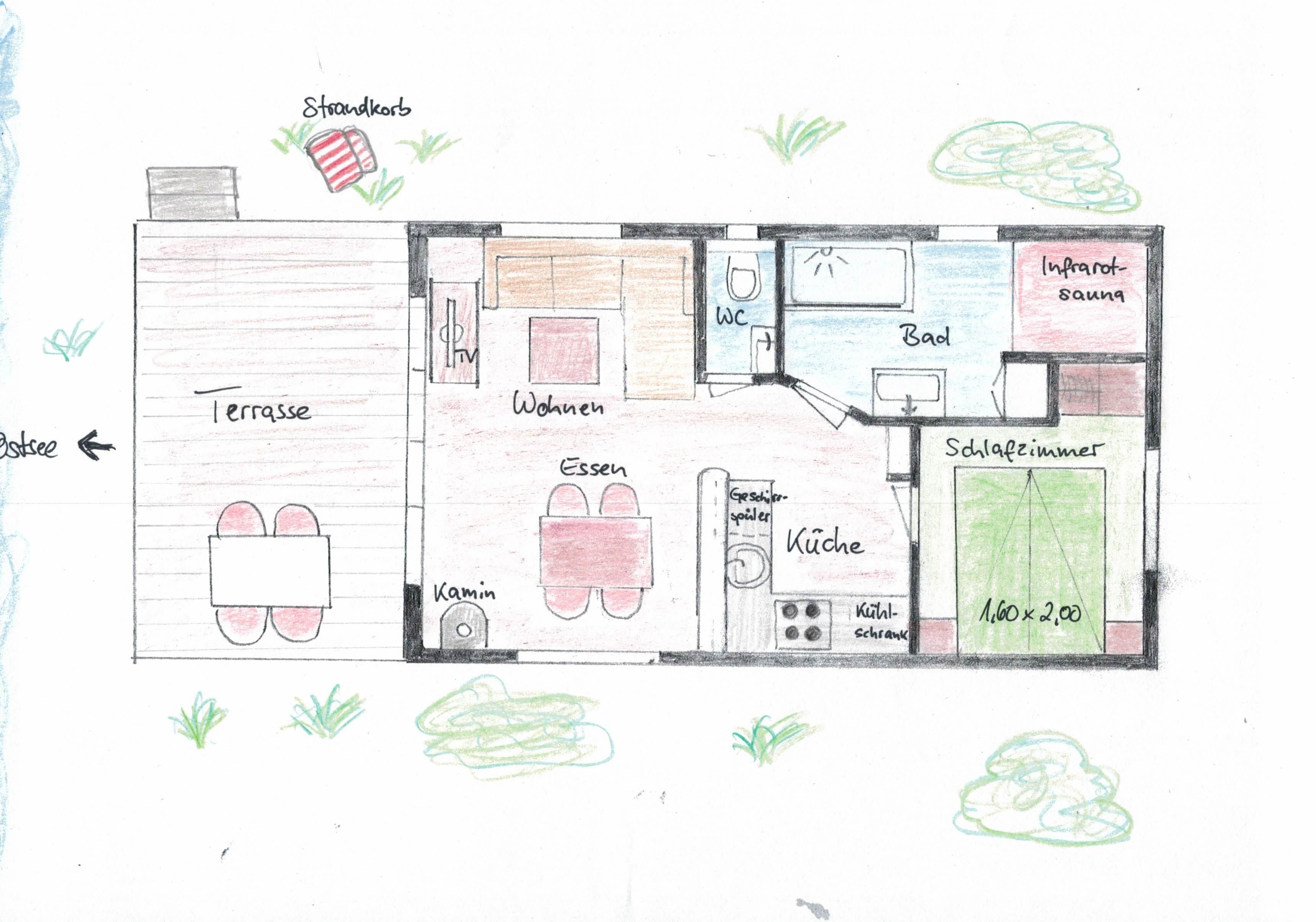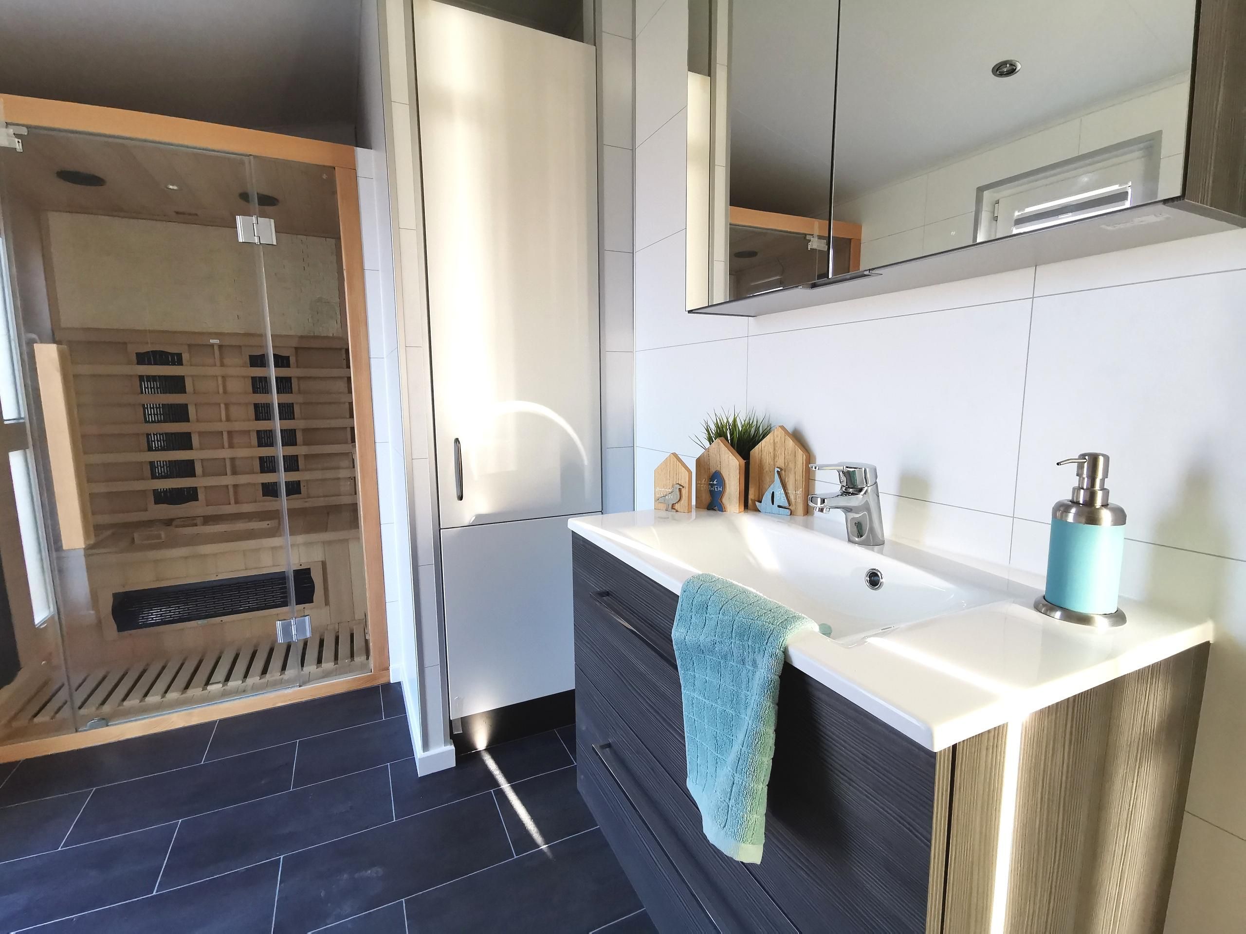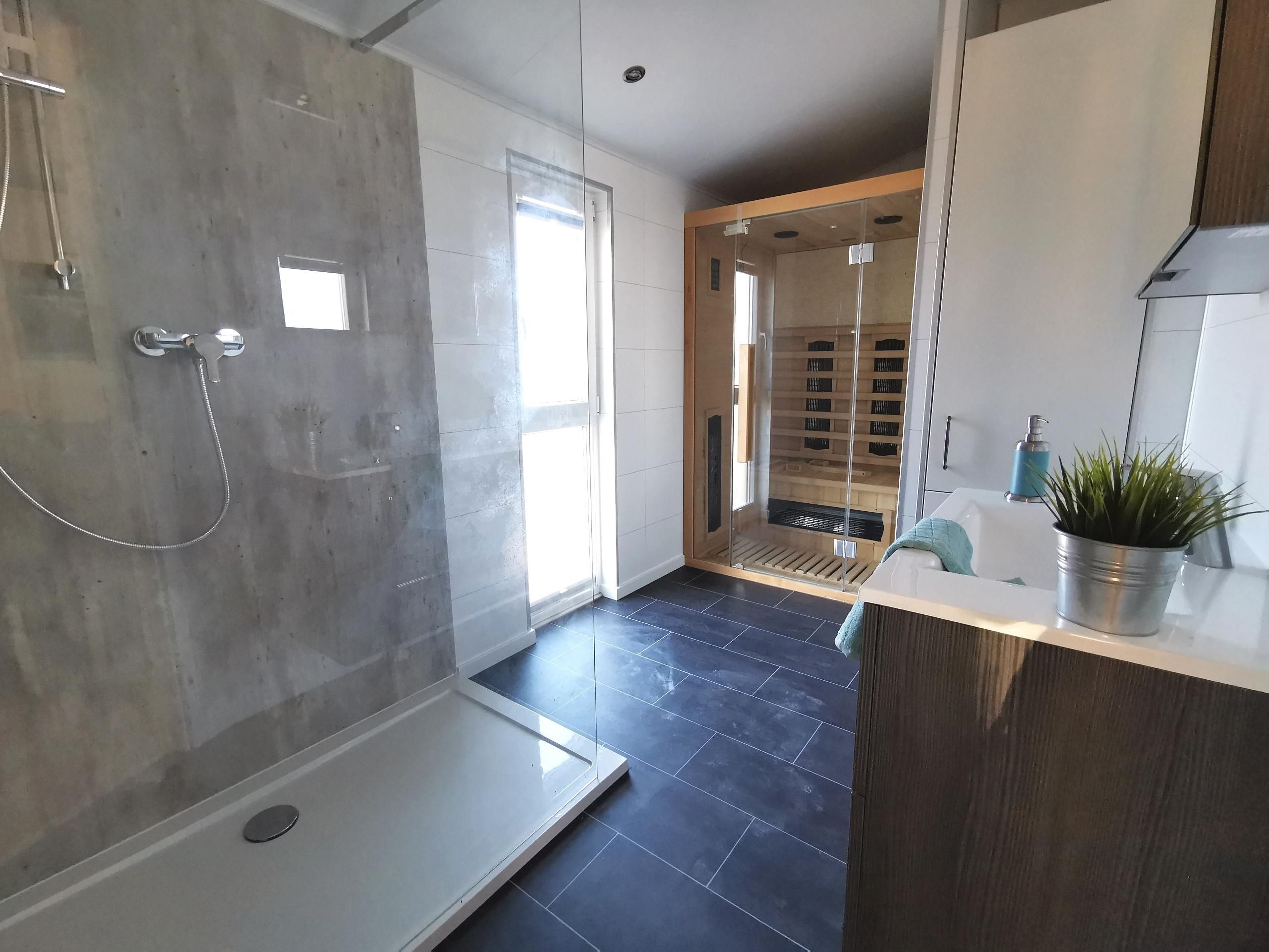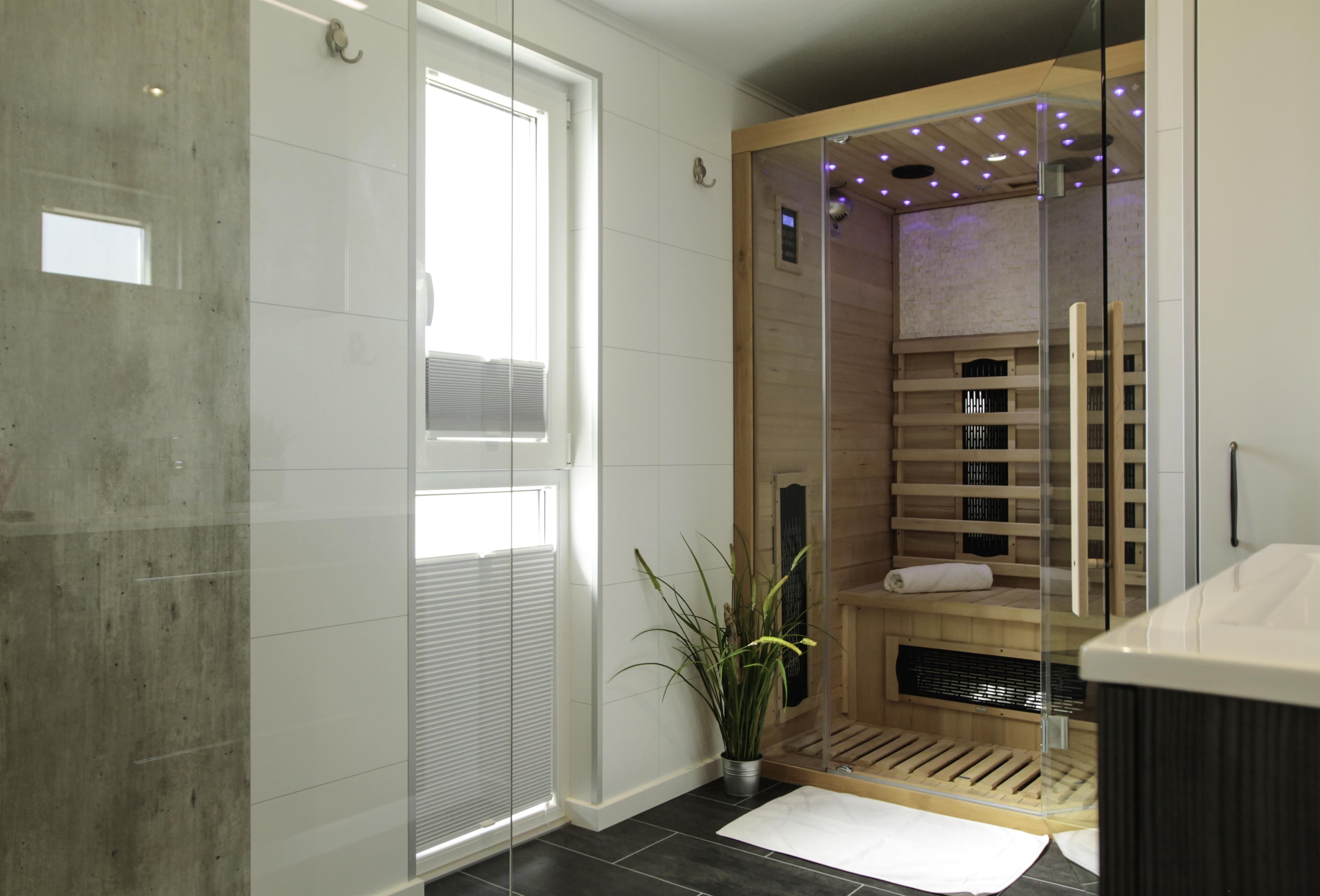 - Bad: großzügiges Bad mit bodenebener Dusche, Handtuchheizung, Waschtisch, Spiegelschrank, Infrarotsauna, separates WC mit Handwaschbecken Terrasse: Teilüberdachung, Heißstrahler, Gartenmöbel, Strandkorb. Kein Sonnenschirm vorhanden!