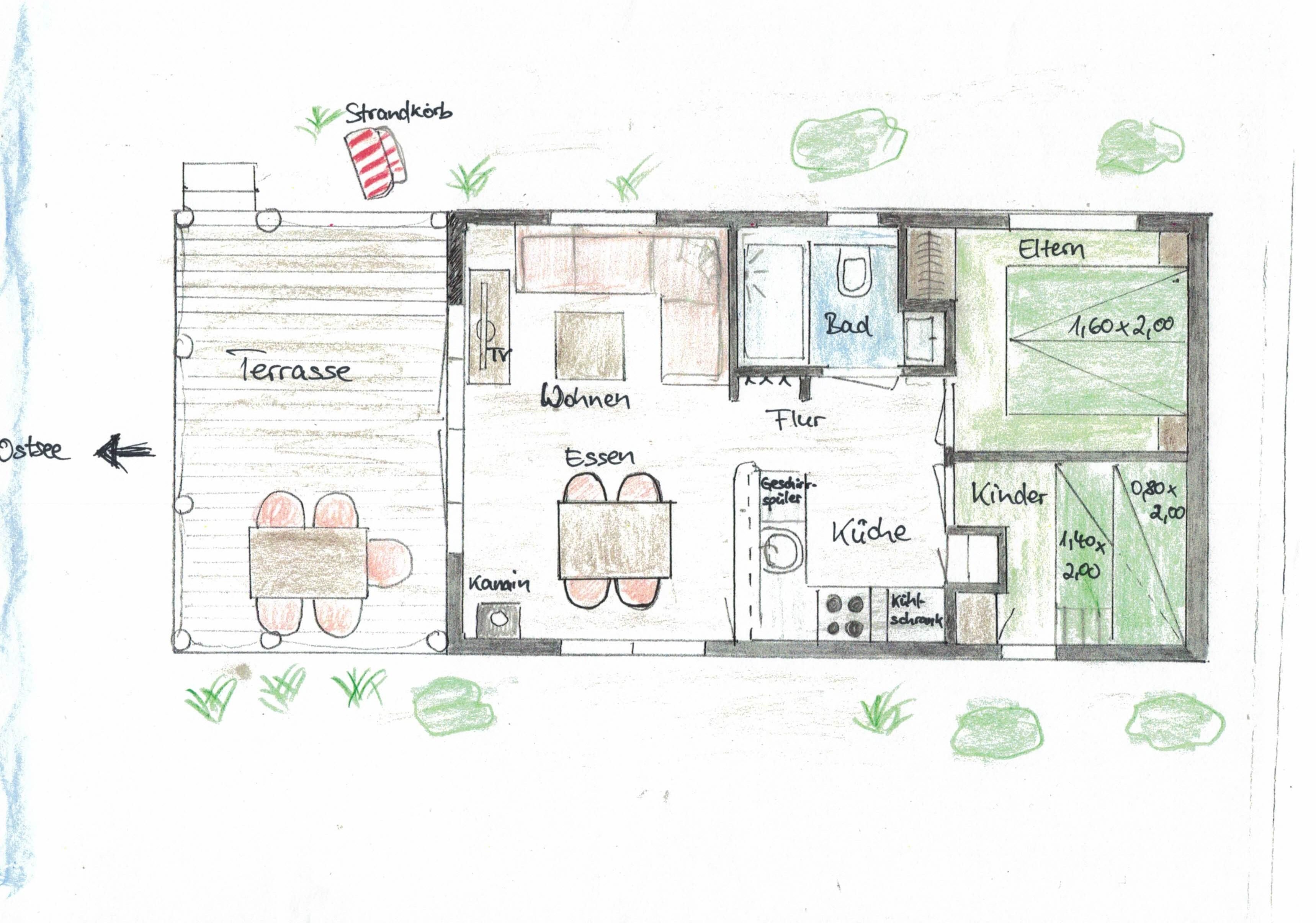 - Schlafzimmer 2: 1 Etagenbett für 3 Pers. (unteres Bett 140x200 cm, oberes ca. 80x200 cm)