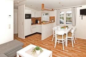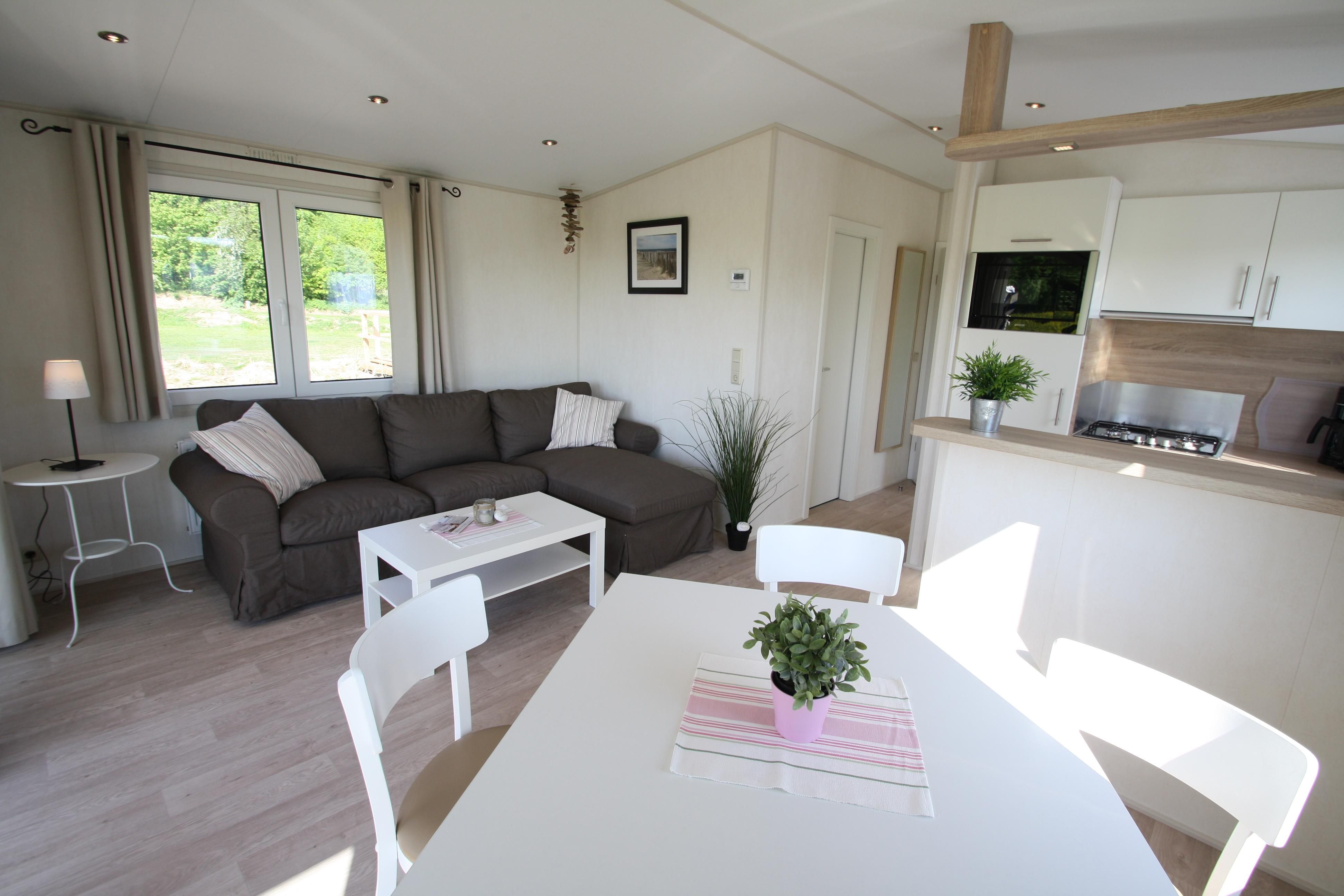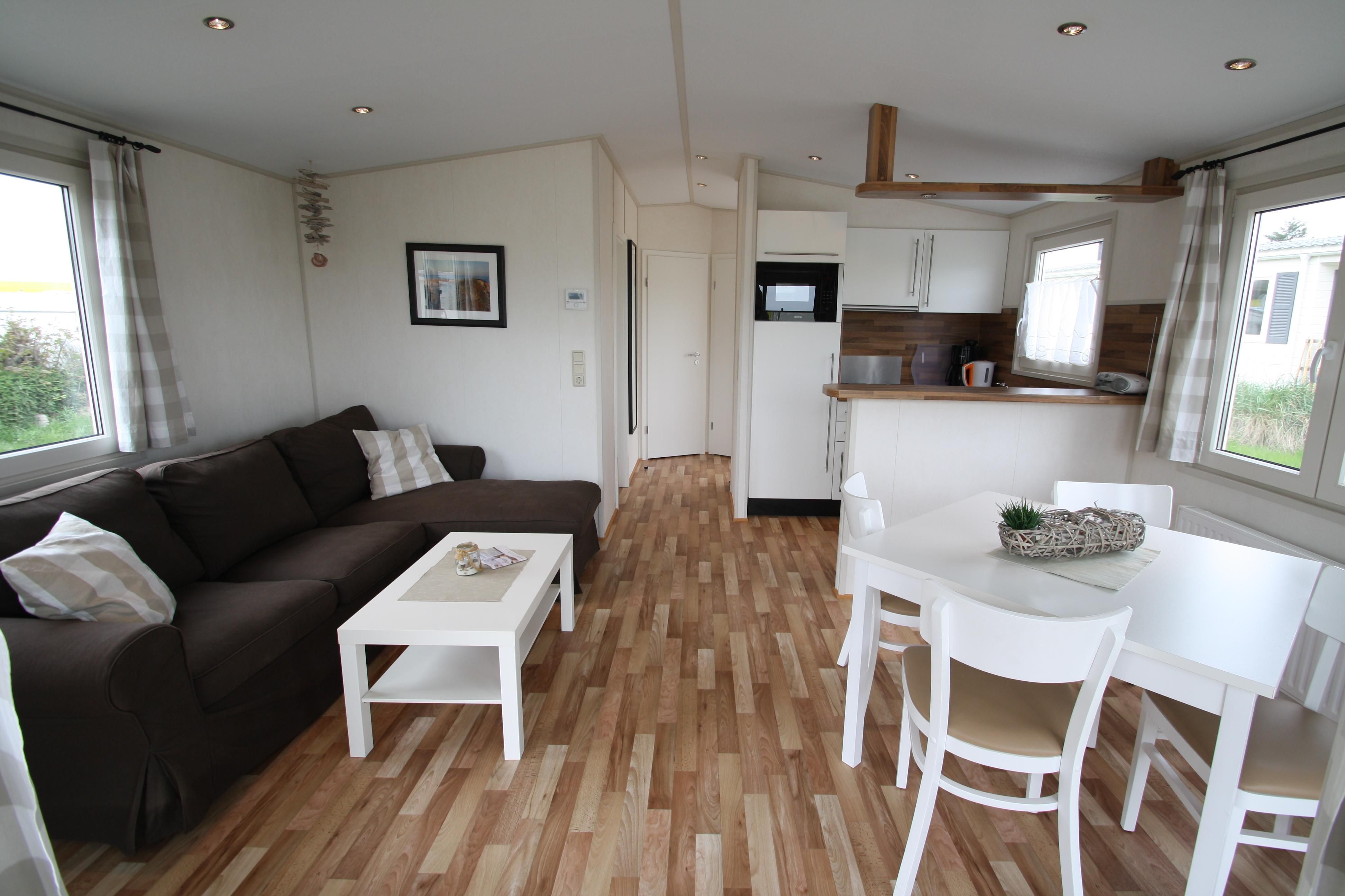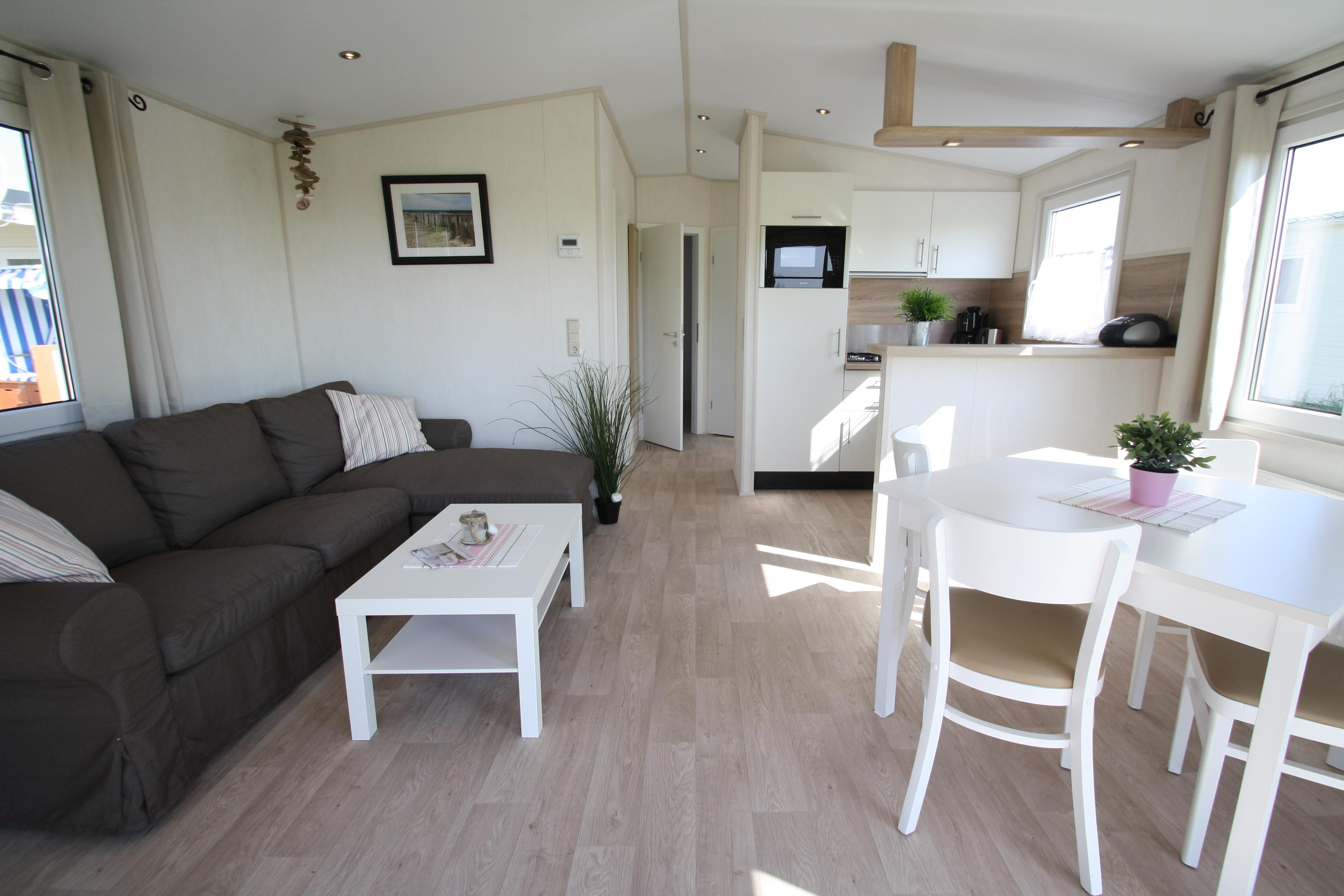 - Wohnzimmer: Esstisch, Sofaecke, TV Küche: großer Kühlschrank mit Gefrierfach, Kombi-Mikrowelle, Geschirrspülmaschine, Toaster, Wasserkocher, Filterkaffeemaschine, Ess-/Kochgeschirr