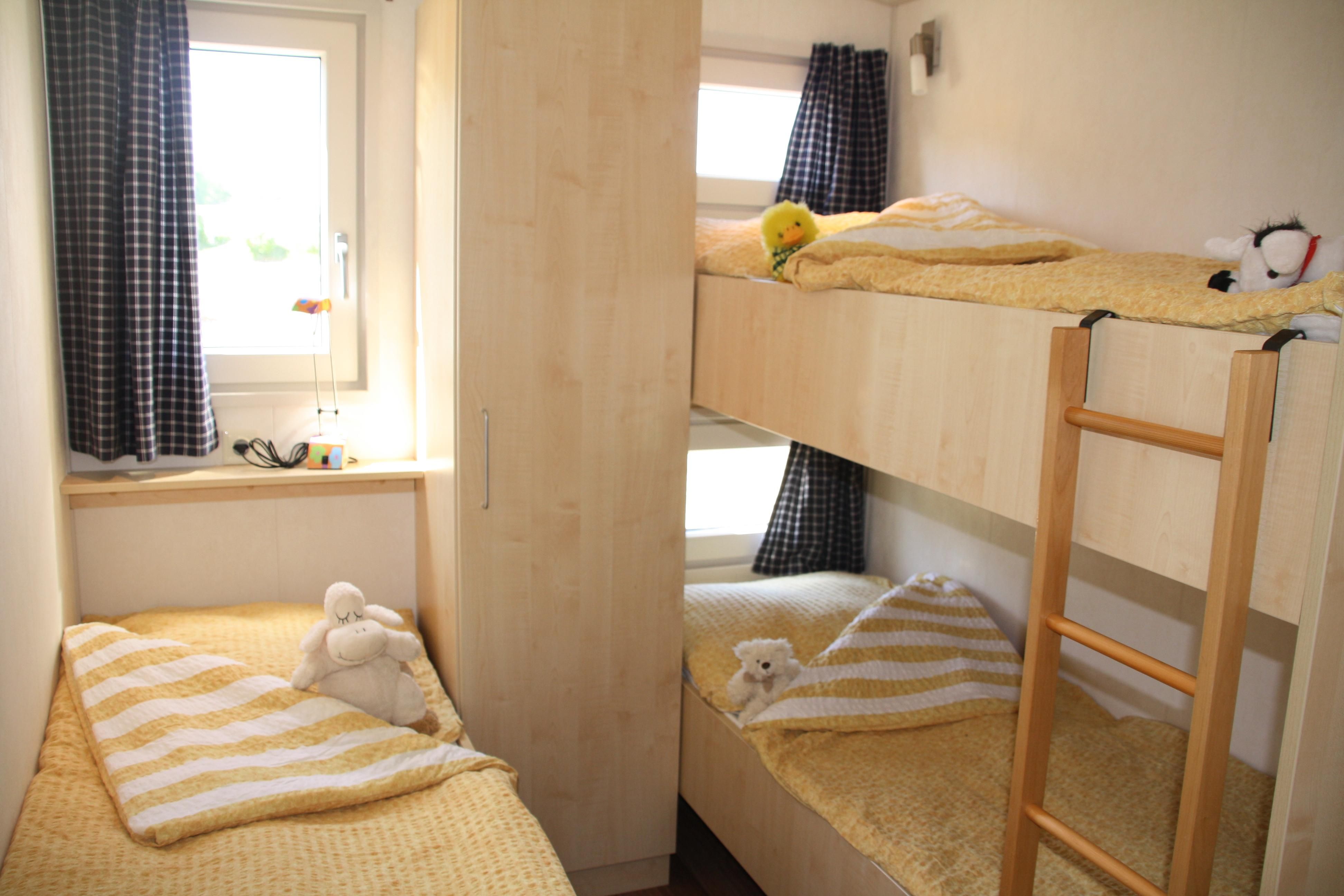 - Schlafzimmer 2: 1 Etagenbett (unten und oben je ca. 80x200 cm, 1 Einzelbett ca. 80x200 cm)