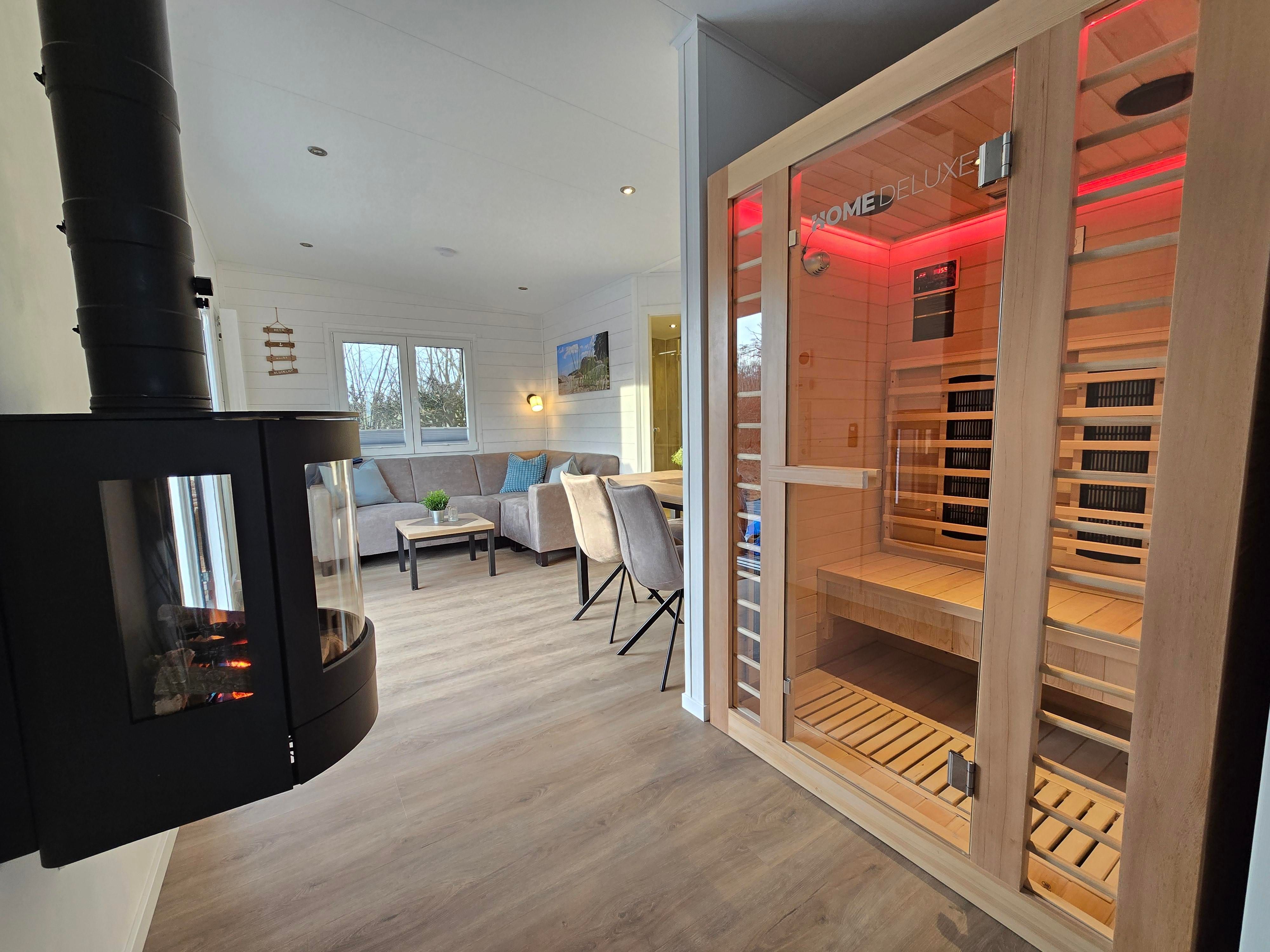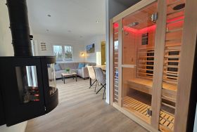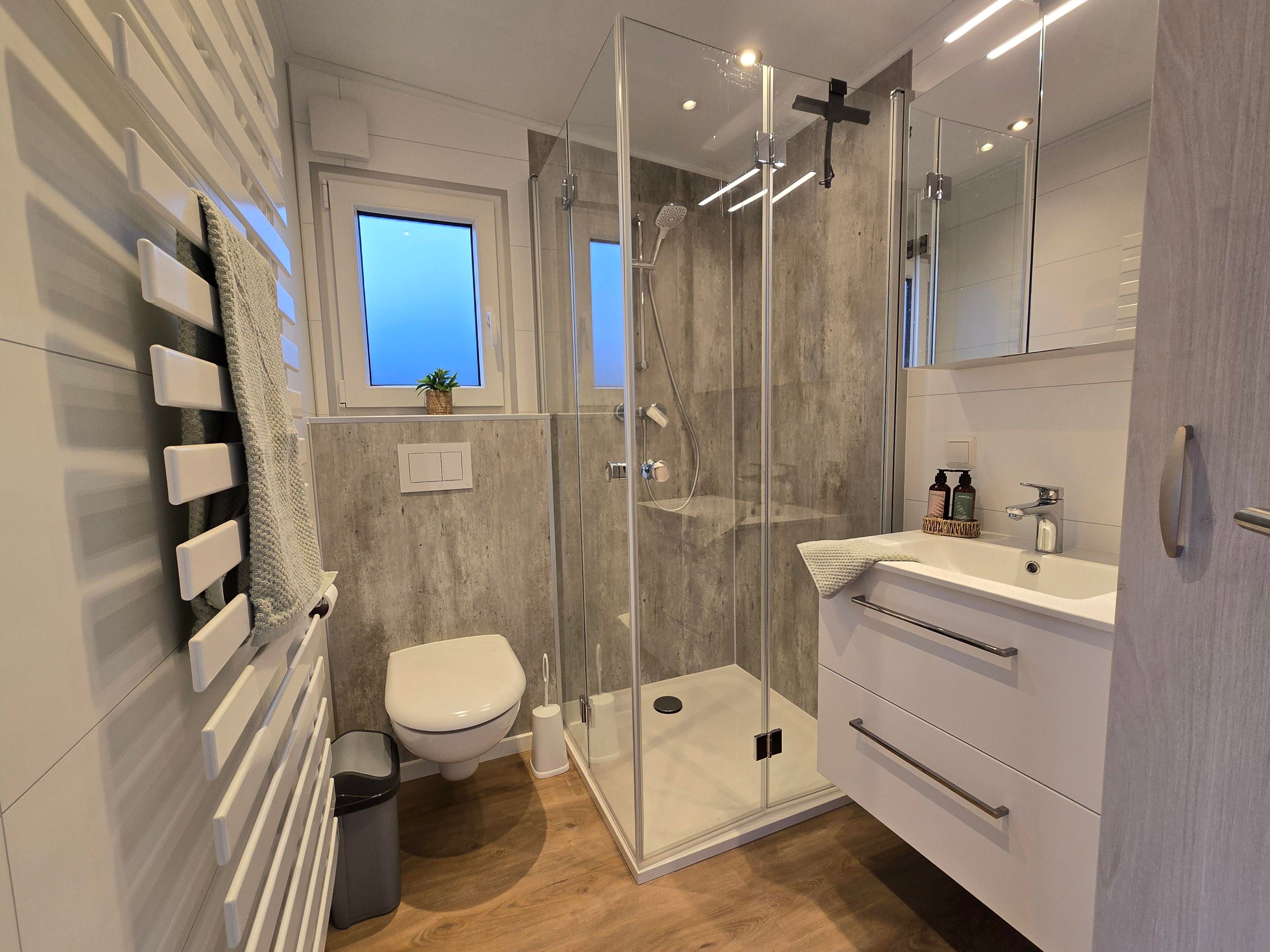 - Bad: großzügiges Bad mit bodenebener Dusche, Handtuchheizung, Waschtisch, Spiegelschrank, Infrarotsauna, separates WC