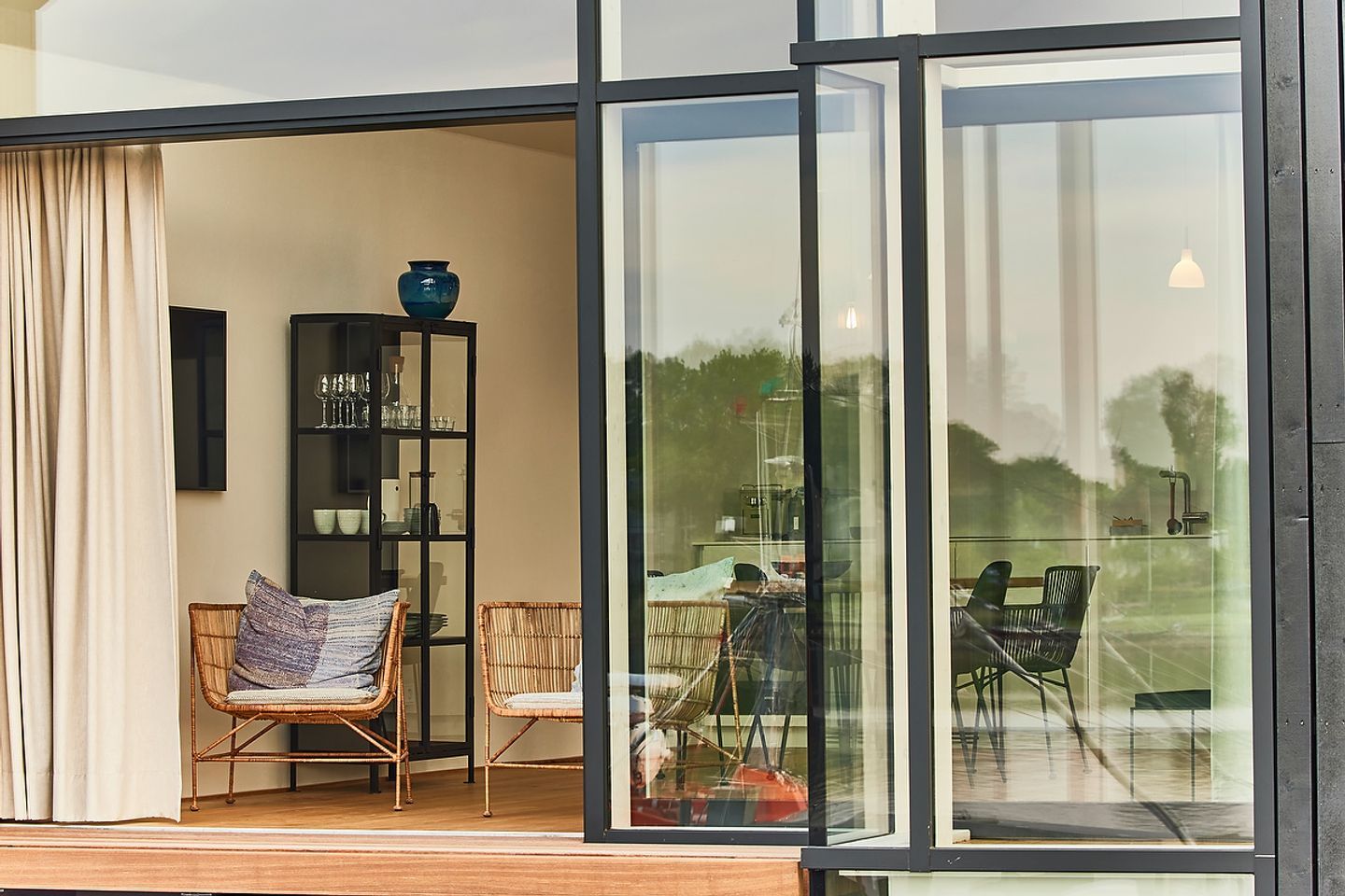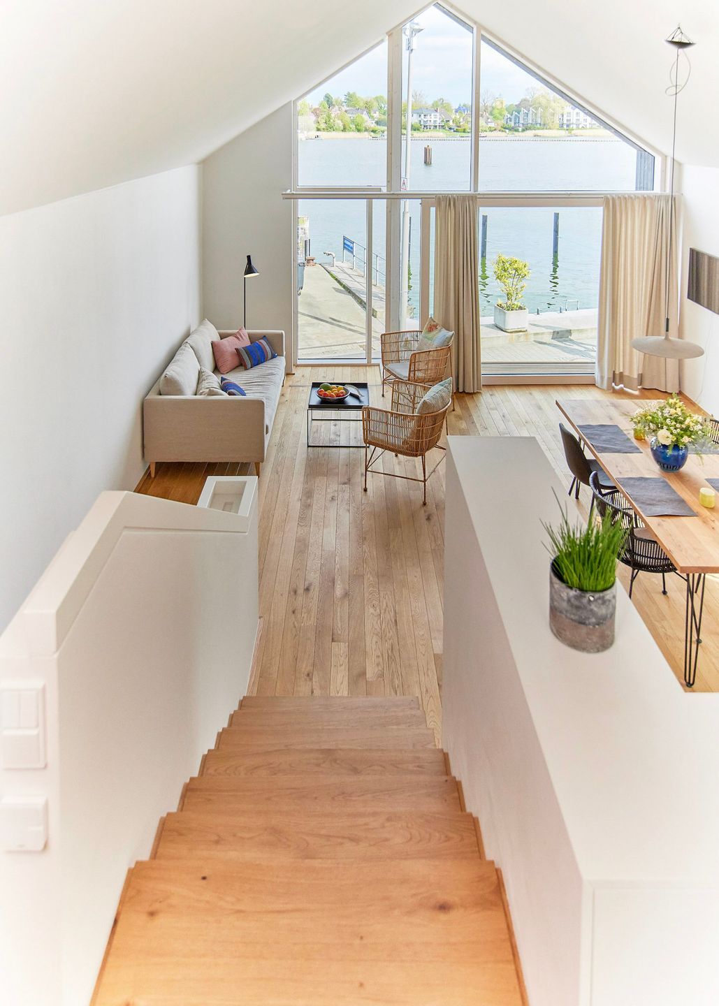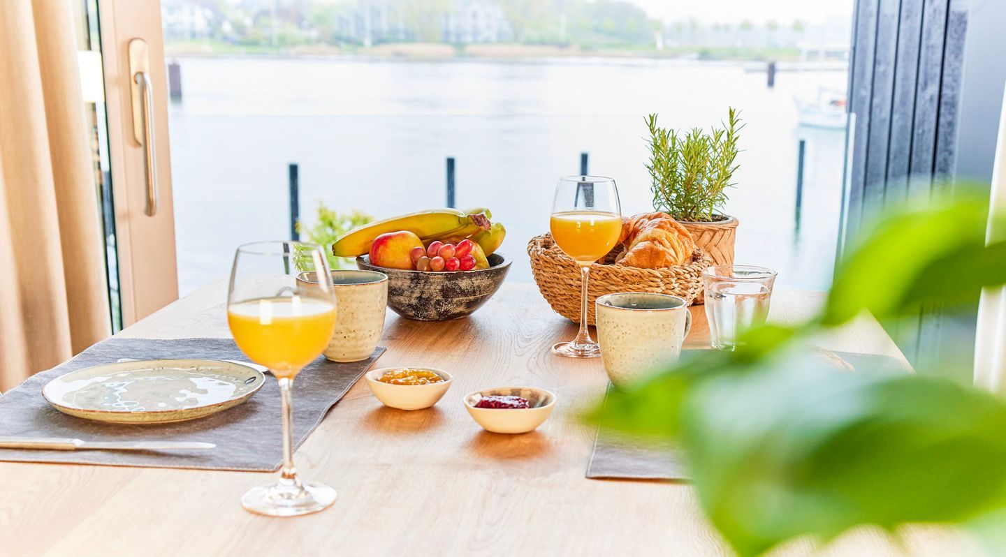 Das Herzstück Ihrer Unterkunft ist der großzügige Wohn- und Essbereich, der durch eine riesige Panorama-Glasfront eine direkte Verbindung zum Wasser schafft. Ein besonderes Highlight: Wenn Sie das große Fensterelement weit öffnen, holen Sie sich die frische Brise und die Hafenatmosphäre direkt ins Wohnzimmer. Ob beim Frühstück oder mit einem Glas Wein am Abend – von diesem Logenplatz aus erleben Sie die Schlei hautnah. Die Kombination aus hochwertigen Echtholzböden und klarem Design sorgt für ein gemütliches Ambiente.