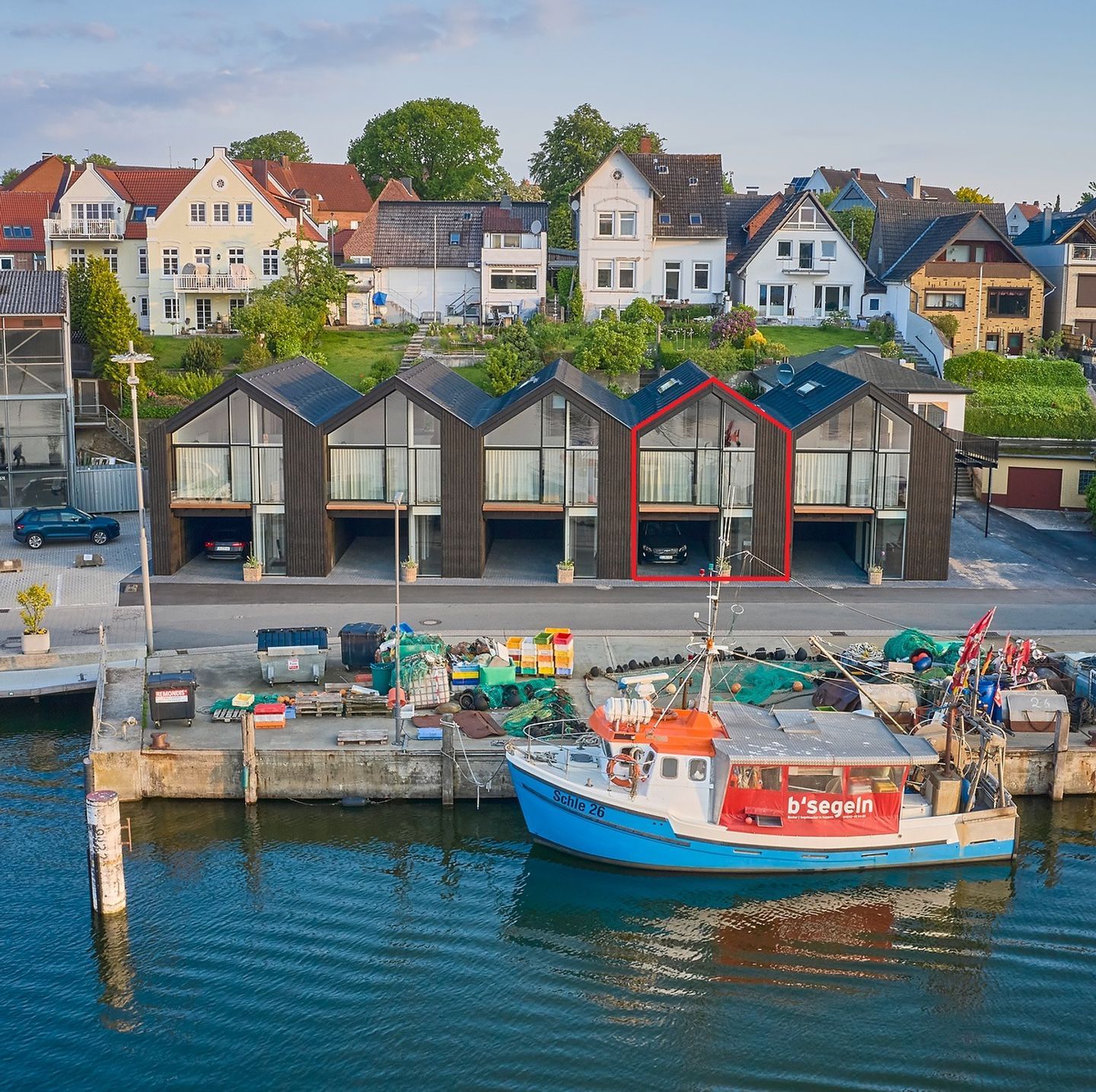 Starten Sie den Tag mit dem Blick über das Wasser und beobachten Sie, wie der Fischereihafen langsam wach wird. Der Netzschuppen in Kappeln ist ein gemütlicher Rückzugsort, der modernes Wohnen und nordische Freiheit perfekt verbindet. Das markante Gebäude liegt direkt an der Wasserkante und ist von der Form historischer Fischerhütten inspiriert. In diesen modernen Ferienhäusern erwartet Sie eine tolle Zeit direkt an der See. Die offene, helle Gestaltung bringt das maritime Lebensgefühl direkt zu Ihnen nach Hause. Ihr Aufenthalt beginnt ganz entspannt: Ein privater Parkplatz befindet sich direkt vor der Tür, sodass Sie Ihr Gepäck bequem ausladen und sofort in den Urlaubsmodus schalten können.