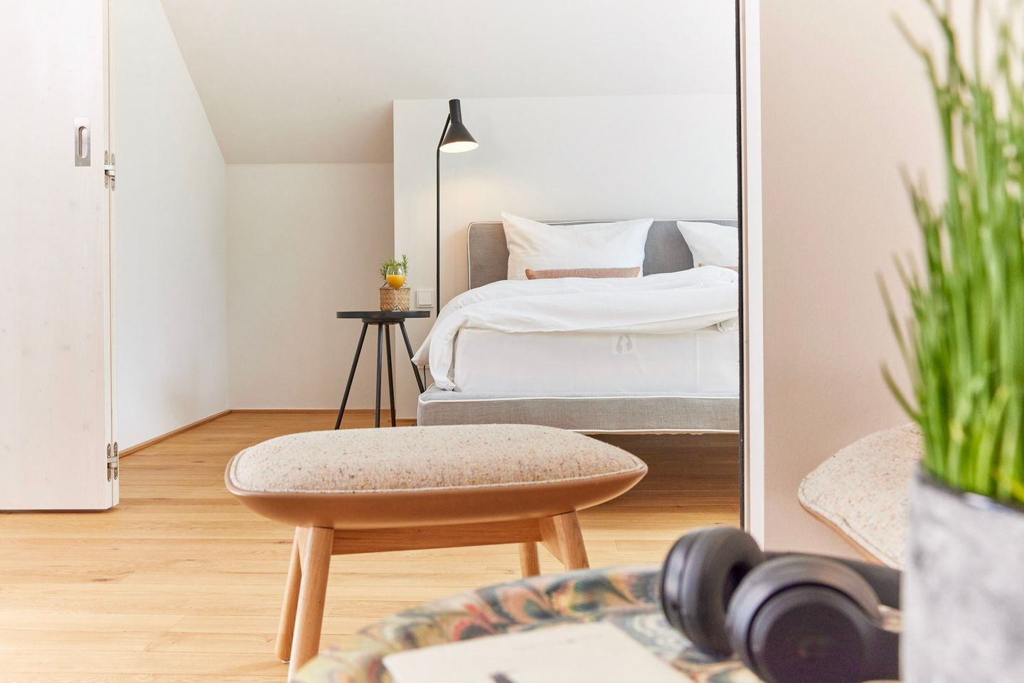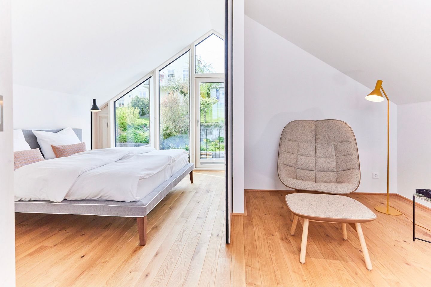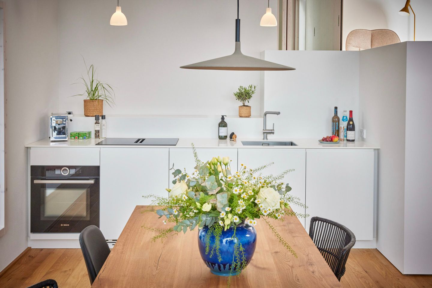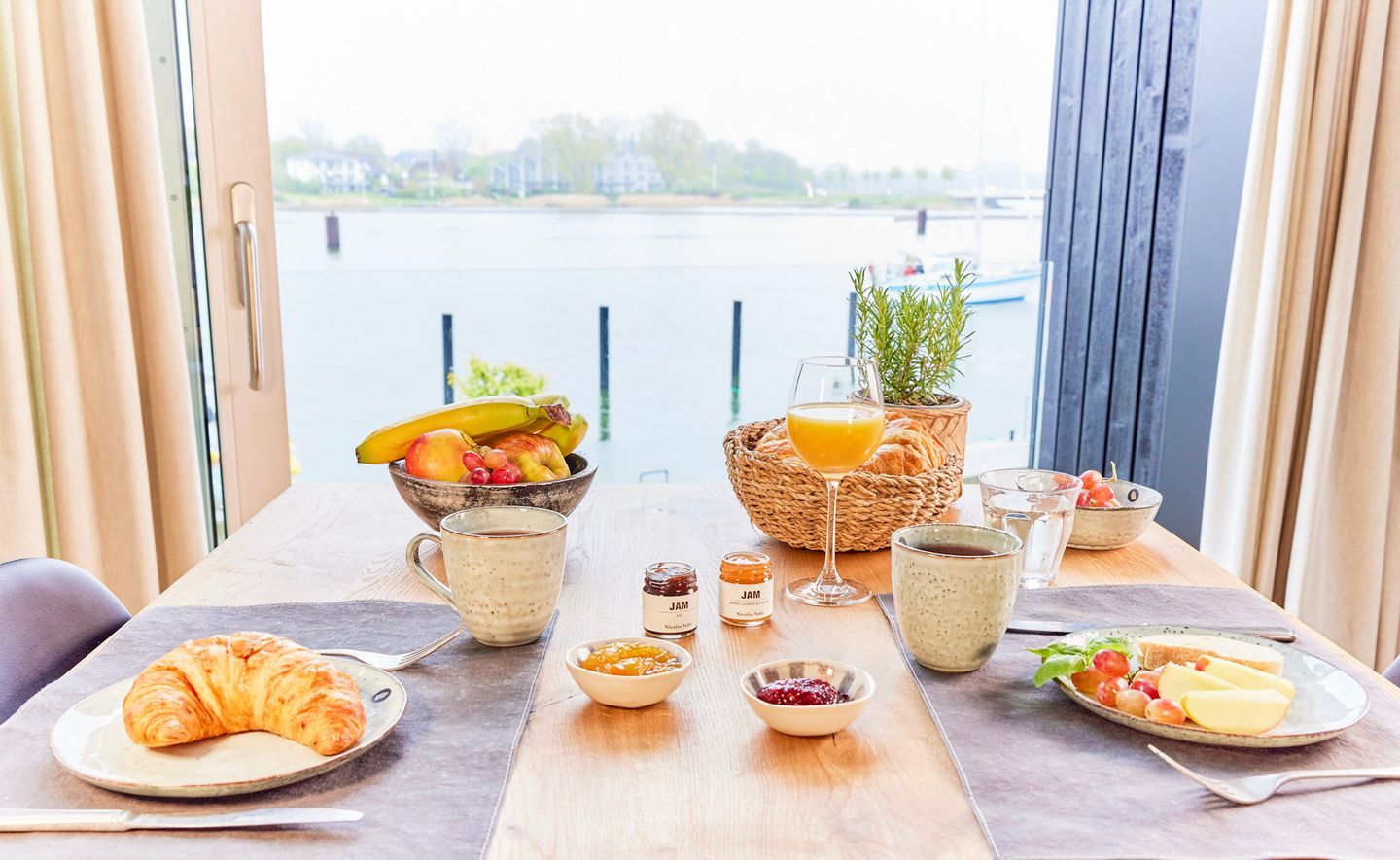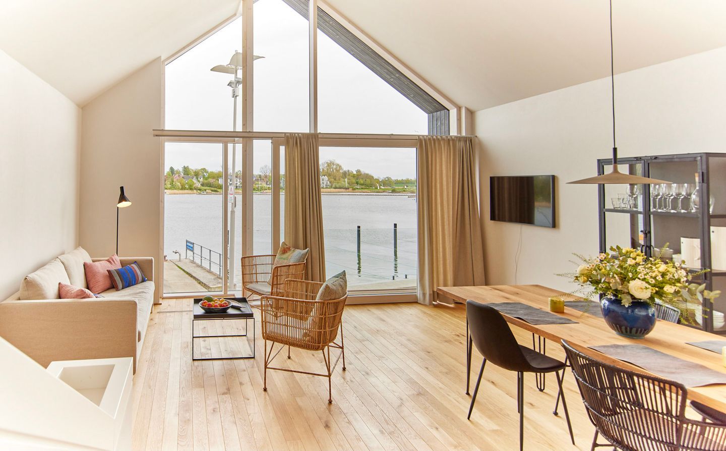 Das Herzstück Ihrer Unterkunft ist der großzügige Wohn- und Essbereich, der durch eine riesige Panorama-Glasfront eine direkte Verbindung zum Wasser schafft. Ein besonderes Highlight: Wenn Sie das große Fensterelement weit öffnen, holen Sie sich die frische Brise und die Hafenatmosphäre direkt ins Wohnzimmer. Ob beim Frühstück oder mit einem Glas Wein am Abend – von diesem Logenplatz aus erleben Sie die Schlei hautnah. Die Kombination aus hochwertigen Echtholzböden und klarem Design sorgt für ein gemütliches Ambiente.