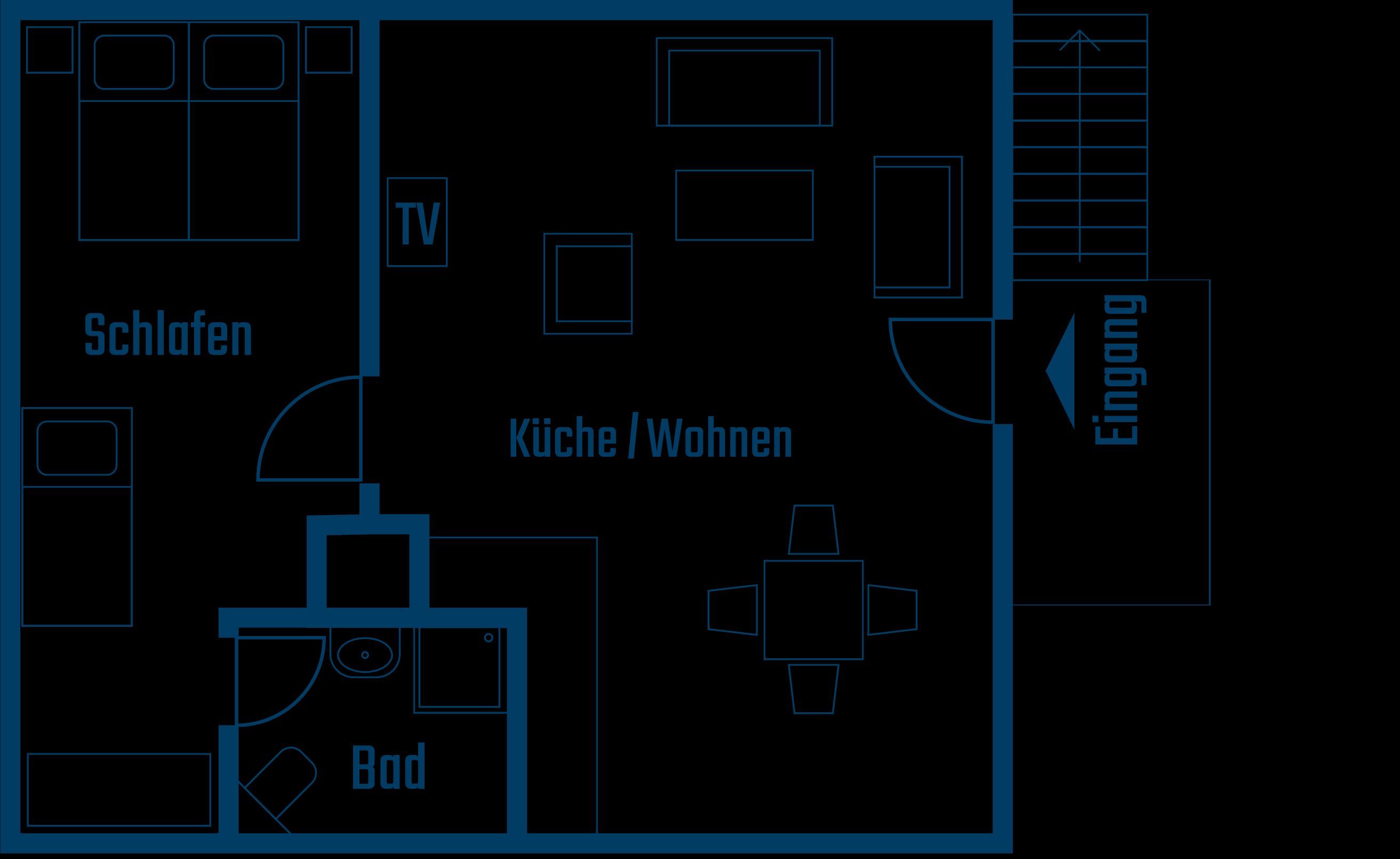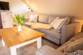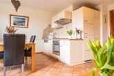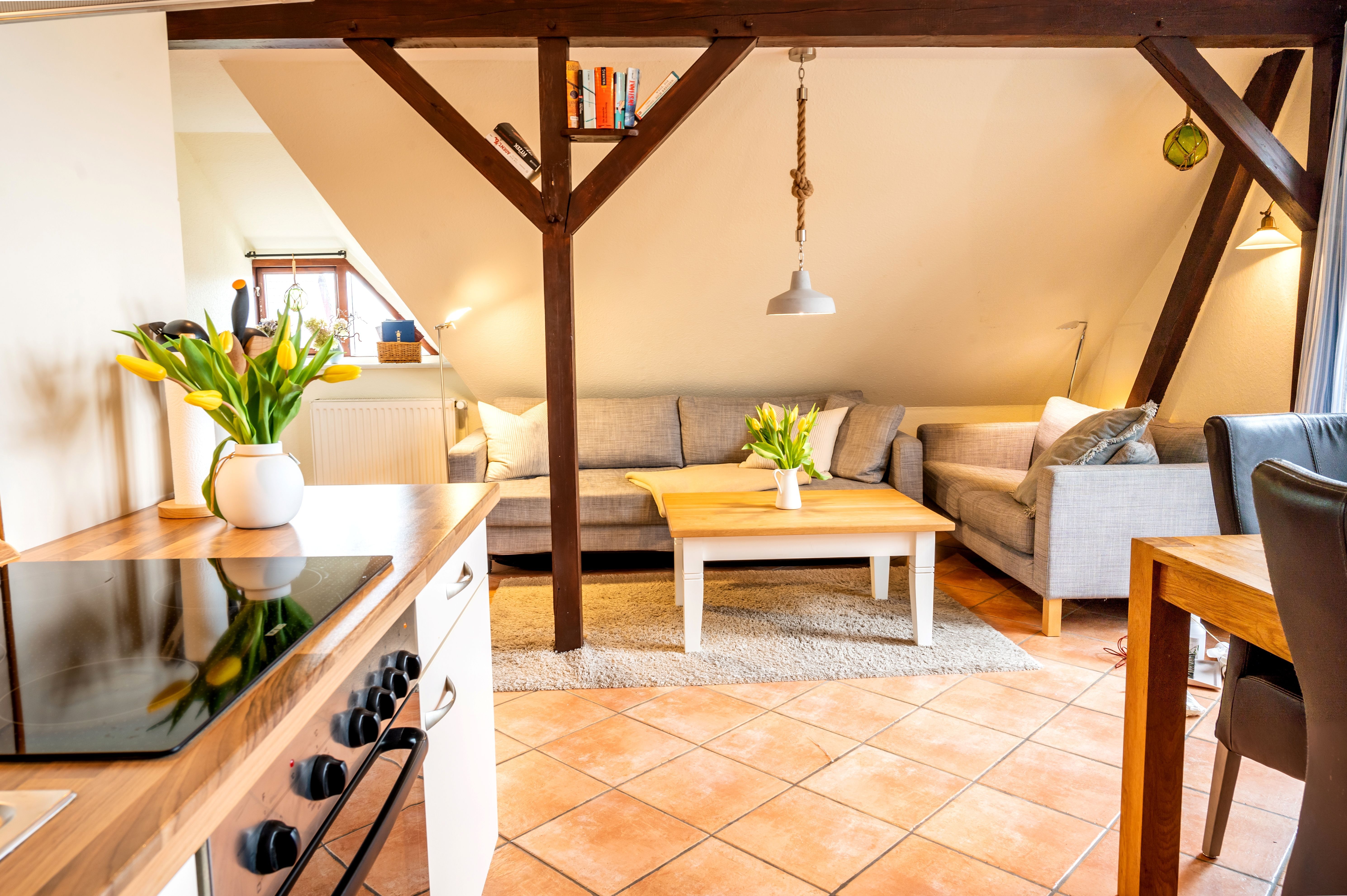 Der zentrale Wohnbereich kombiniert Wohnen, Essen und Kochen in einem offenen Raum. Hier befindet sich eine komfortable Eckcouch (seit 2026), die zum Entspannen einlädt. Eine Schlafmöglichkeit im Wohnzimmer gibt es nicht. Ein Esstisch mit Platz für bis zu vier Personen verbindet den Wohnbereich mit der vollständig ausgestatteten Einbauküche. Zur Küchenausstattung gehören unter anderem Ceranfeld, Backofen, Geschirrspüler, Kühlschrank mit Gefrierfach, Filterkaffeemaschine, Kapselmaschine, Wasserkocher und Toaster. Ein besonderes Ausstattungsmerkmal ist die Maunawai Hausfilteranlage, durch die Gäste jederzeit frisch gefiltertes und mineralisiertes Trinkwasser direkt aus dem Wasserhahn genießen können.