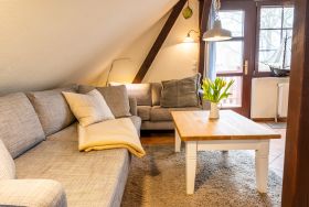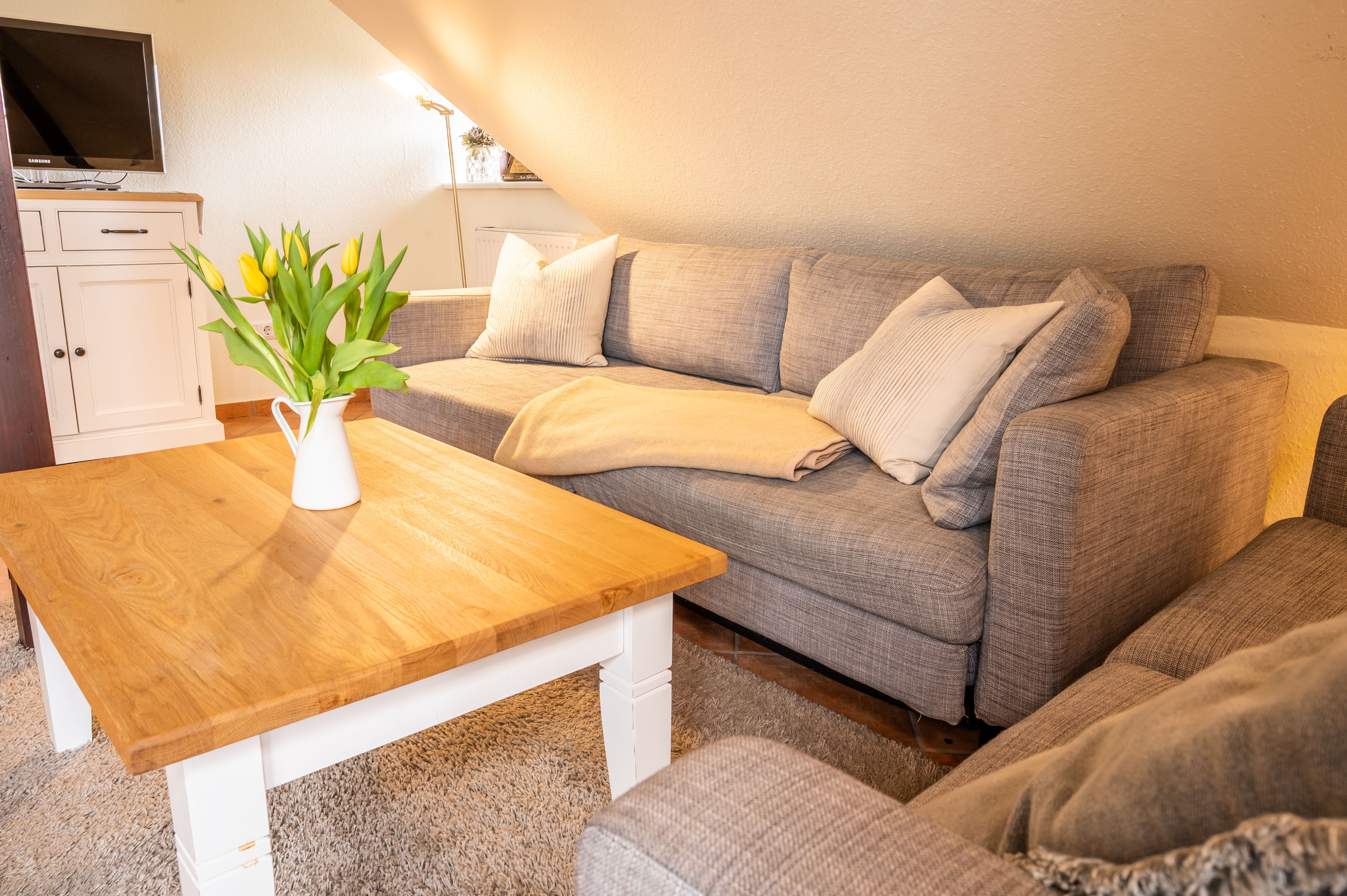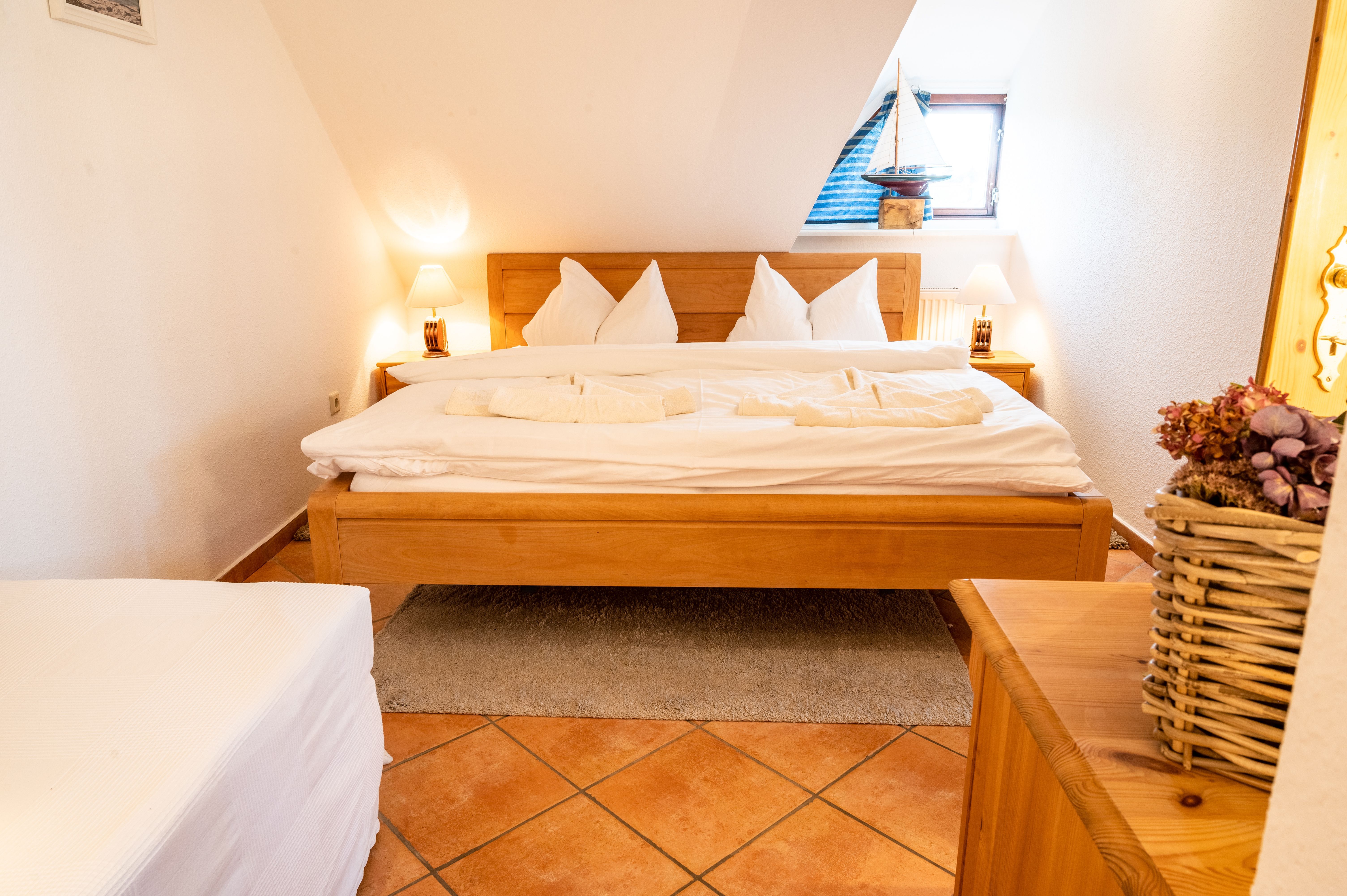 Das separate Schlafzimmer verfügt über ein Echtholzdoppelbett mit hochwertigen Naturmatratzen aus Rosshaar und Schafwolle sowie einem Bonnell Federkern, die für ein angenehmes Schlafklima sorgen. Für eine dritte Person steht im Schlafzimmer ein zusätzliches Einzelbett zur Verfügung. Ein großer Kleiderschrank in der Dachschräge sowie eine Echtholzkommode bieten ausreichend Stauraum.