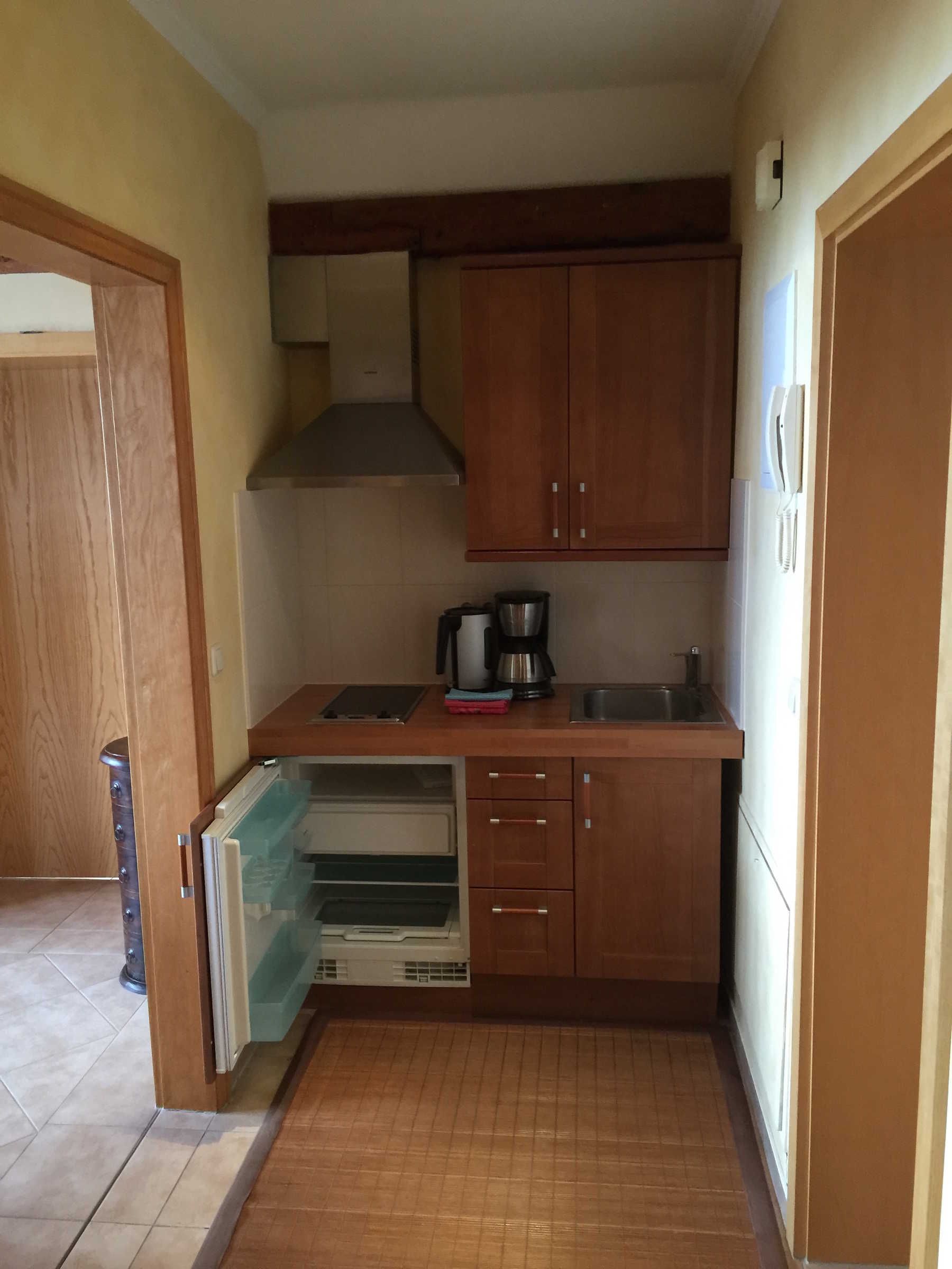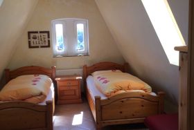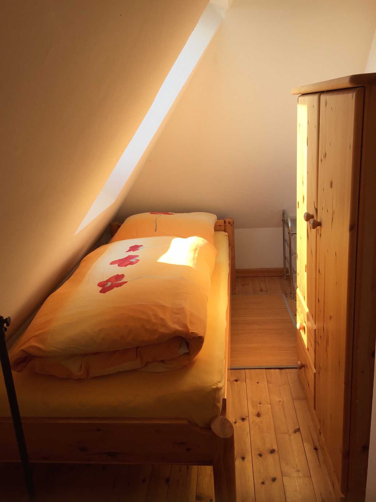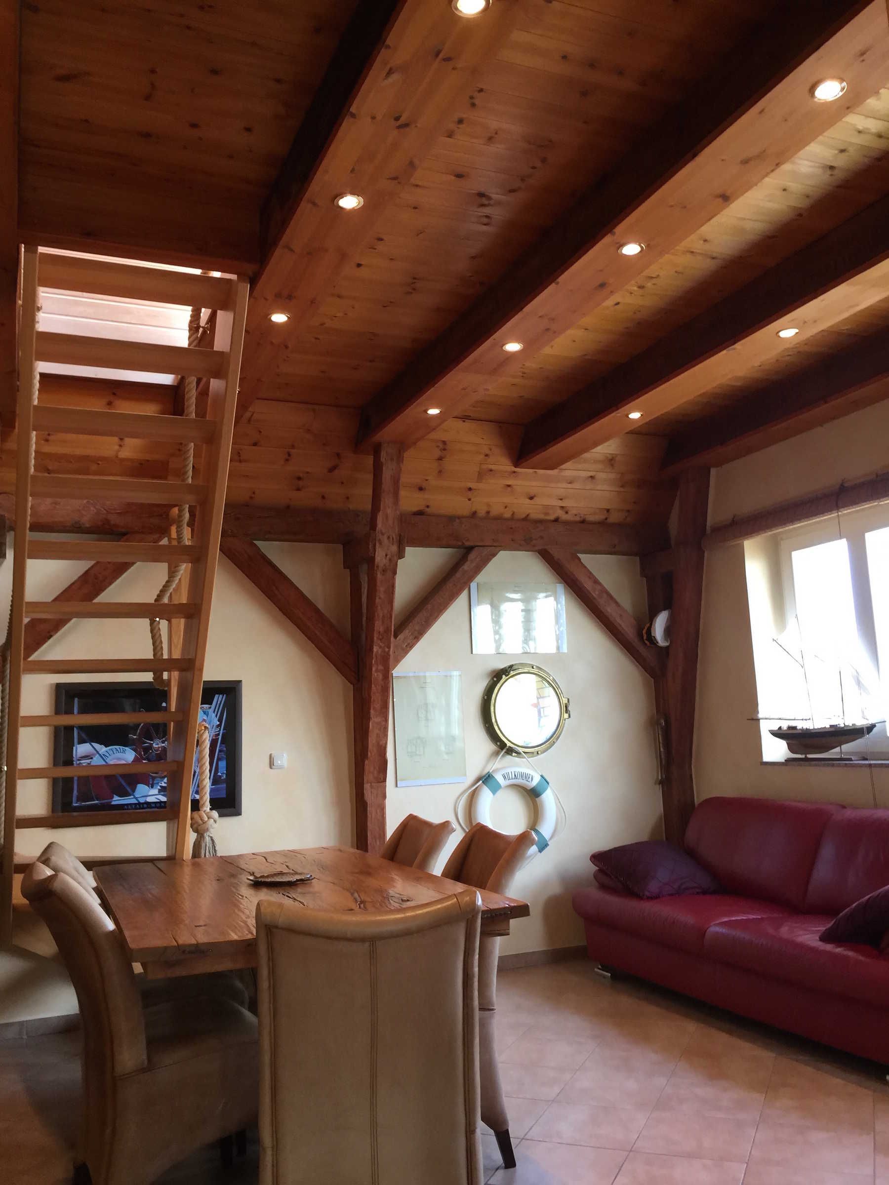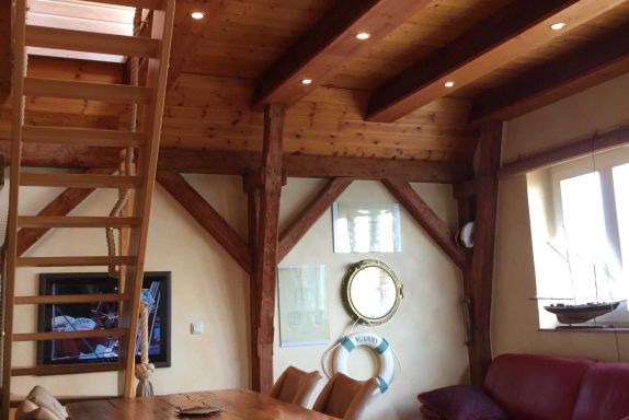 Die kleine Küche/Kitchenette ist mit dem üblichen Geschirr/Besteck etc. ausgestattet. Im Bad befindet sich eine Dusche, die auch als Dampfdusche genutzt werden kann mit zwei Holzsitzen, sowie eine Badewanne. Des Weiteren ist eine Waschmaschine vorhanden. Es gibt drei Schlafzimmer: Ein abschliessbares Zimmer mit zwei Einzelbetten, sowie im oberen offenen Maissonettebereich ein Doppelbett, daneben eine kleine abschliessbare Kammer mit einem Einzelbett. Bettwäsche und Handtücher werden bereitgestellt. Hierfür werden bei Buchung automatisch pro Aufenthalt und Person einmalig 25,00 € berechnet.