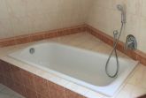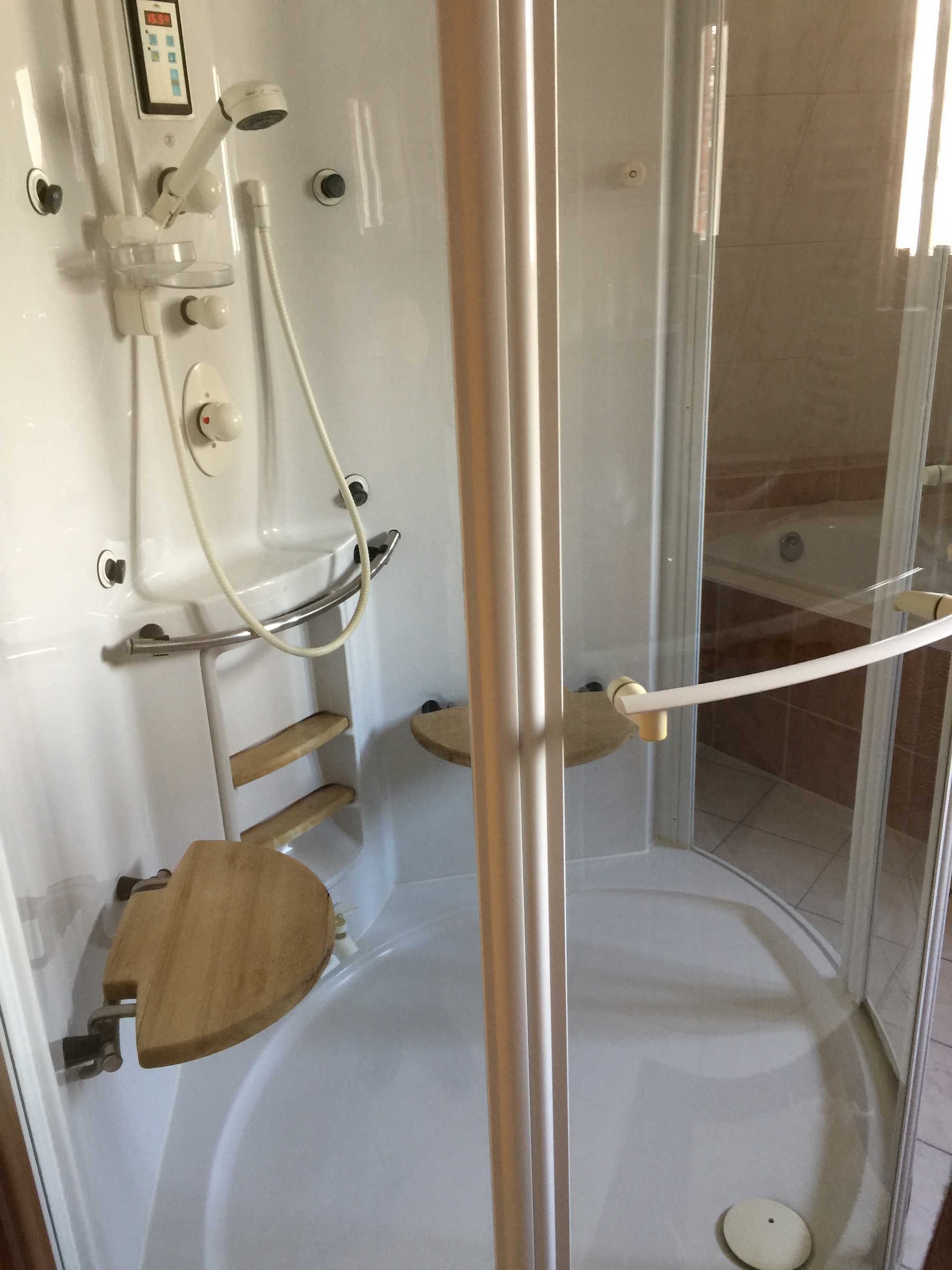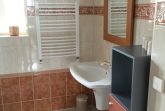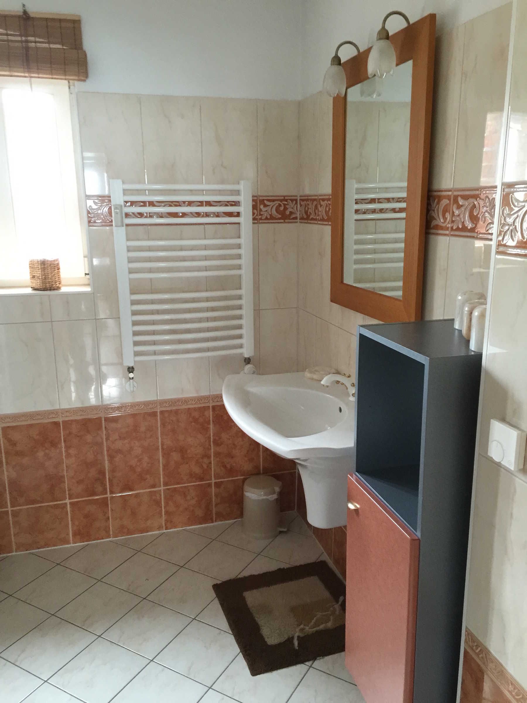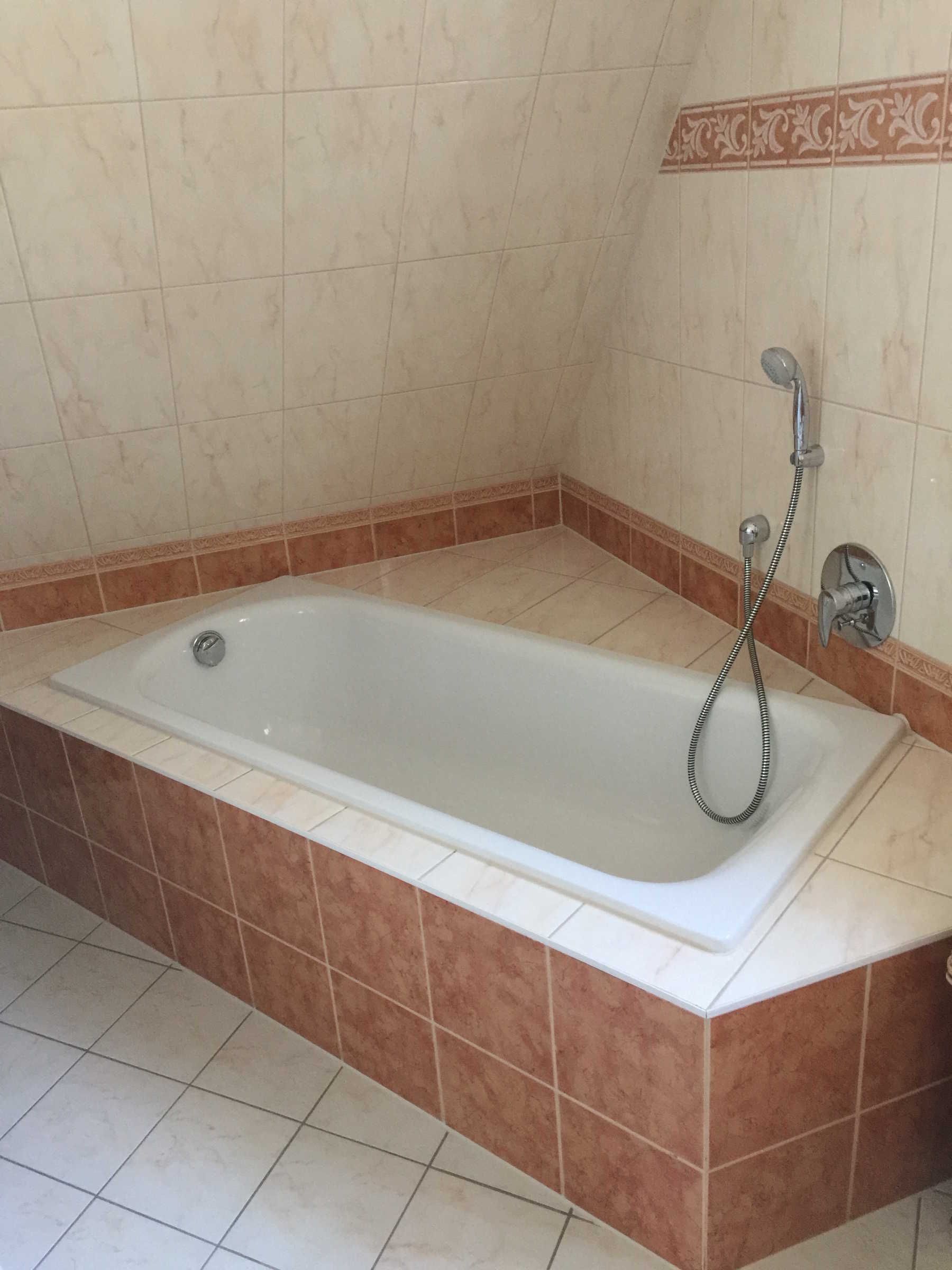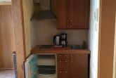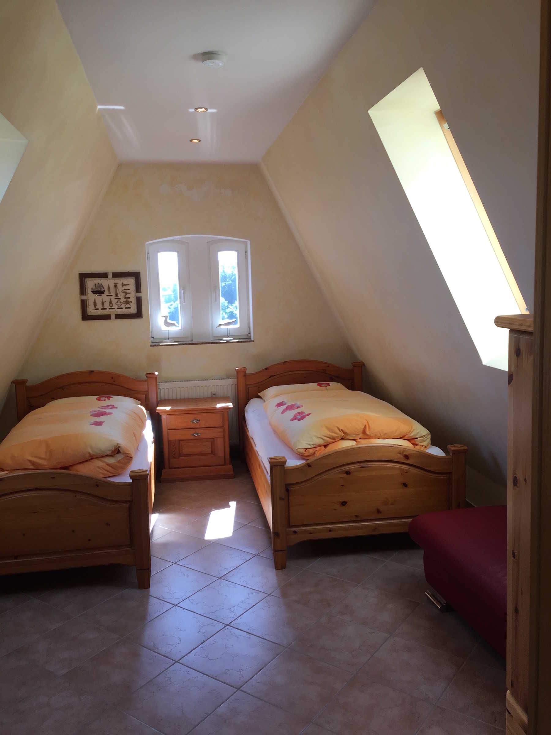 Die kleine Küche/Kitchenette ist mit dem üblichen Geschirr/Besteck etc. ausgestattet. Im Bad befindet sich eine Dusche, die auch als Dampfdusche genutzt werden kann mit zwei Holzsitzen, sowie eine Badewanne. Des Weiteren ist eine Waschmaschine vorhanden. Es gibt drei Schlafzimmer: Ein abschliessbares Zimmer mit zwei Einzelbetten, sowie im oberen offenen Maissonettebereich ein Doppelbett, daneben eine kleine abschliessbare Kammer mit einem Einzelbett. Bettwäsche und Handtücher werden bereitgestellt. Hierfür werden bei Buchung automatisch pro Aufenthalt und Person einmalig 25,00 € berechnet.