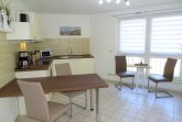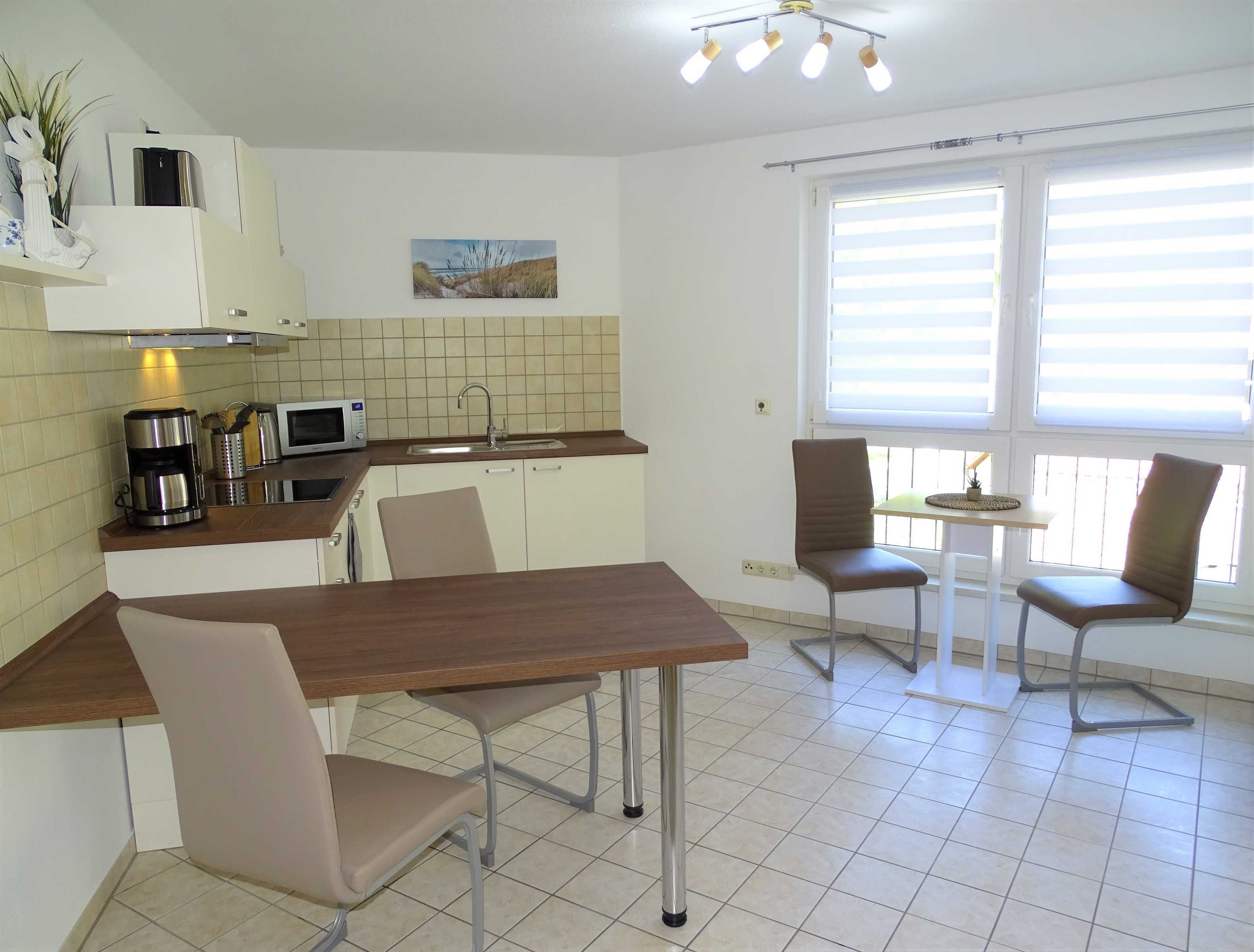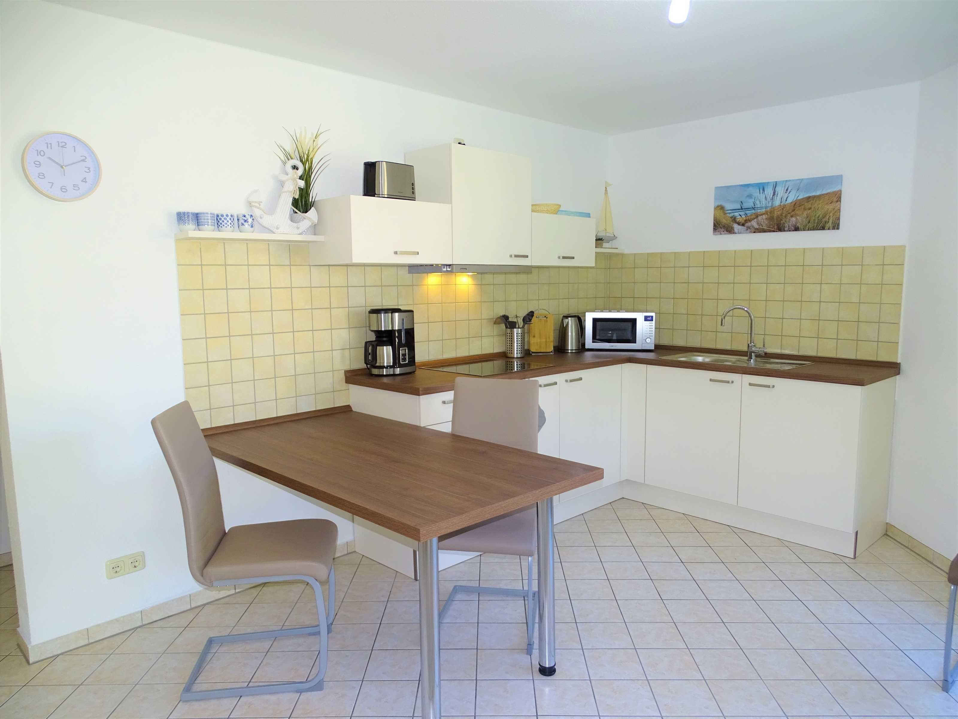 Die Küche beinhaltet einen Kühlschrank mit Gefrierfach, ein vier-Platten-Kochfeld und eine Mikrowelle. Zur Ausstattung der Küche gehören selbstverständlich Kaffeemaschine, Toaster, Wasserkocher und Geschirr für bis zu 4 Personen dazu.