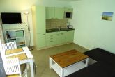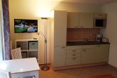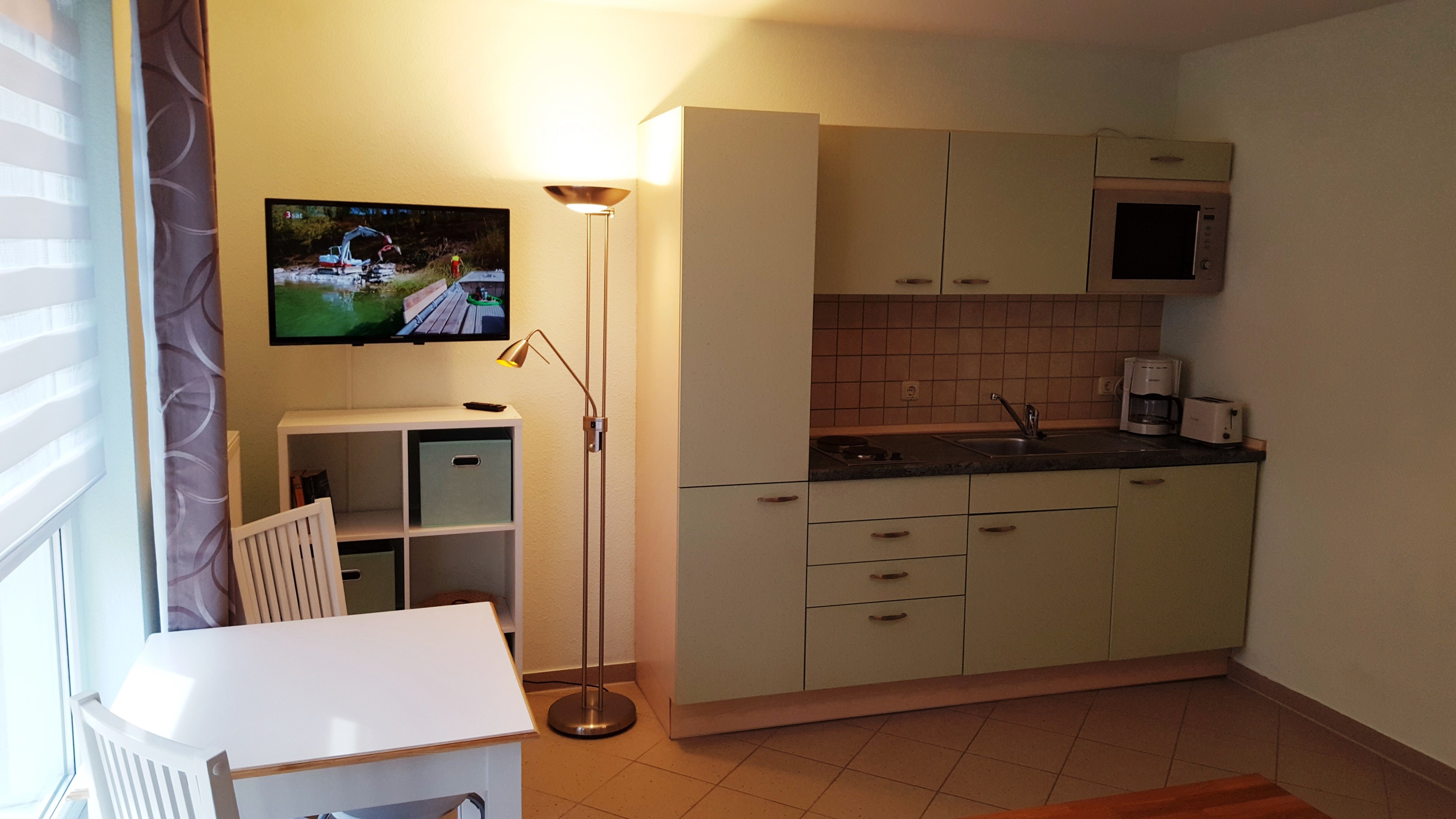 Die kleine Küchenzeile beinhaltet einen Kühlschrank mit Gefrierfach, ein zwei-Platten Kochfeld und eine Mikrowelle. Zur Ausstattung der Küche gehören selbstverständlich Kaffeemaschine, Toaster, Wasserkocher und Geschirr für bis zu 3 Personen dazu.