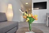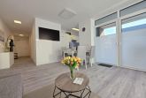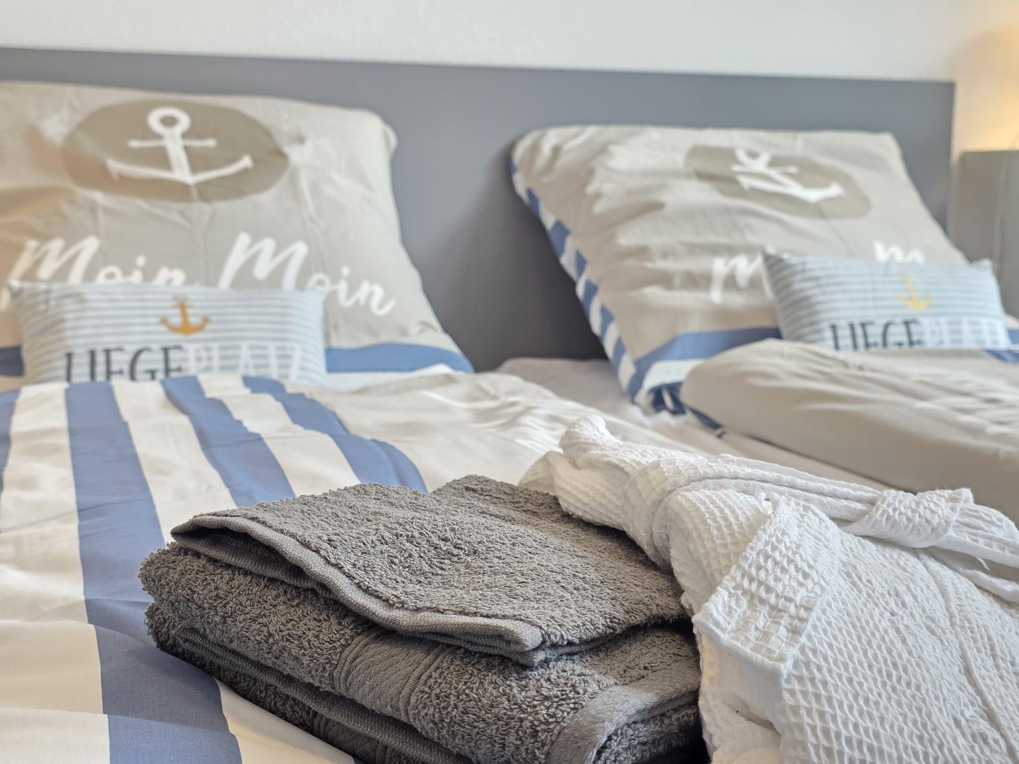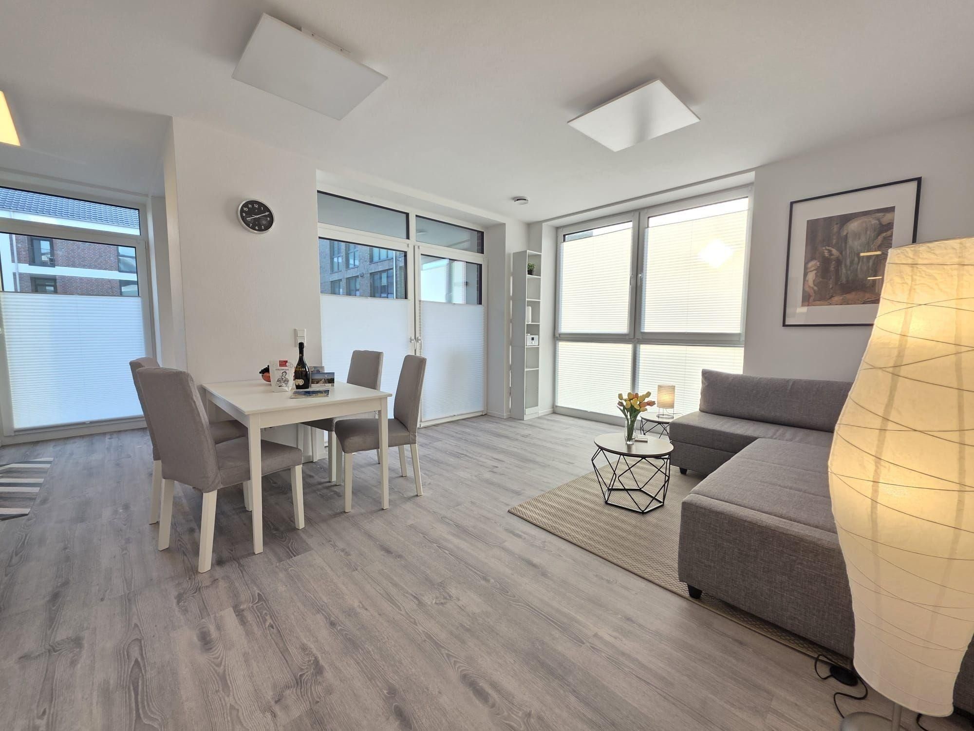Der helle Wohnbereich enthält eine große Sofalandschaft, die bei Bedarf als zusätzliche Schlafmöglichkeit genutzt werden kann, sowie einen Esstisch und eine moderne, voll ausgestattete Küche. Die große Terrasse mit seitlichem Blick auf das Norder Tief lädt zu entspannten Stunden im Freien ein. Die Innenstadt von Norden ist fußläufig erreichbar, was die Ferienwohnung NordTroll zu einem idealen Ausgangspunkt für einen erholsamen Nordseeurlaub macht.