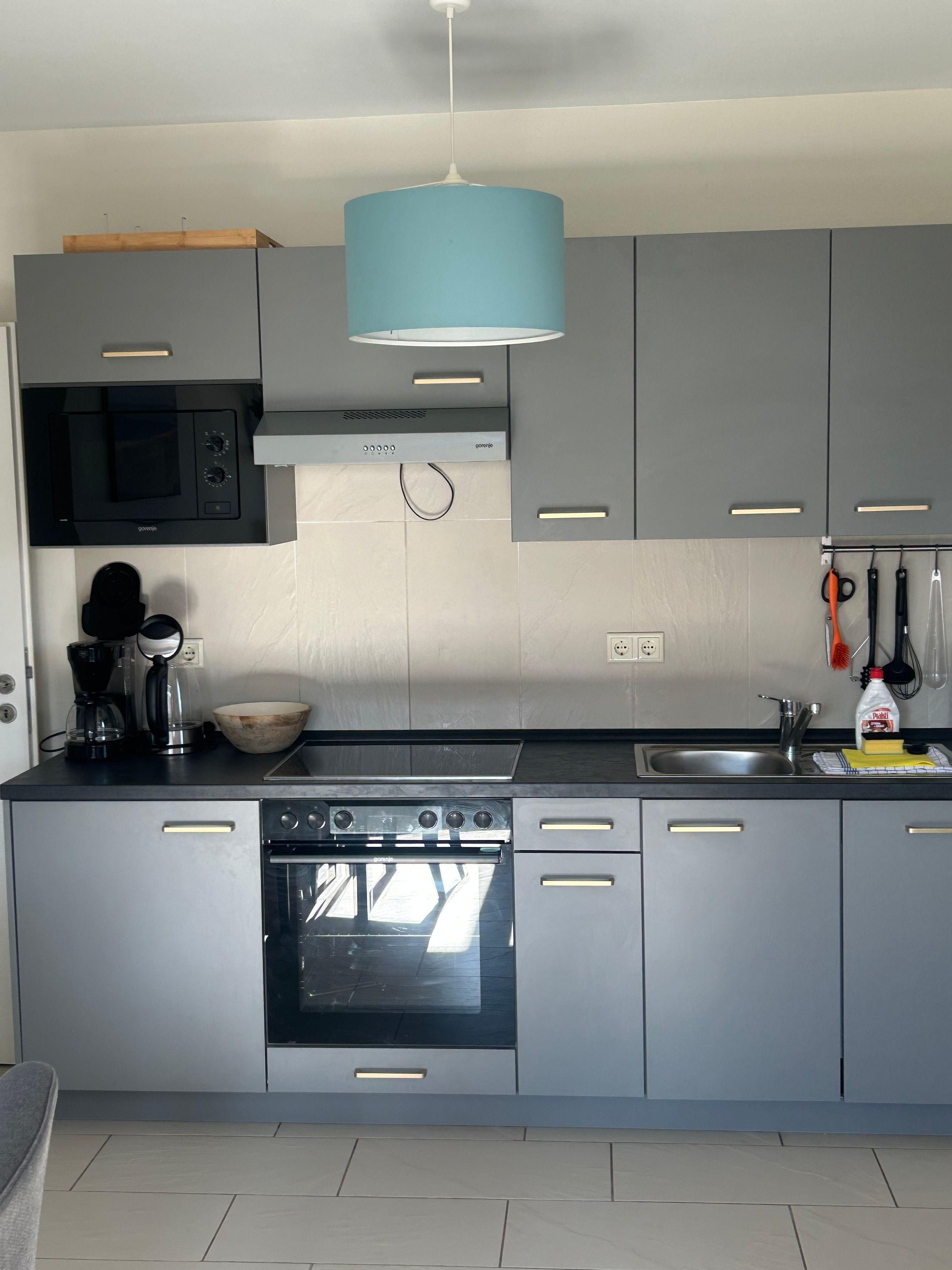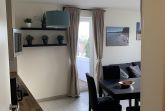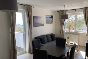 Die Ferienwohnung ist hell, modern und hochwertig eingerichtet. Im Wohnzimmer lädt eine gemütliche Couch dazu ein, den Blick nach draußen schweifen zu lassen und zur Ruhe zu kommen. Der Essbereich bietet Platz für gemeinsame Mahlzeiten, Gespräche oder konzentriertes Arbeiten im Tageslicht. Die Küchenzeile ist gut ausgestattet und ermöglicht eine unkomplizierte Selbstversorgung während Ihres Aufenthalts.