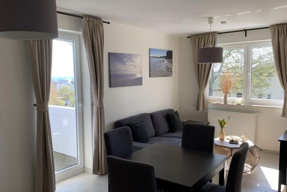 Ca. 56 qm große hochwertige FeWo Teil-Meerblick, großzüggier Balkon, 1.OG, bis zu 5 Personen, hundefreundlich, ideal für Paare und Familien, die Meer und Natur genießen möchten, 3 Zimmer , Parkplatz, Fahrradständer, 4–6 Gehminuten Strand,