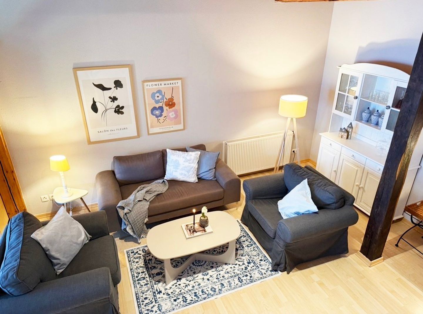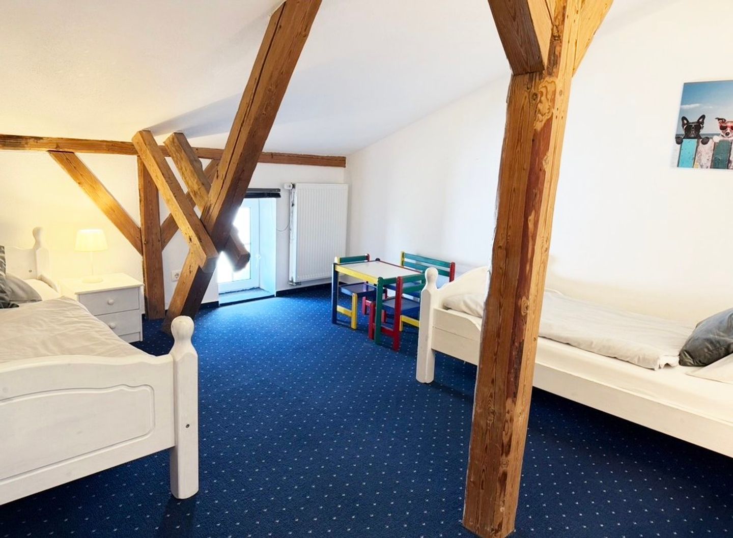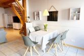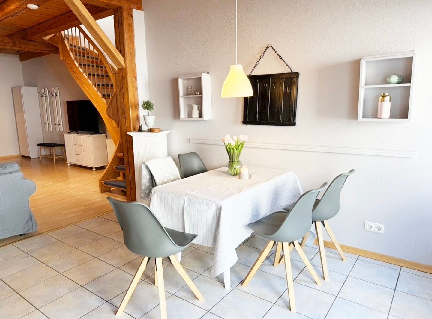 Die Ferienwohnung „Heuboden“ auf dem Nübbelhof bietet auf großzügigen 110 m² eine gelungene Kombination aus romantischem Landhausstil und komfortabler Ausstattung. Die über zwei Etagen angelegte Unterkunft ist ideal für bis zu vier Personen konzipiert und besticht durch ein gemütliches Ambiente, das durch eine Fußbodenheizung (Badezimmer und Küche) zu jeder Jahreszeit behaglich ist. Das Herzstück der Wohnung bildet das offene Wohnzimmer mit einladender Sofaecke, an das sich der Essbereich und die voll ausgestattete Küche direkt anschließen. Mit Ceranherd, Backofen, Spülmaschine und praktischen Küchenhelfern wie Mixer ist hier die Selbstversorgungsmöglichkeit garantiert. Die Schlafmöglichkeiten verteilen sich auf zwei separate Schlafzimmer, während ein Badezimmer mit Dusche sowie ein zusätzliches Gäste-WC für ausreichend Komfort sorgen. Ein Schlafzimmer verfügt über ein Doppelbett (180x200cm) mit getrennten Matratzen und das andere Schlafzimmer über zwei Einzelbetten.