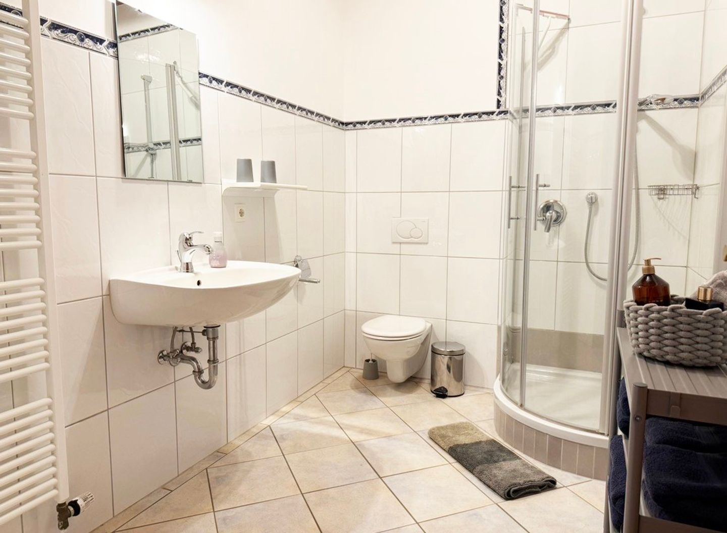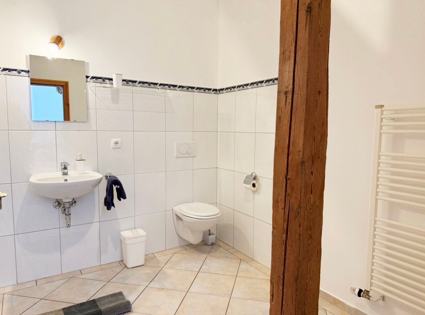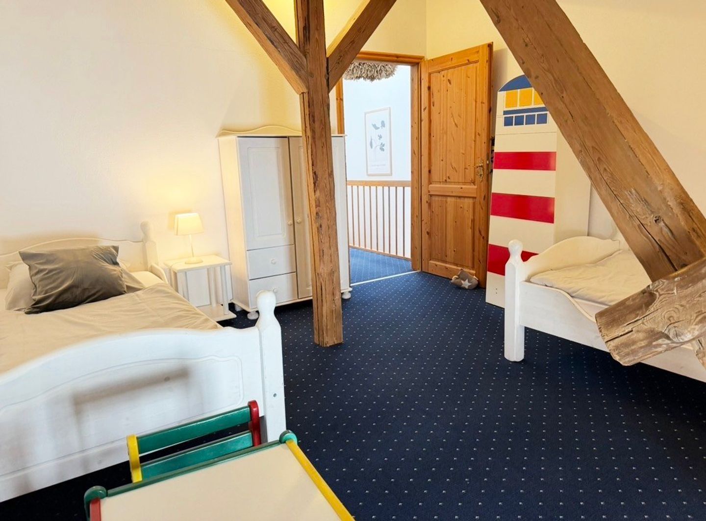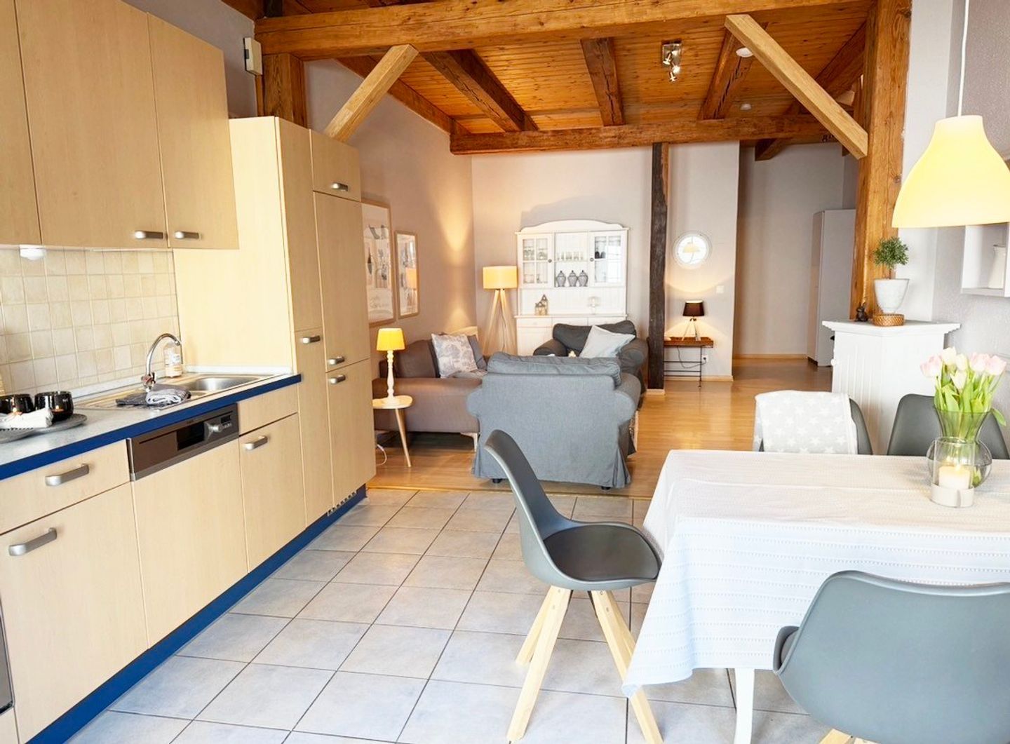 Im Außenbereich lädt eine gemütliche Terrasse mit Gartenmöbeln und ein gemeinschaftlich genutzter Garten inklusive Strandkorb (Gemeinschaftsnutzung) zum Entspannen an der frischen Luft ein. Für gesellige Abende steht zudem ein Grillplatz zur Verfügung. Besonders familienfreundlich zeigt sich das Objekt durch die Bereitstellung von Babybett, Kinderhochstuhl, Treppengittern und Sandkasten sowie einem gemeinschaftlichen Spielplatz mit Trampolin auf dem Hofgelände. Auch Reisende mit Haustieren finden hier ein passendes Quartier, da bis zu zwei Hunde in der Wohnung gestattet sind. Fliegengitter an den Fenstern (außer an den Veluxfenstern) und ein Sichtschutz sorgen zudem für ungestörte Privatsphäre in allen Räumen. Für Aktivurlauber steht zudem eine überdachte Abstellmöglichkeit für Fahrräder zur Verfügung, sodass mitgebrachte oder geliehene Räder sicher und trocken untergebracht werden können.