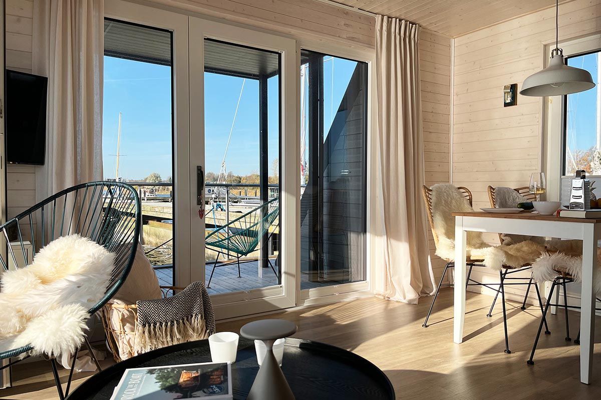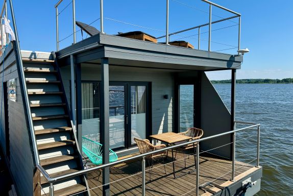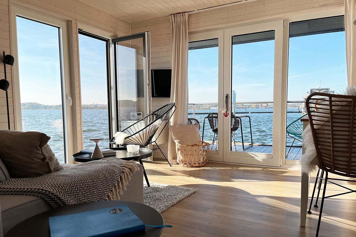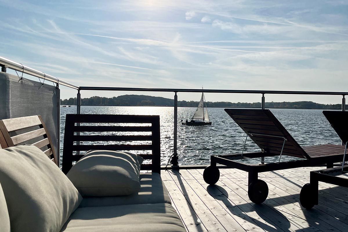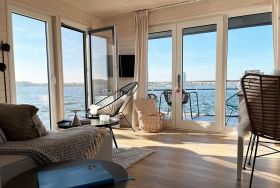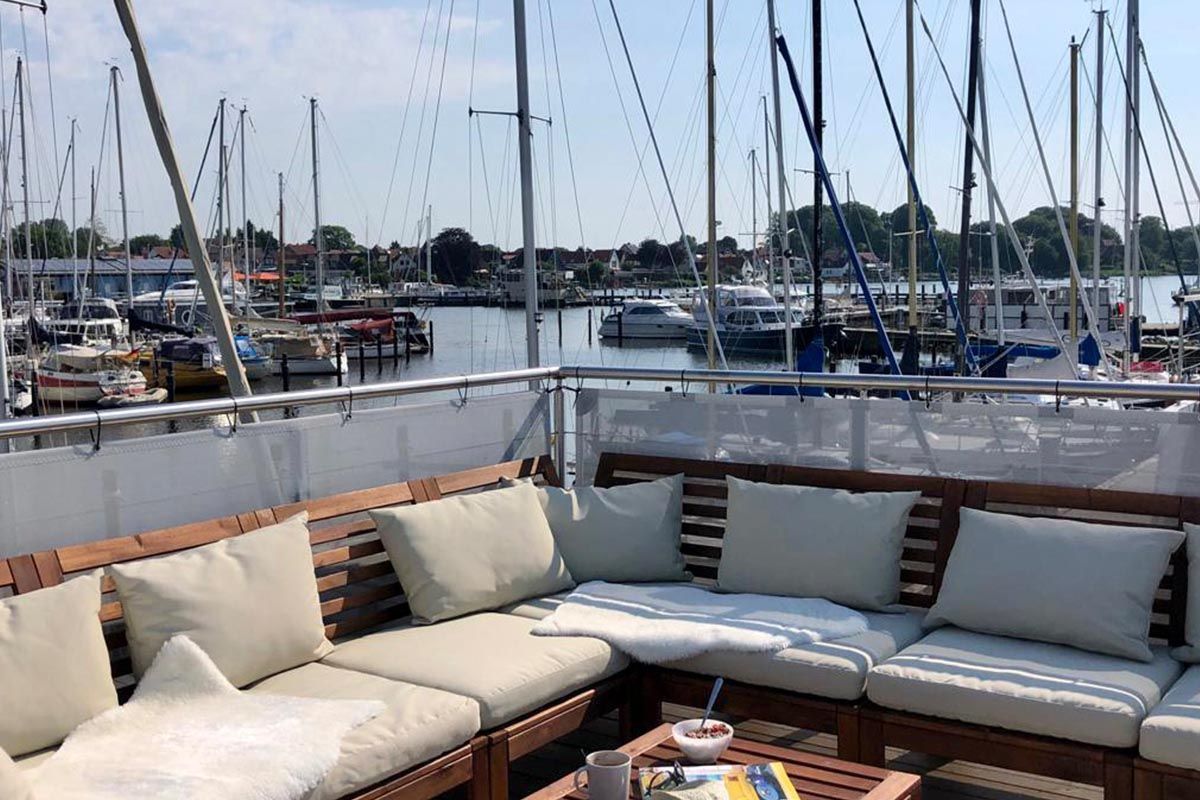 Urlaub auf dem gemütlichen Stern Hausboot bikini in der ersten Reihe auf dem Ostseefjord Schlei im Schleswiger Stadthafen bedeutet Entspannung und Erholung, Freiheit oder Abenteuer für Urlaub mit Freunden, Familien oder Paare.