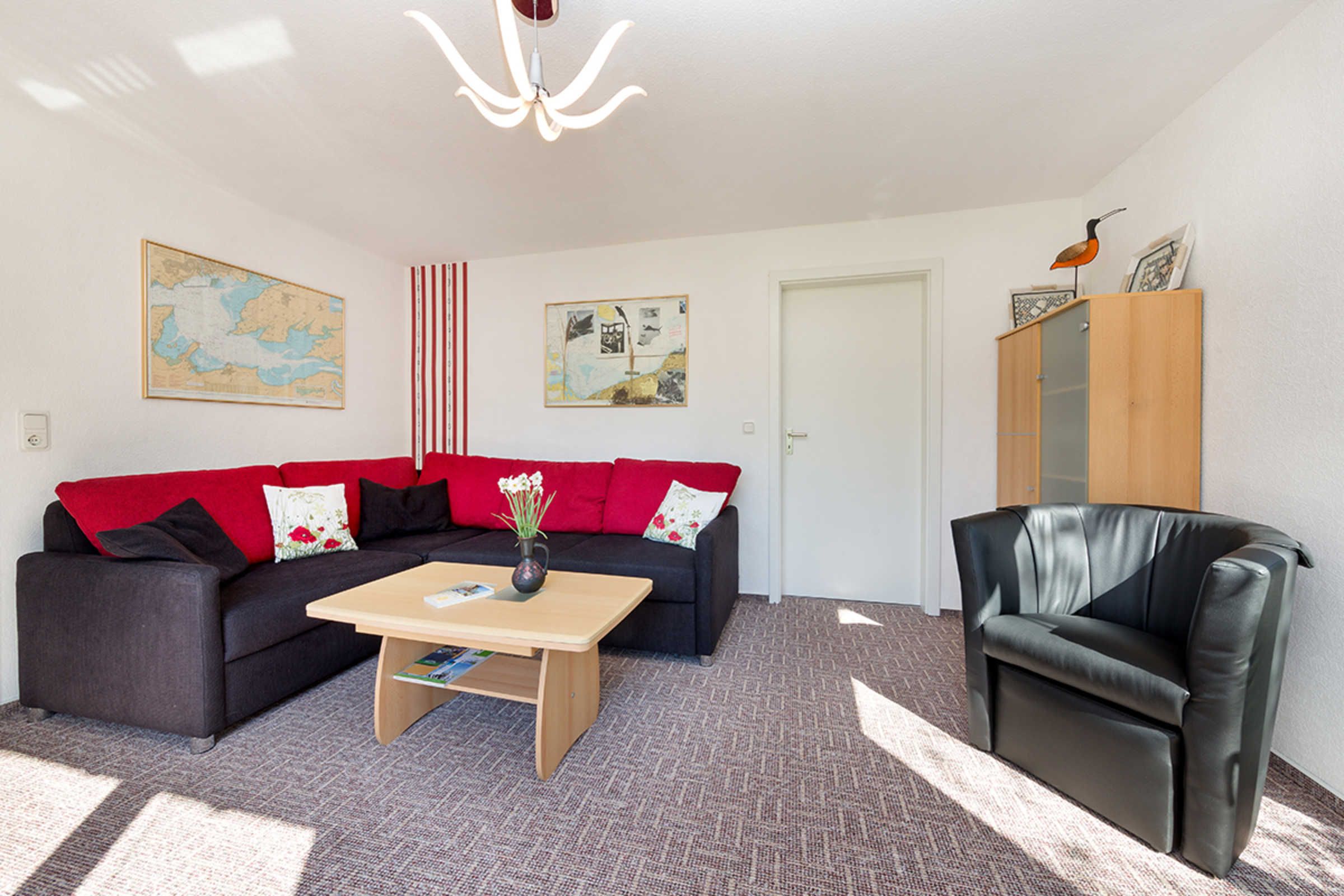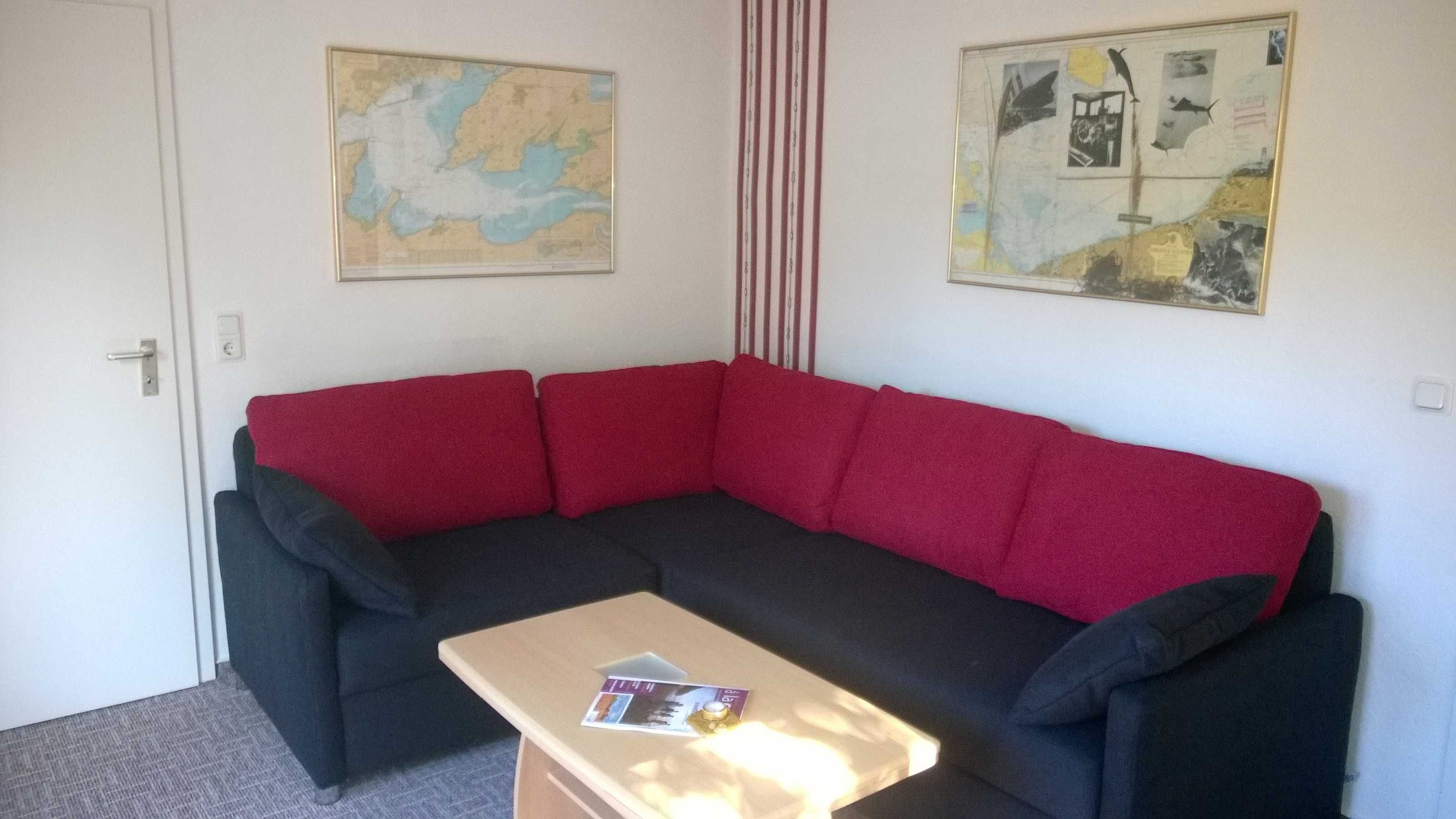 Wohnzimmer mit Flachbild-TV, DVD-/CD-Player, Radio, Tisch, Sessel, 2 Stühl, Schlaf-Eck-Couch in Boxspringqualität (1,40 x 1,80 m);