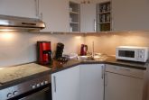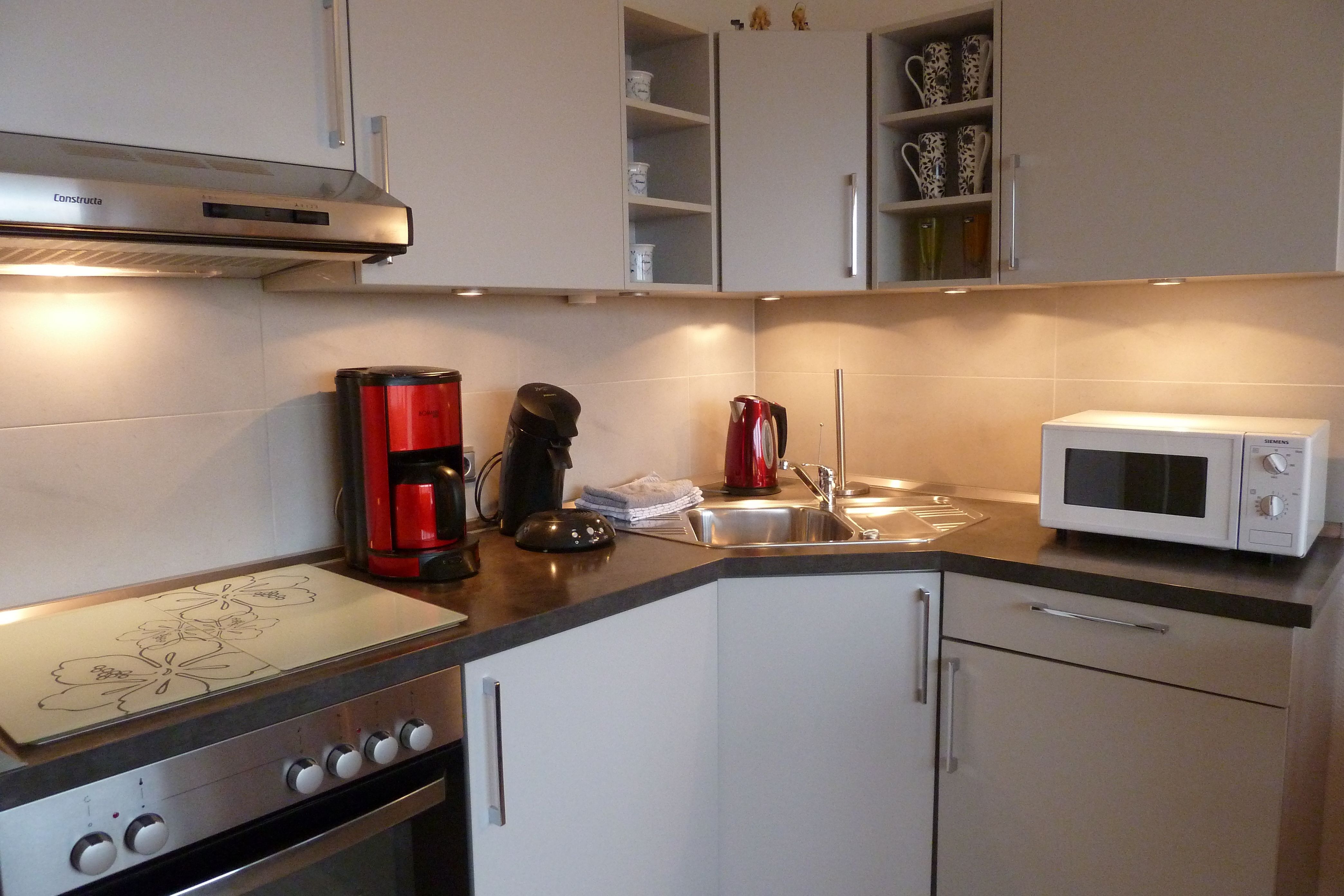 eine moderne Küchenzeile mit Kühlschrank, Wasserkocher, Pad-Maschine,