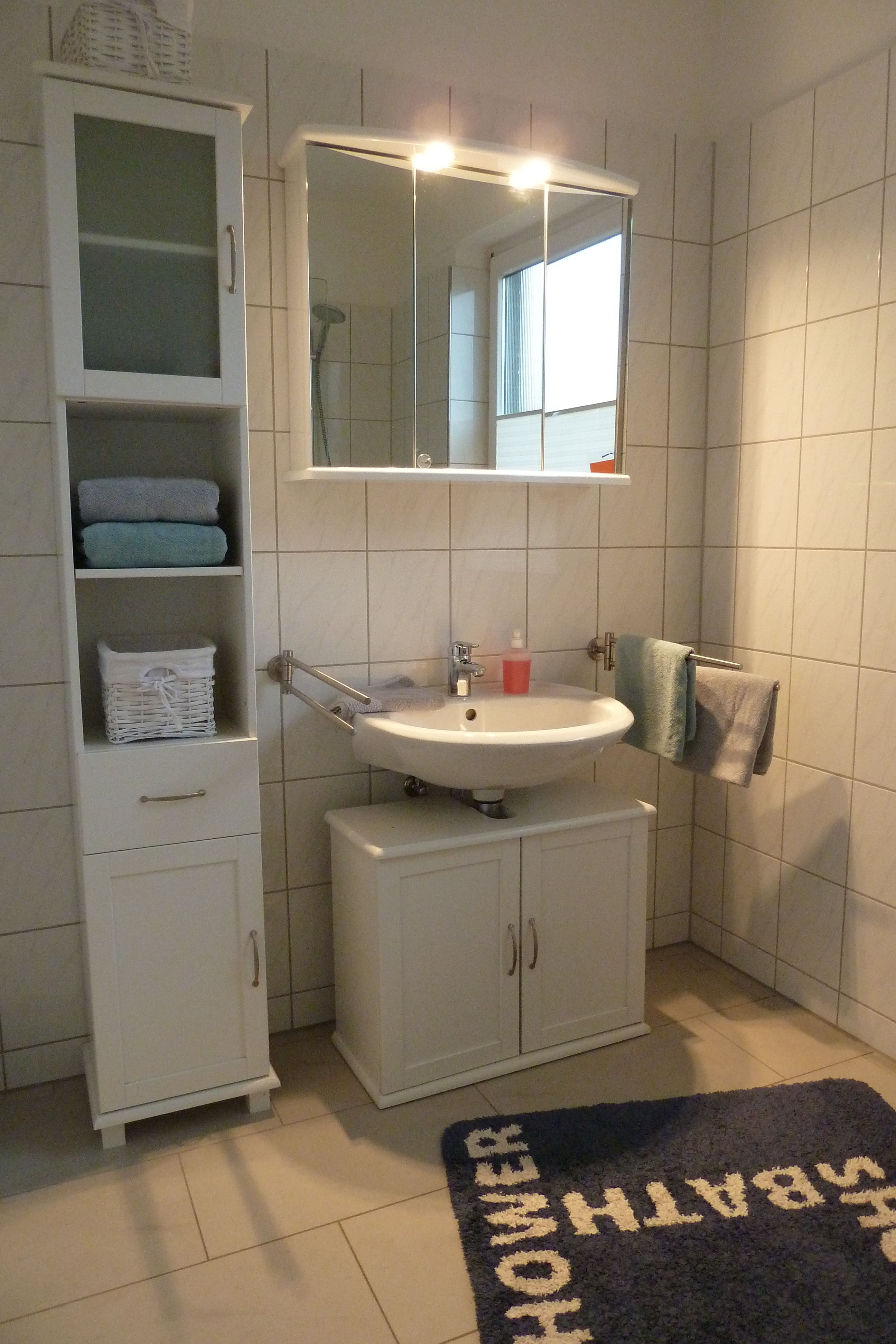 ein helles Tageslicht-Bad mit Dusche und viel Platz für Ihre Utensilien (Föhn vorhanden)