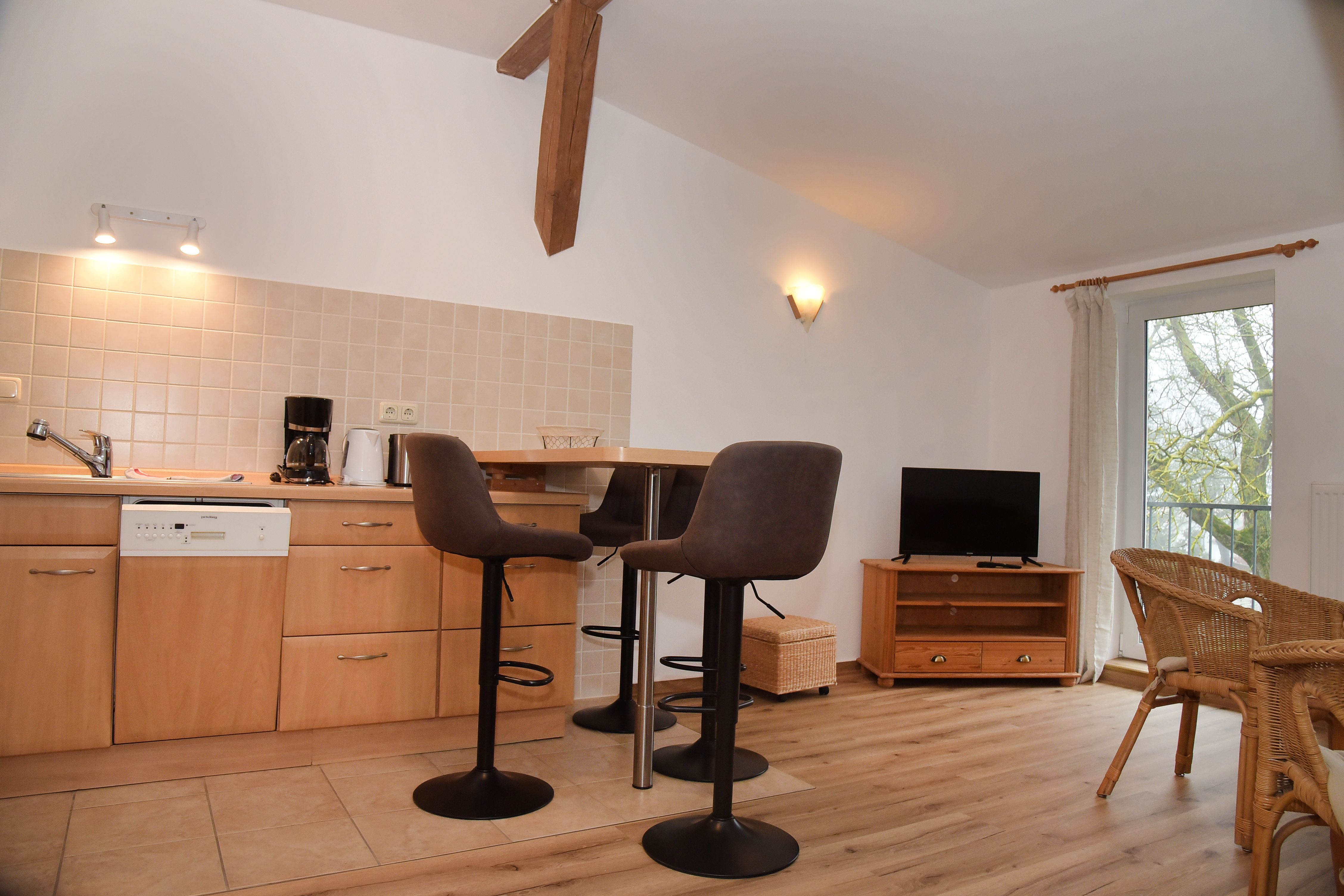 De, Wasserkocher, Toastie gemütliche 3-Raum-Nichtraucher-Ferienwohnung Heuboden 5 befindet sich im 1. Obergeschoss und ist ca. 55 m² groß. Im Wohnzimmer befindet sich ein gemütliches Sofa, ein Tresen mit vier Stühlen, der als Essbereich genutzt wird und eine kleine offene Küchenzeile. Die Küchenzeile ist mit einem 2-Platten-Herd, Kühlschrank, Spülmaschiner und Kaffeemaschine ausgestattet. Das Badezimmer verfügt über eine Dusche und einen Haartrockner.
