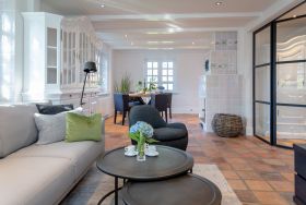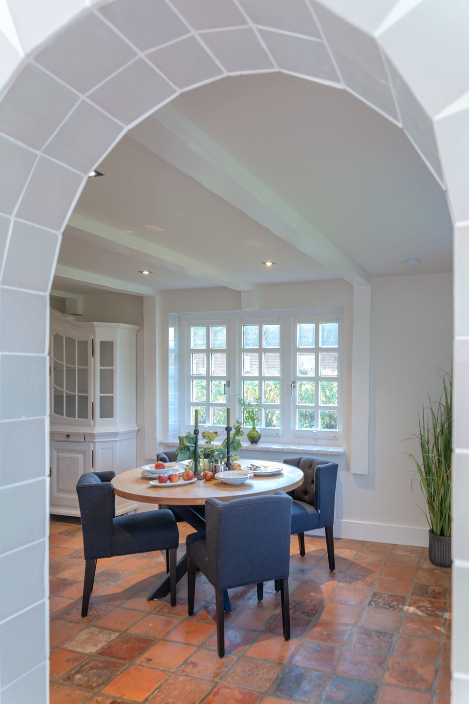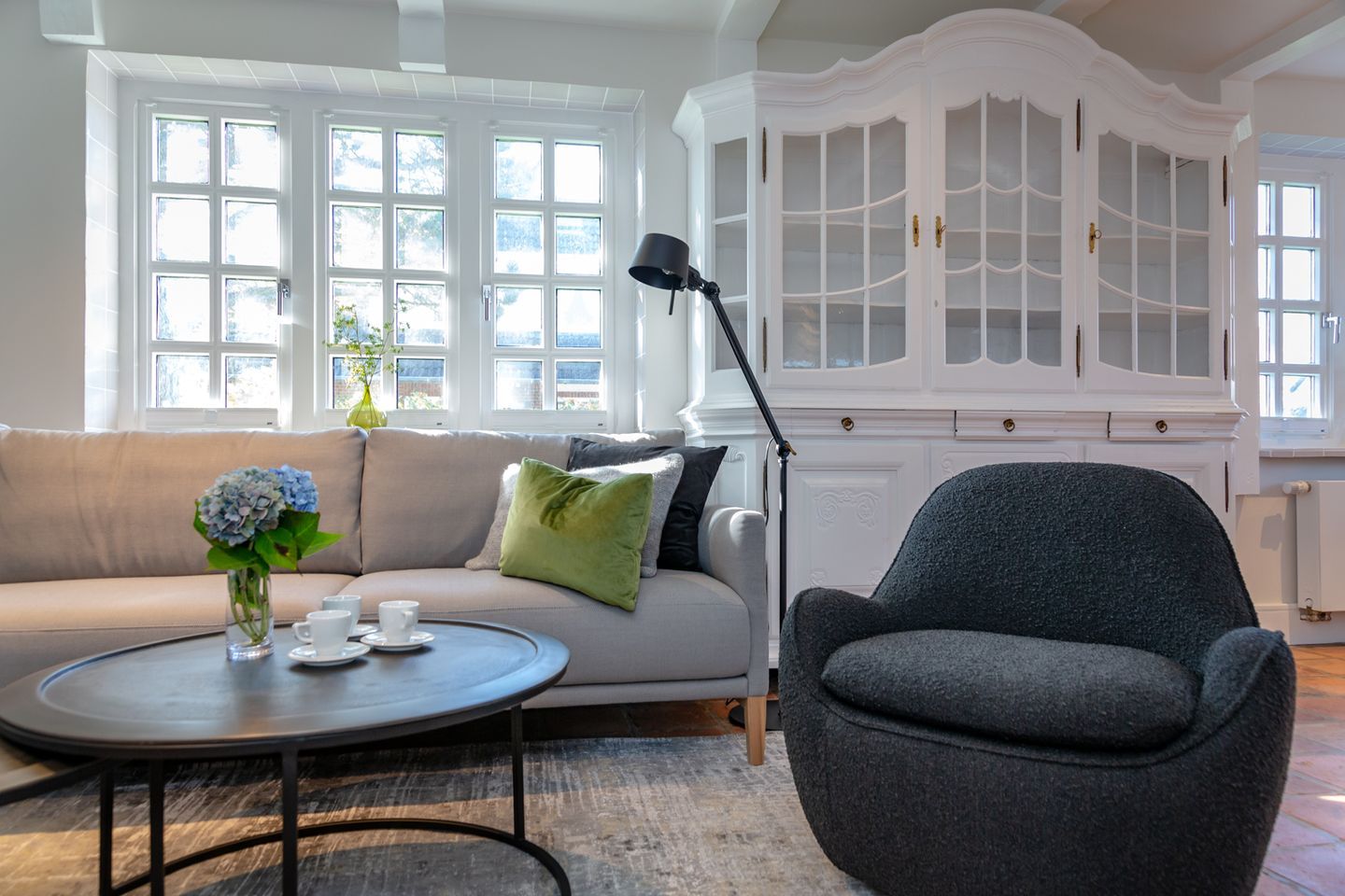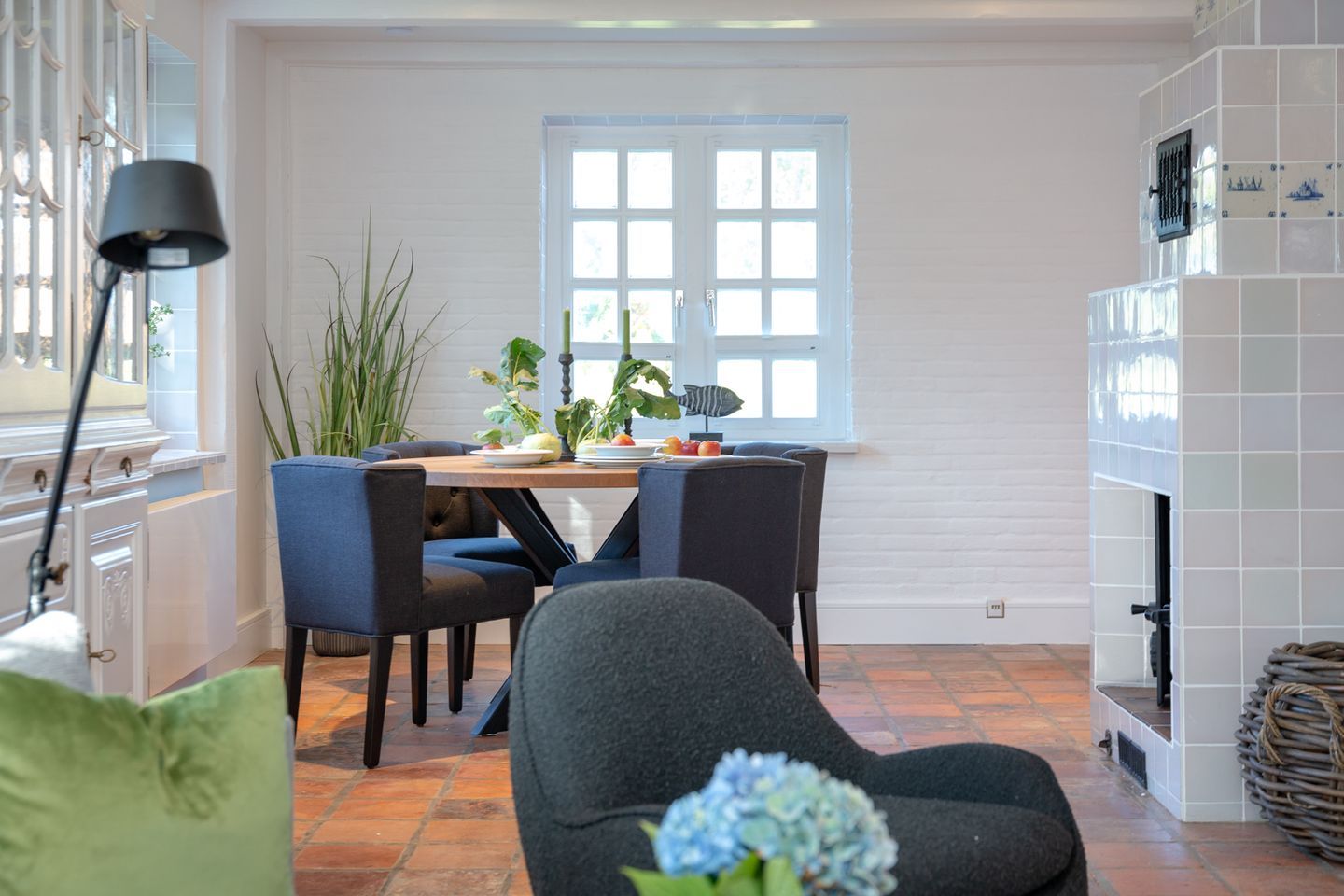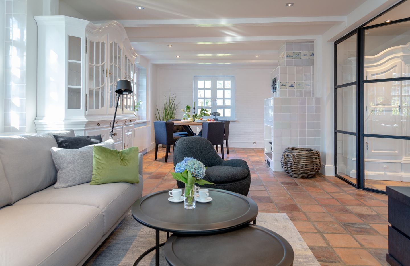 Das Herzstück bildet der großzügige, offen gestaltete Wohn- und Essbereich. Große Sprossenfenster lassen viel Tageslicht herein und verleihen dem Raum eine warme, einladende Stimmung. Die komfortable Sofaecke lädt zu entspannten Abenden ein, während der Essbereich mit Blick in den Garten den perfekten Rahmen für gemeinsame Stunden bietet. Der Kaminbereich sorgt dabei für eine besonders gemütliche Atmosphäre, der Kamin selbst steht jedoch nicht zur Nutzung zur Verfügung.