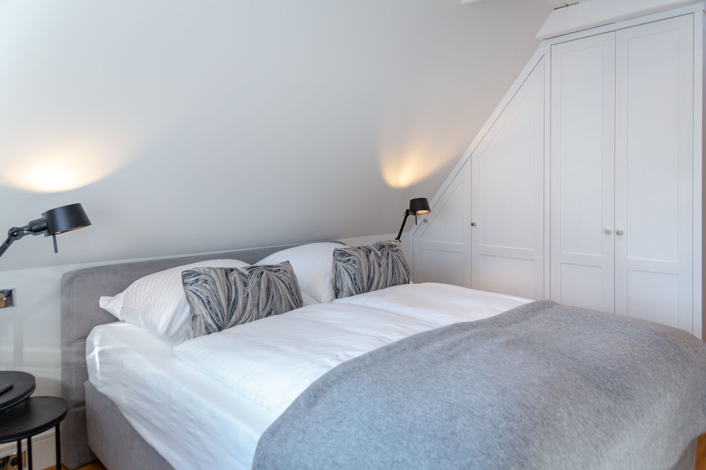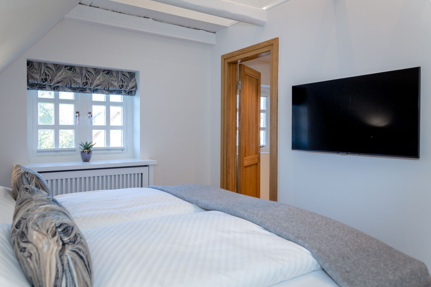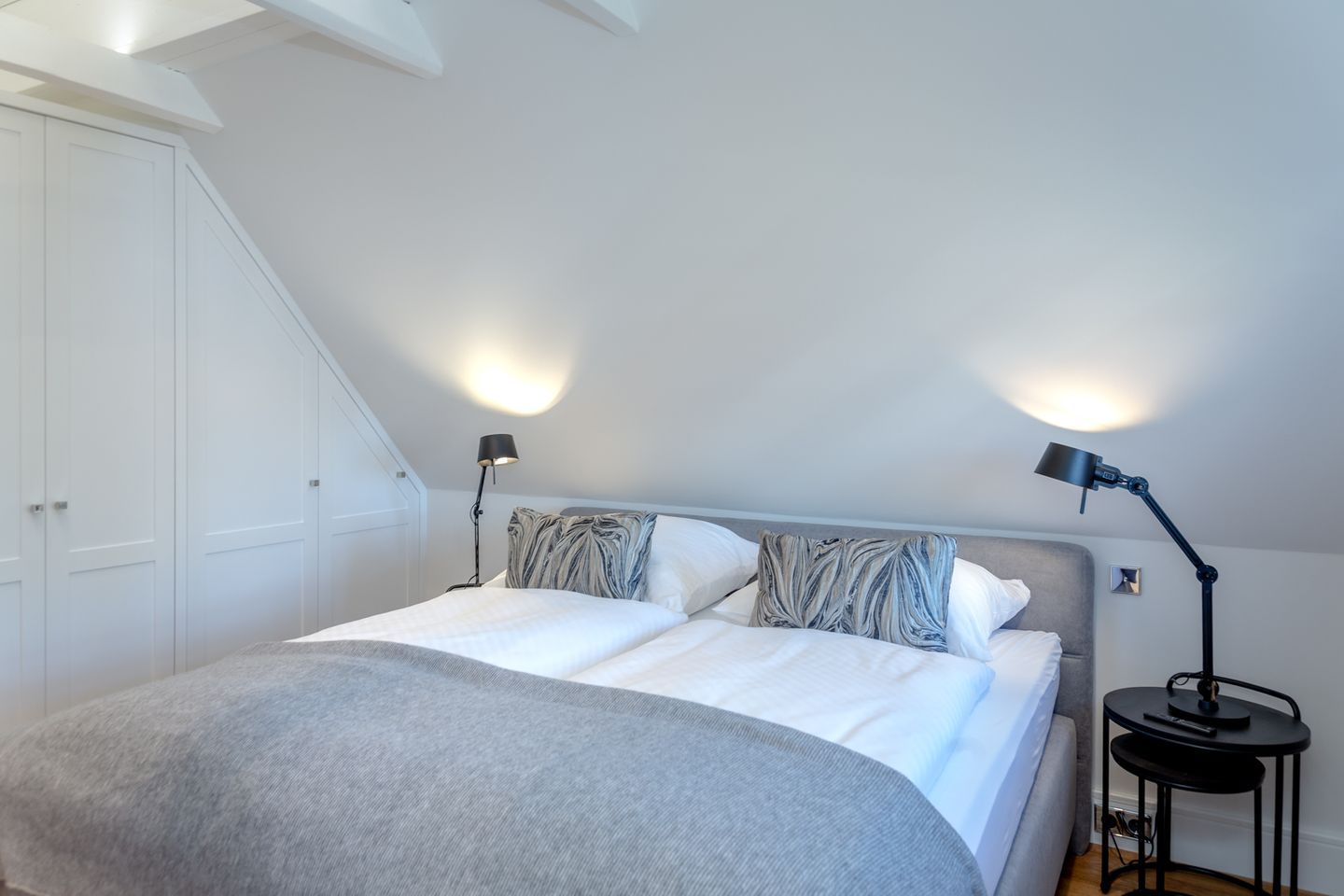 Über die Wendeltreppe gelangen Sie in das Obergeschoss, wo Sie zwei stilvolle Schlafzimmer erwarten. Beide sind mit komfortablen Doppelbetten (1,80 x 2,00 m) ausgestattet und verfügen jeweils über ein eigenes Badezimmer – eines mit Dusche, das andere mit Duschbadewanne. So genießen alle Gäste ein hohes Maß an Privatsphäre – ideal für Paare oder auch für Familien. Hochwertige Tischlereinbauten sorgen für viel Stauraum und unterstreichen den gehobenen Wohnkomfort.